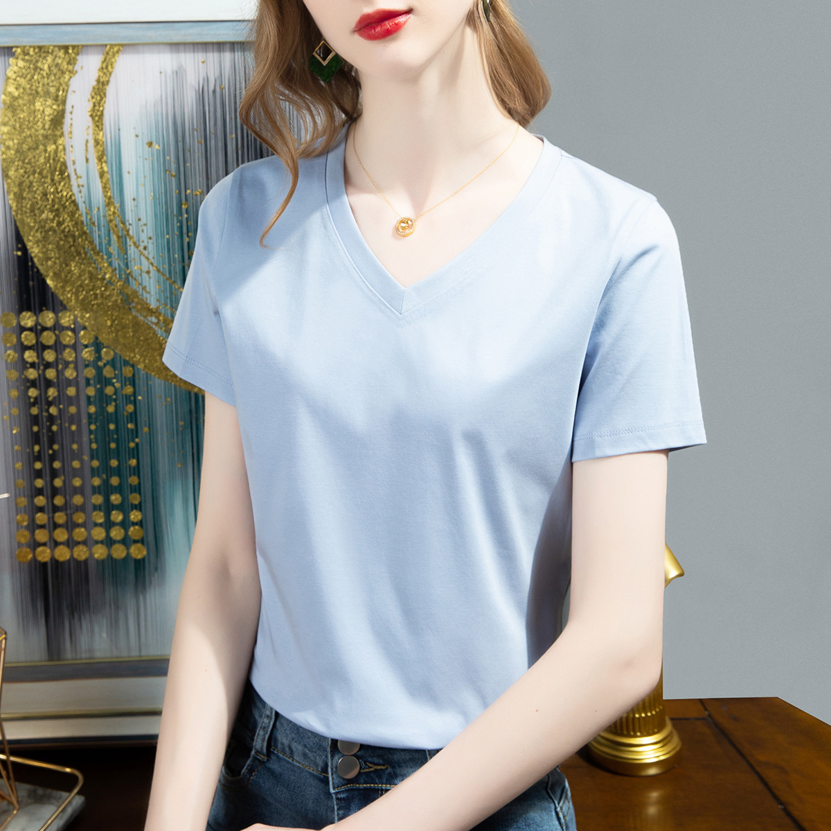 반소매 티셔츠 여성용 2025 년 여름 뉴 V 넥 티셔츠 솔리드 컬러 반소매 탑스토어 가기