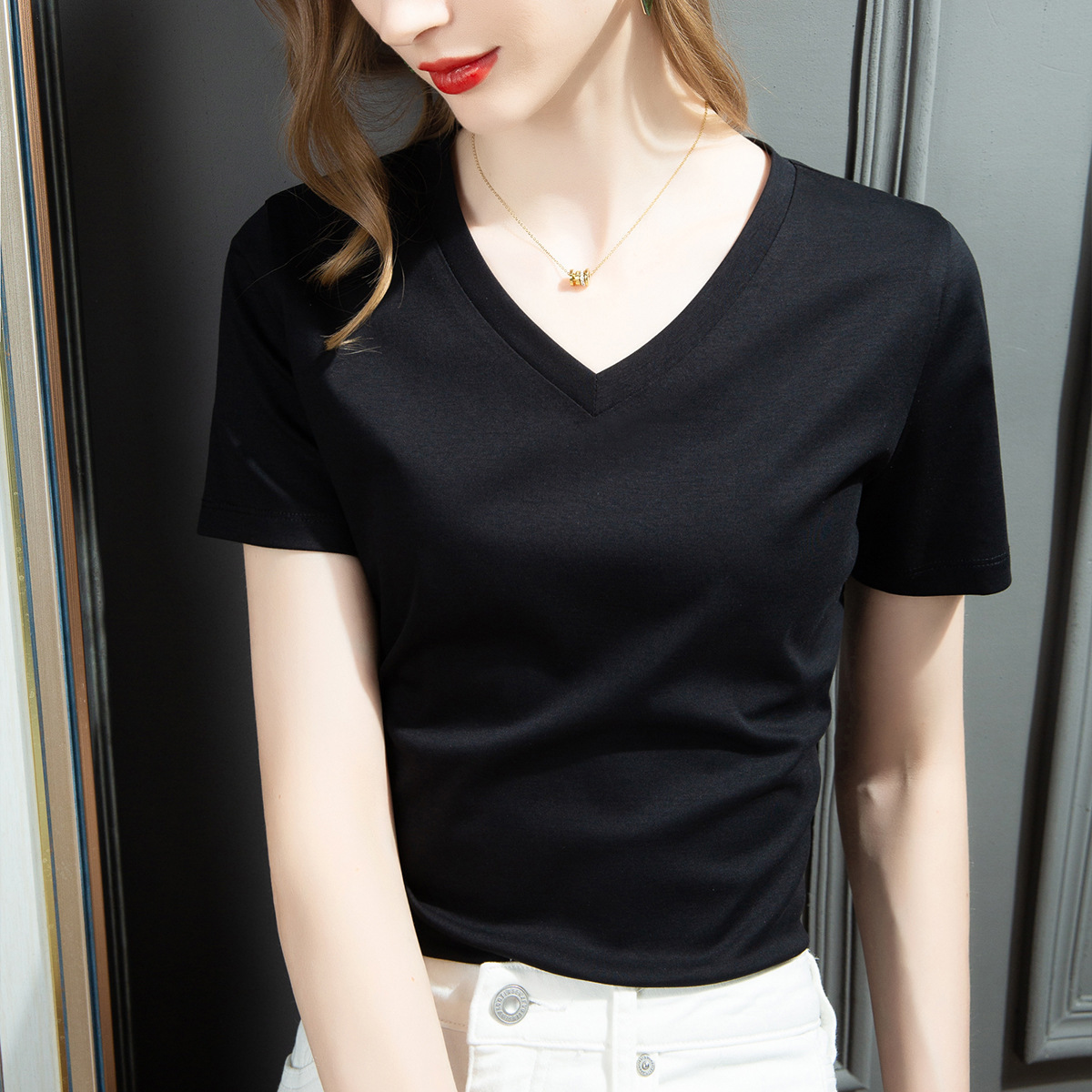 반소매 티셔츠 여성용 2025 년 여름 뉴 V 넥 티셔츠 솔리드 컬러 반소매 탑