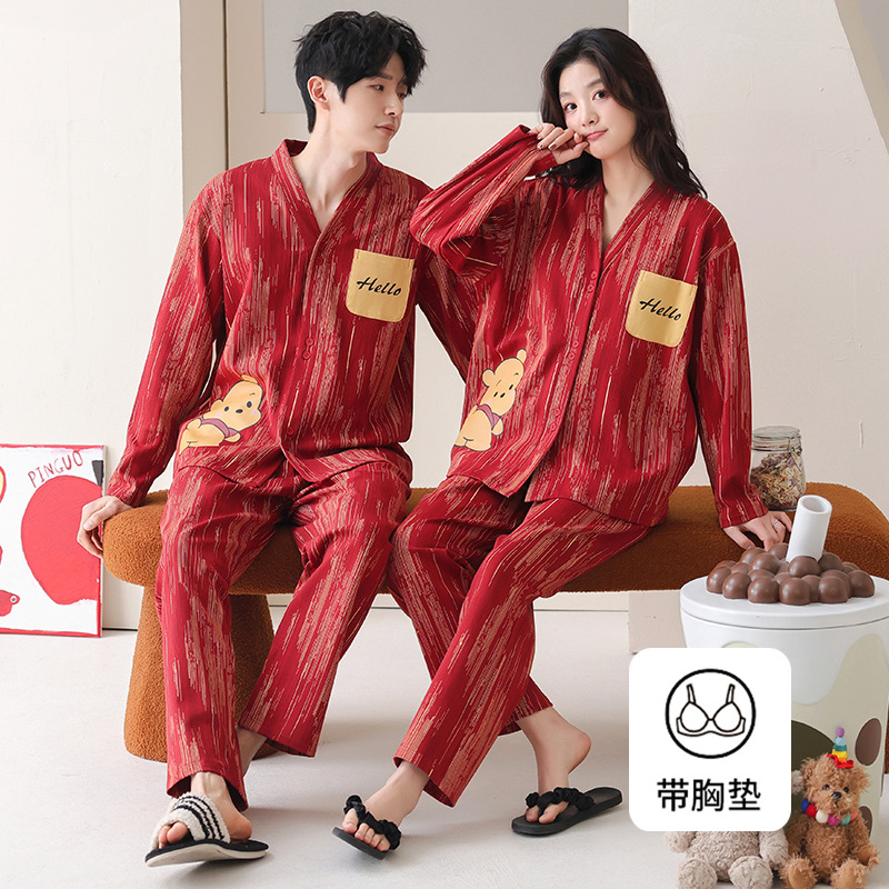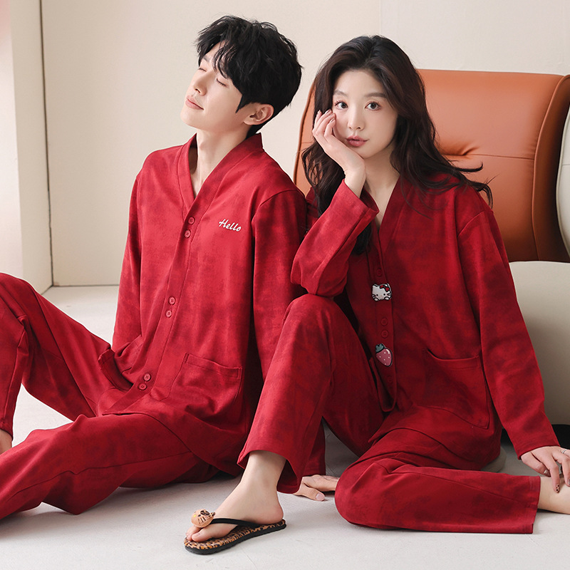 가슴 패드가있는 여성용 웨딩 커플 잠옷 봄, 가을 순수 코튼 긴팔 카디건 레드 축제 남성용 홈웨어 세트스토어 가기