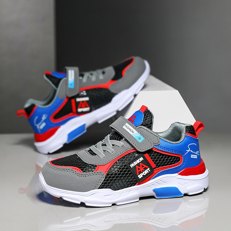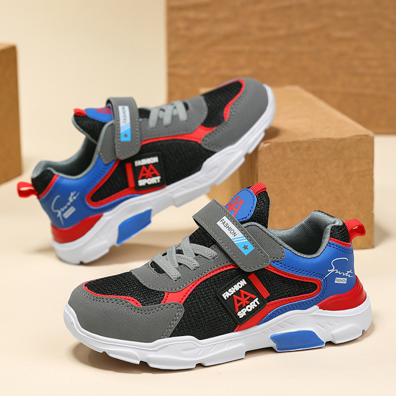 국경 간 어린이 운동화 새로운 통기성 메쉬 가죽 국수 중형 및 대형 어린이 달리기 신발 경량 소년 캐주얼 트렌디 아동용 신발