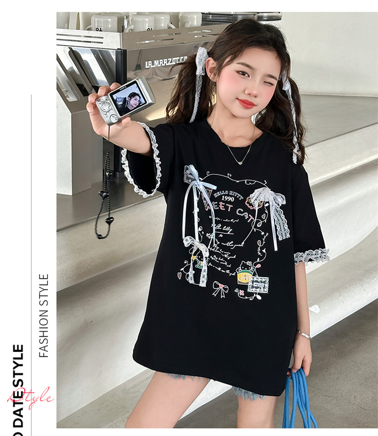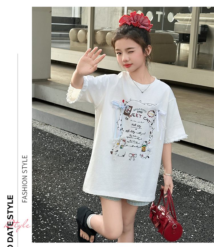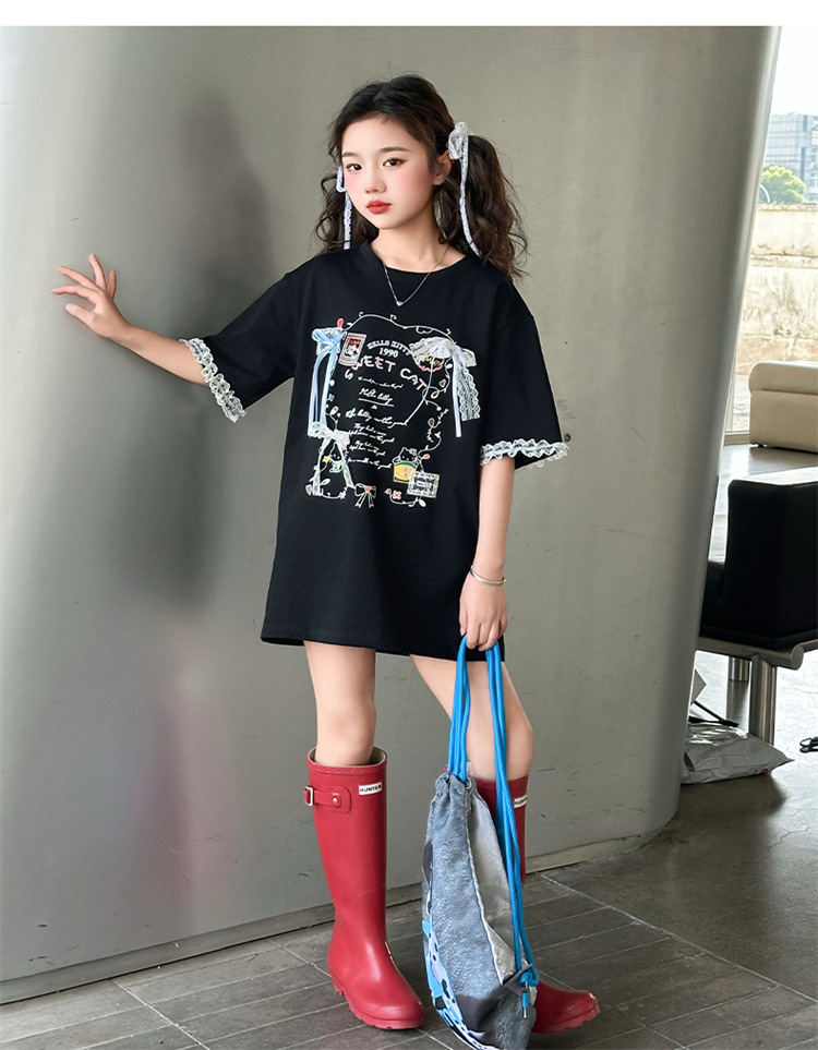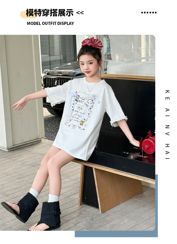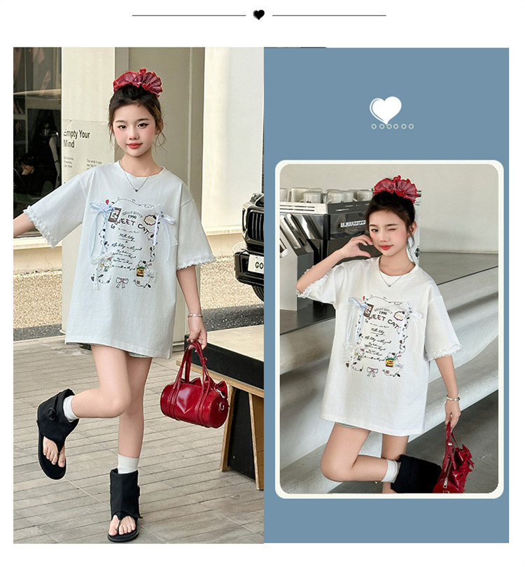 소녀 반팔 티셔츠 2025 여름 새로운 어린이 서양식 만화 편지 활 탑 큰 어린이 느슨한