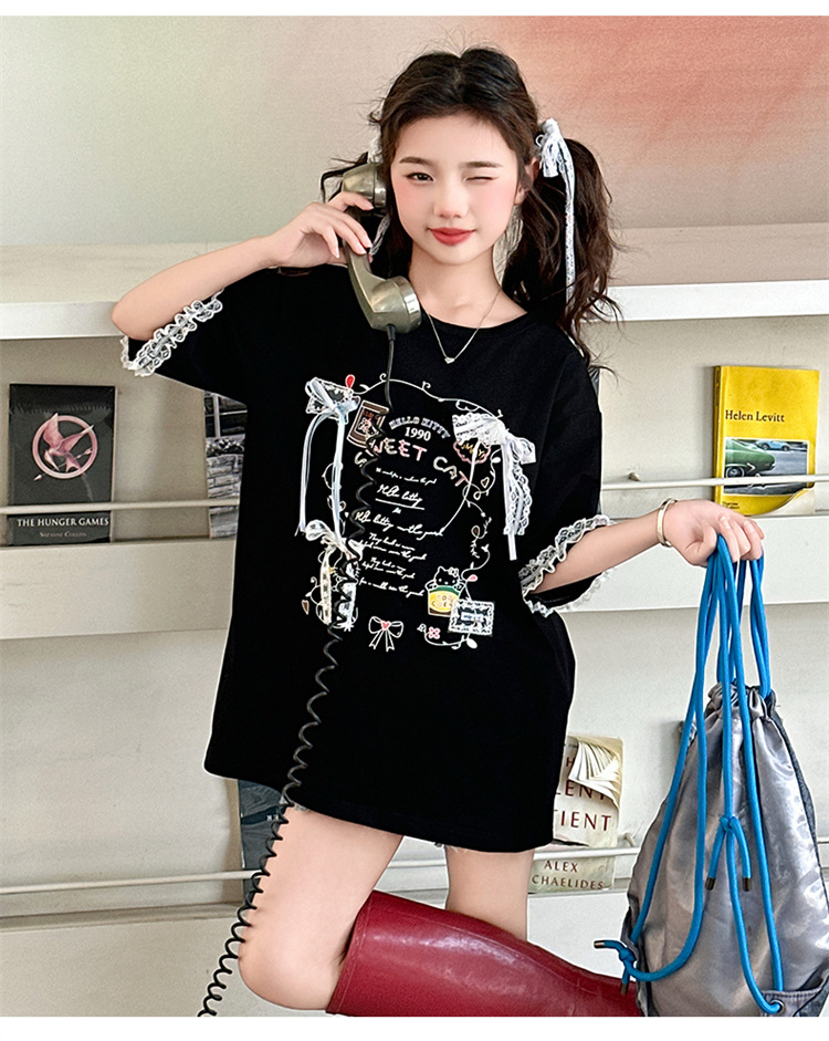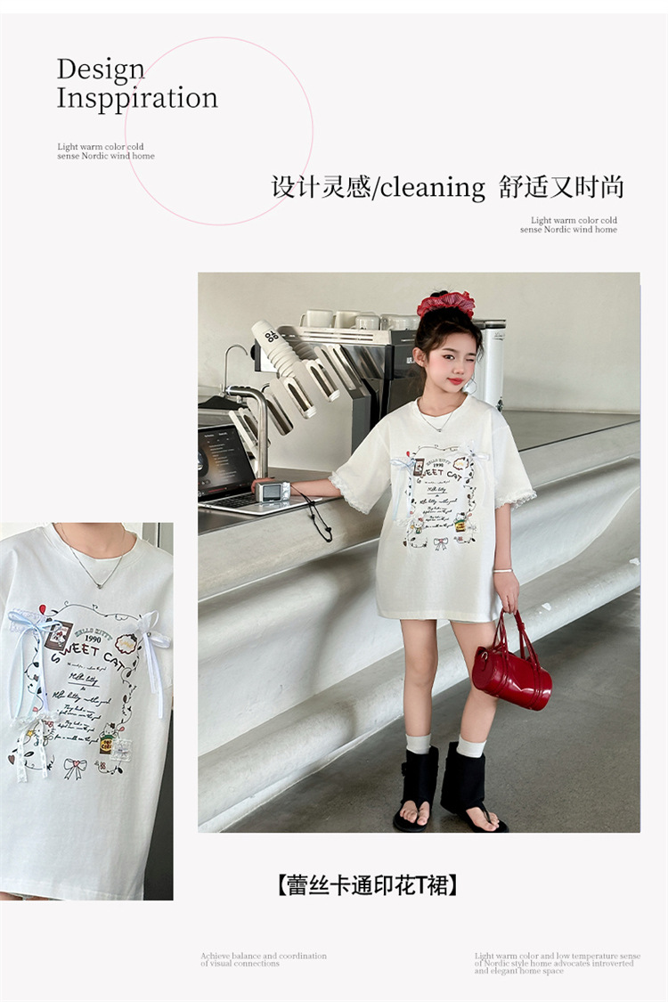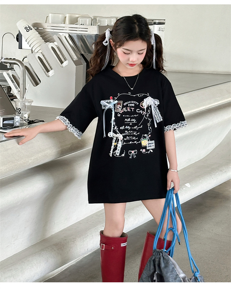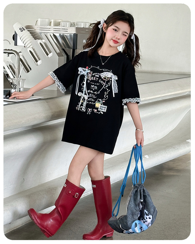 소녀 반팔 티셔츠 2025 여름 새로운 어린이 서양식 만화 편지 활 탑 큰 어린이 느슨한