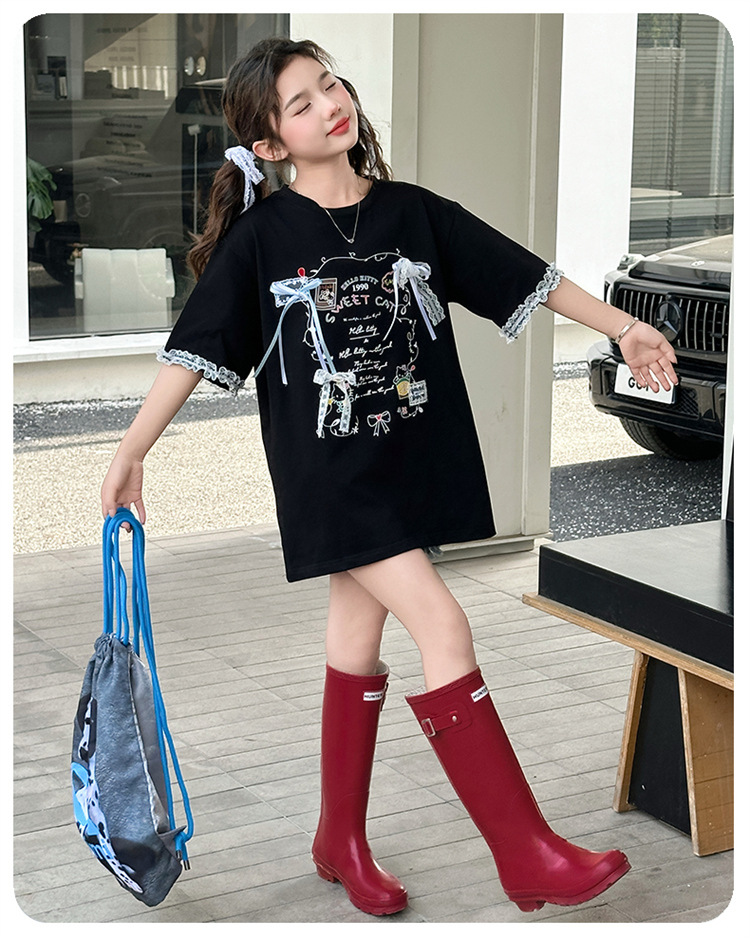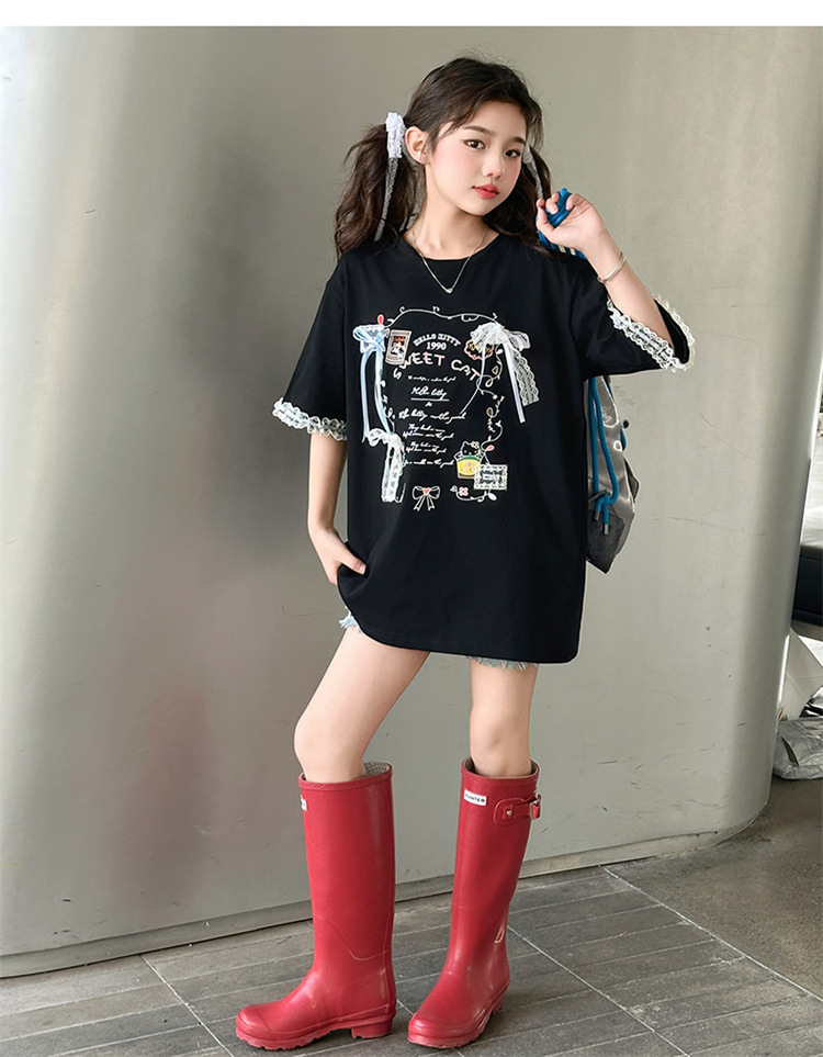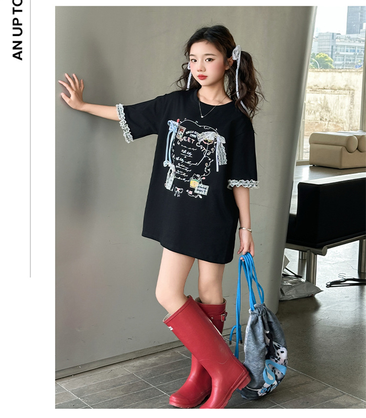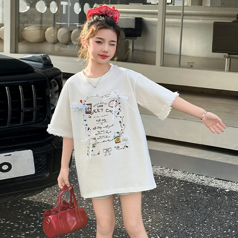 소녀 반팔 티셔츠 2025 여름 새로운 어린이 서양식 만화 편지 활 탑 큰 어린이 느슨한스토어 가기