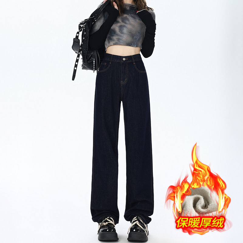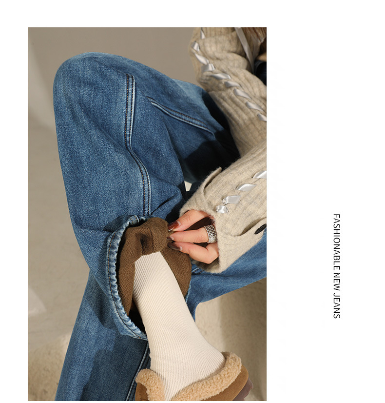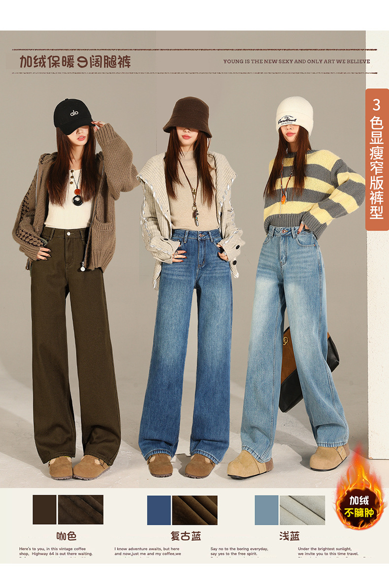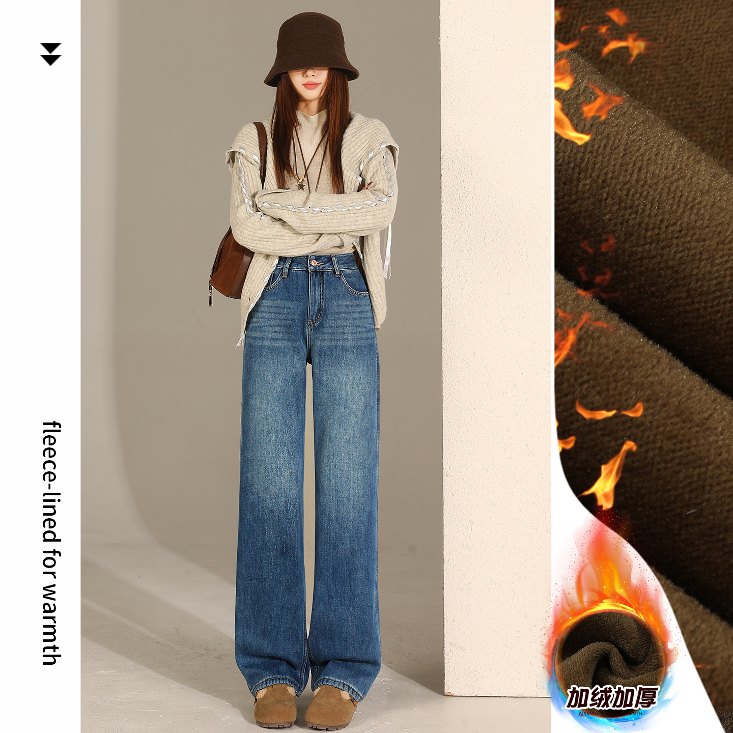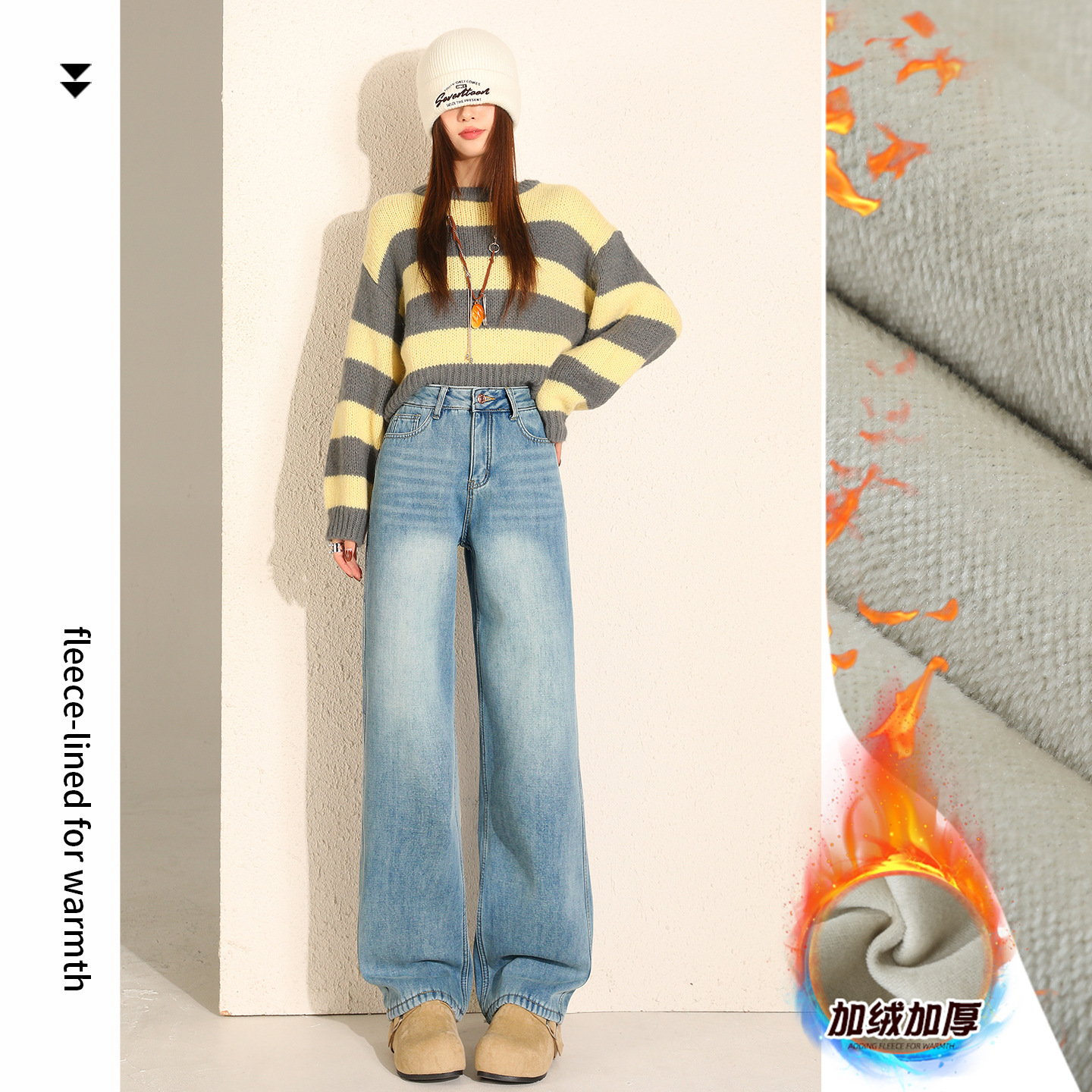 여성용 밝은 색상의 와이드 레그 청바지 2025 가을 겨울용 기모 안감 두꺼운 다용도 하이웨이스트 루즈핏 슬림 스트레이트 롱 팬츠스토어 가기