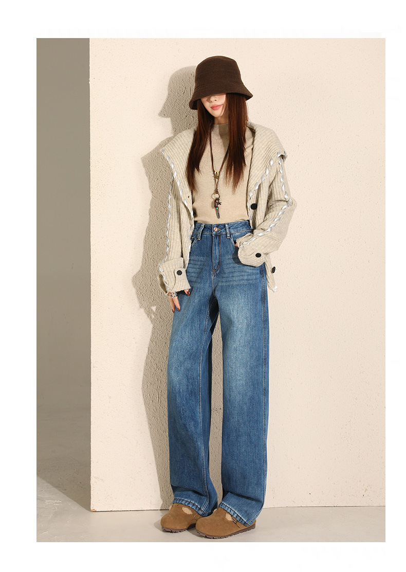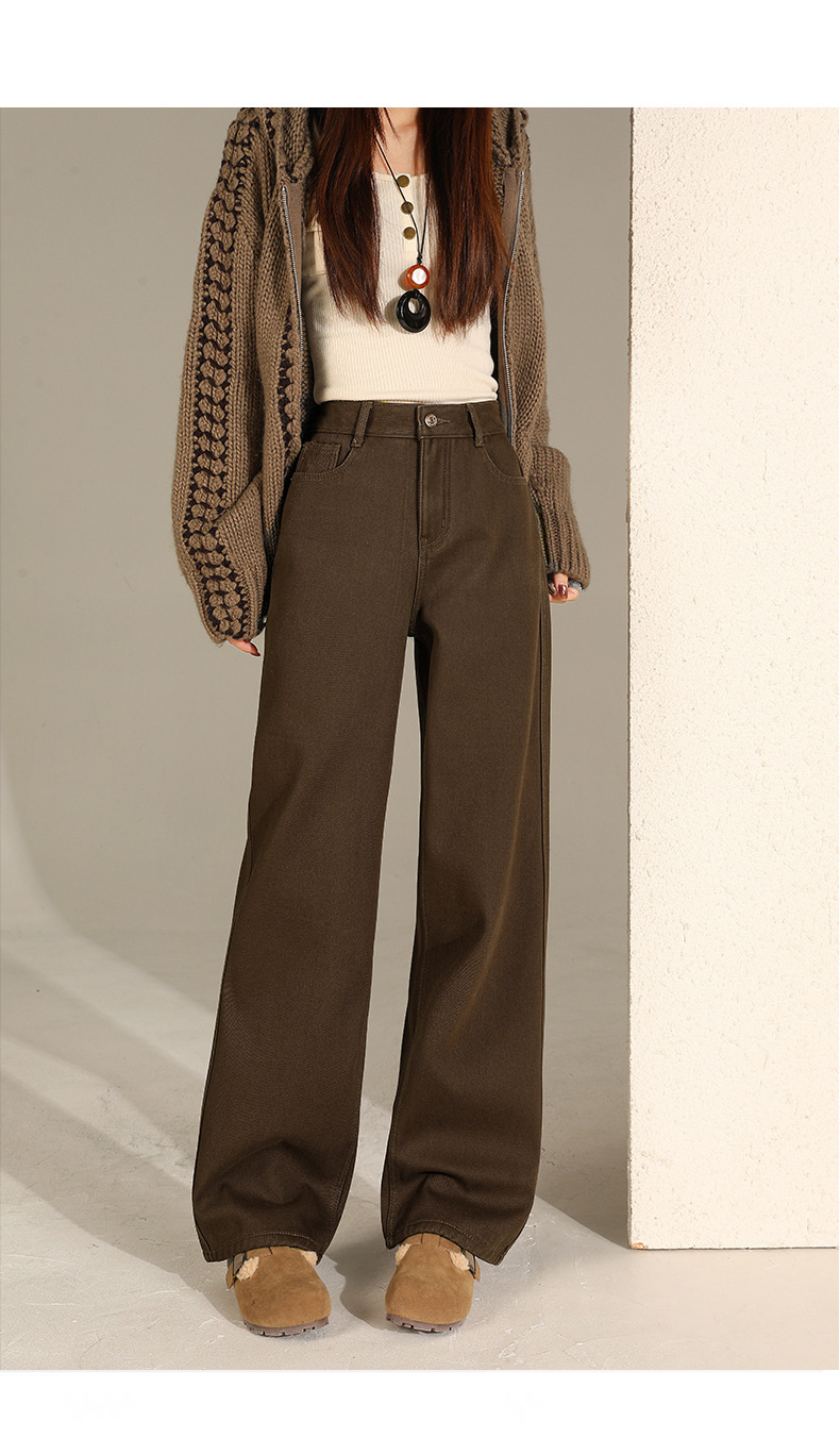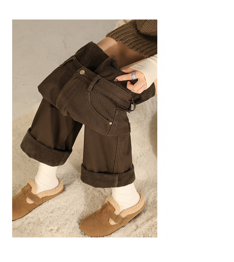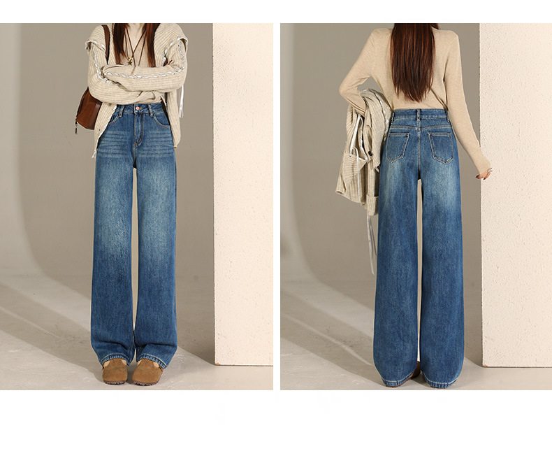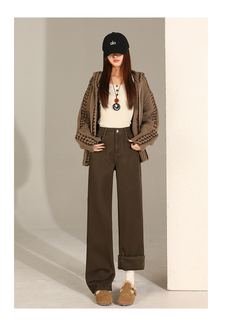여성용 밝은 색상의 와이드 레그 청바지 2025 가을 겨울용 기모 안감 두꺼운 다용도 하이웨이스트 루즈핏 슬림 스트레이트 롱 팬츠스토어 가기