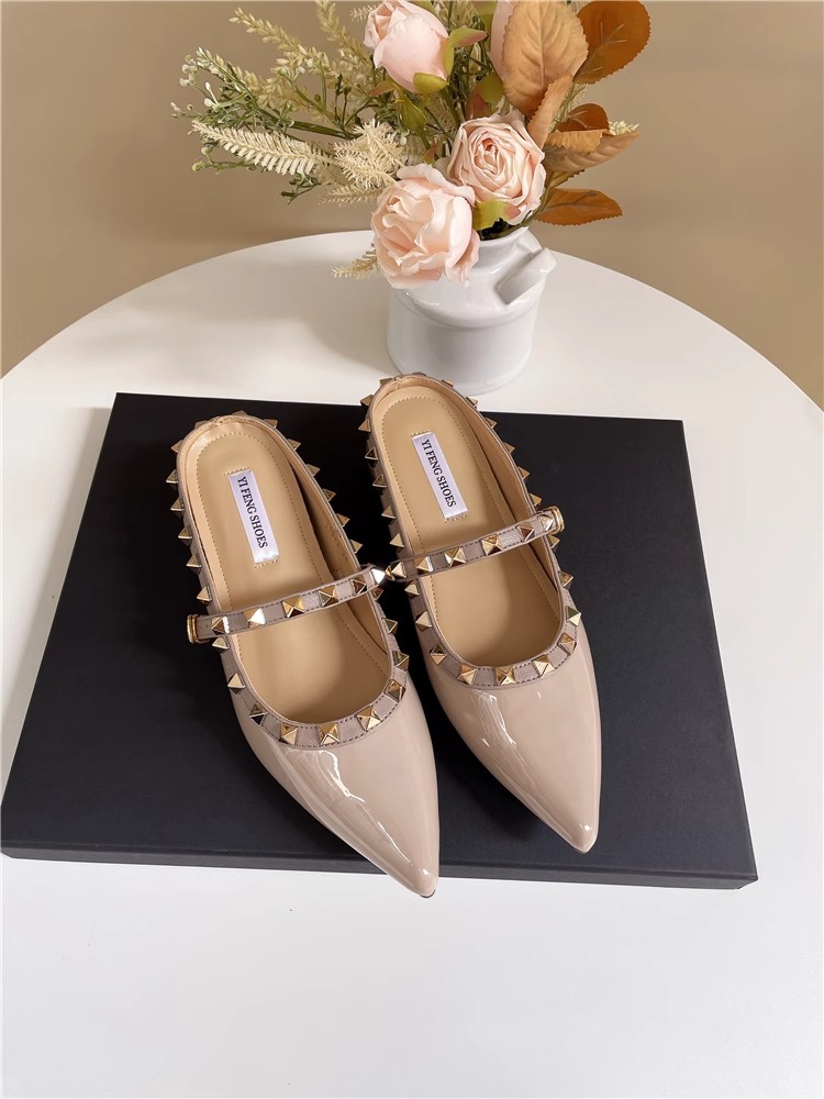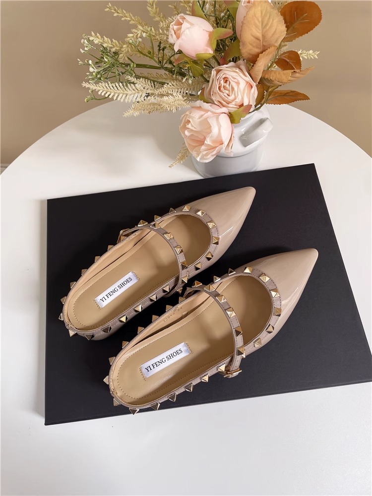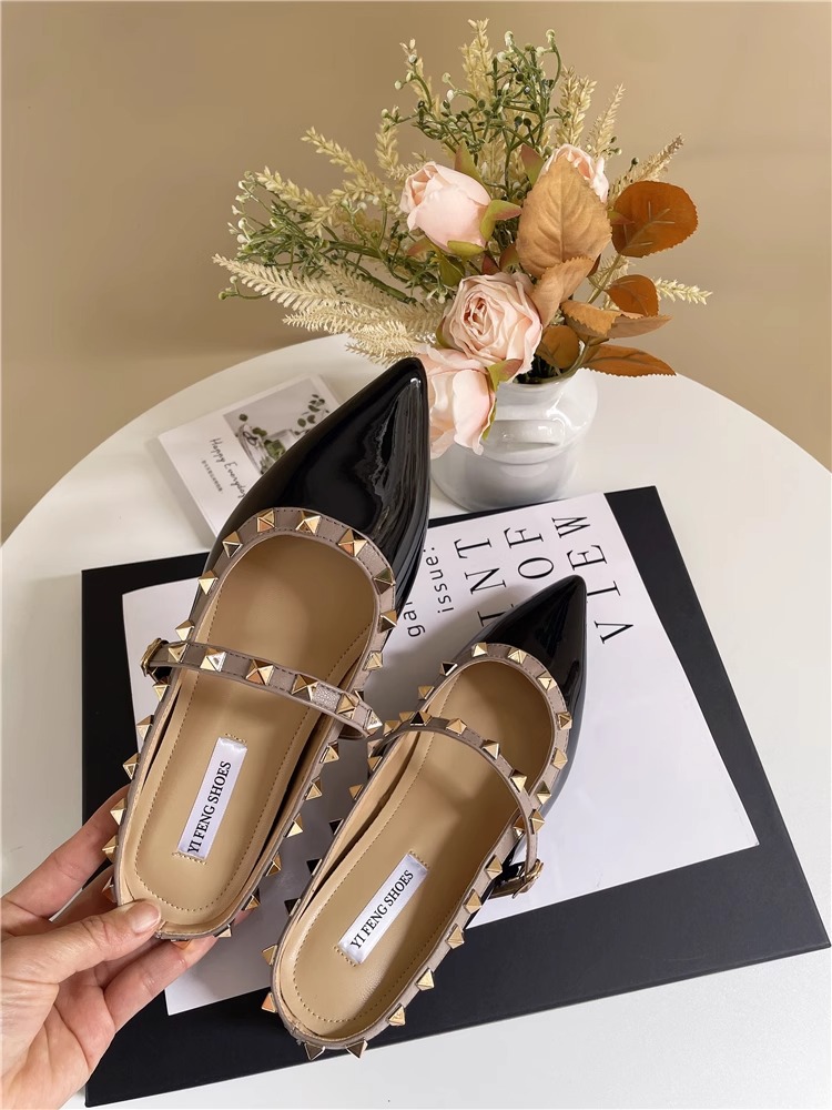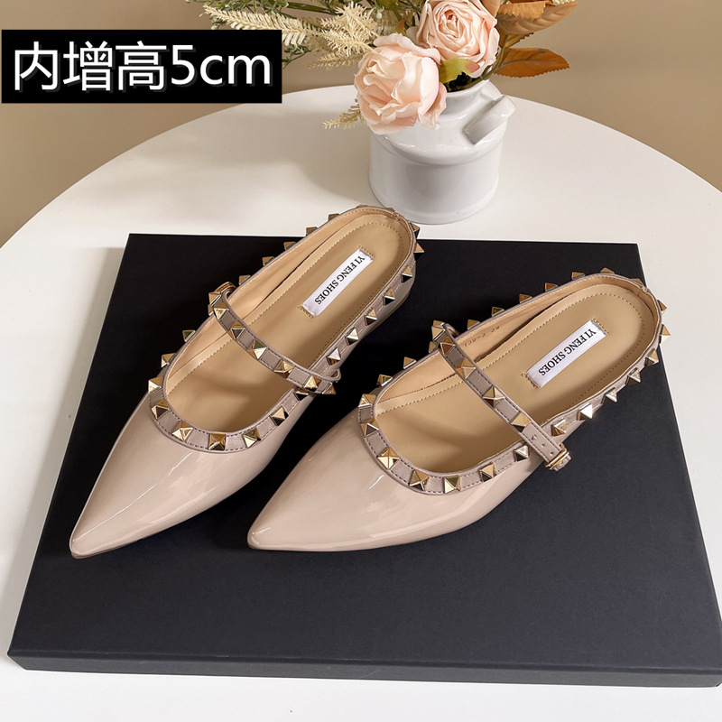 Mary Jane Baotou 샌들 작은 높이 올리는 프랑스 뾰족한 발가락 얕은 리벳 플랫 하프 톤 신발