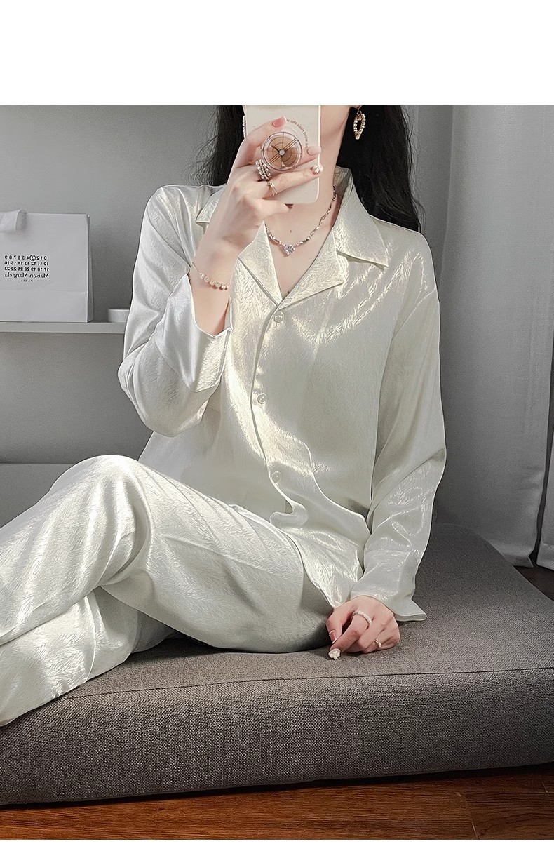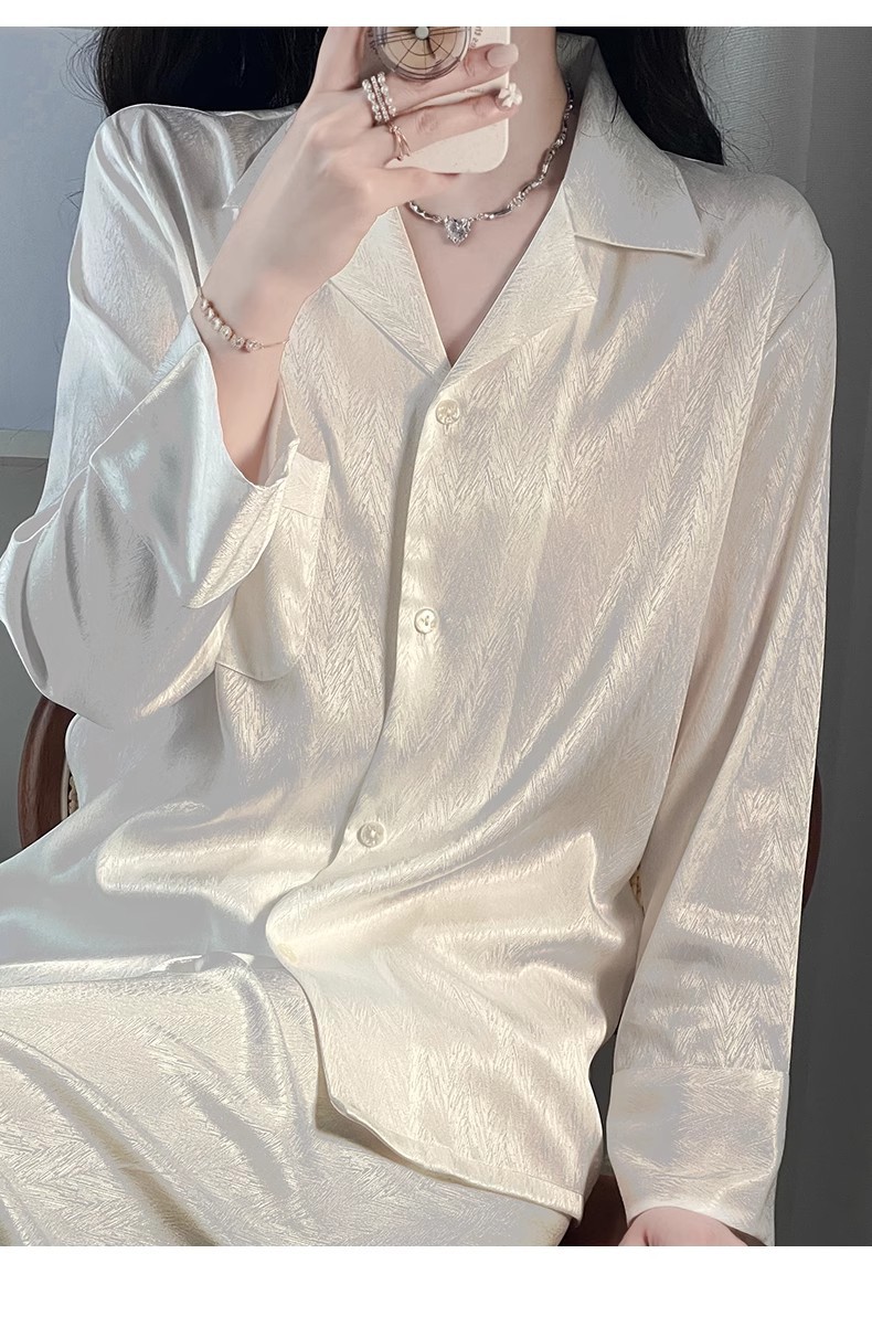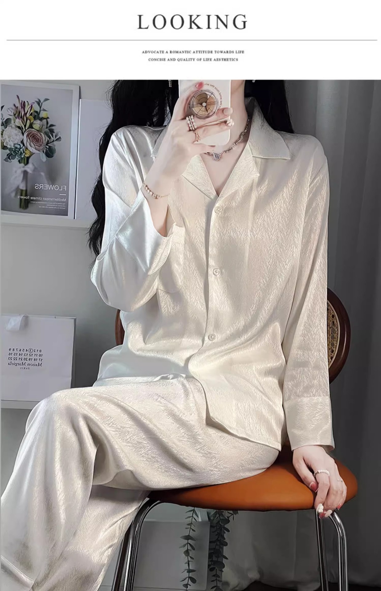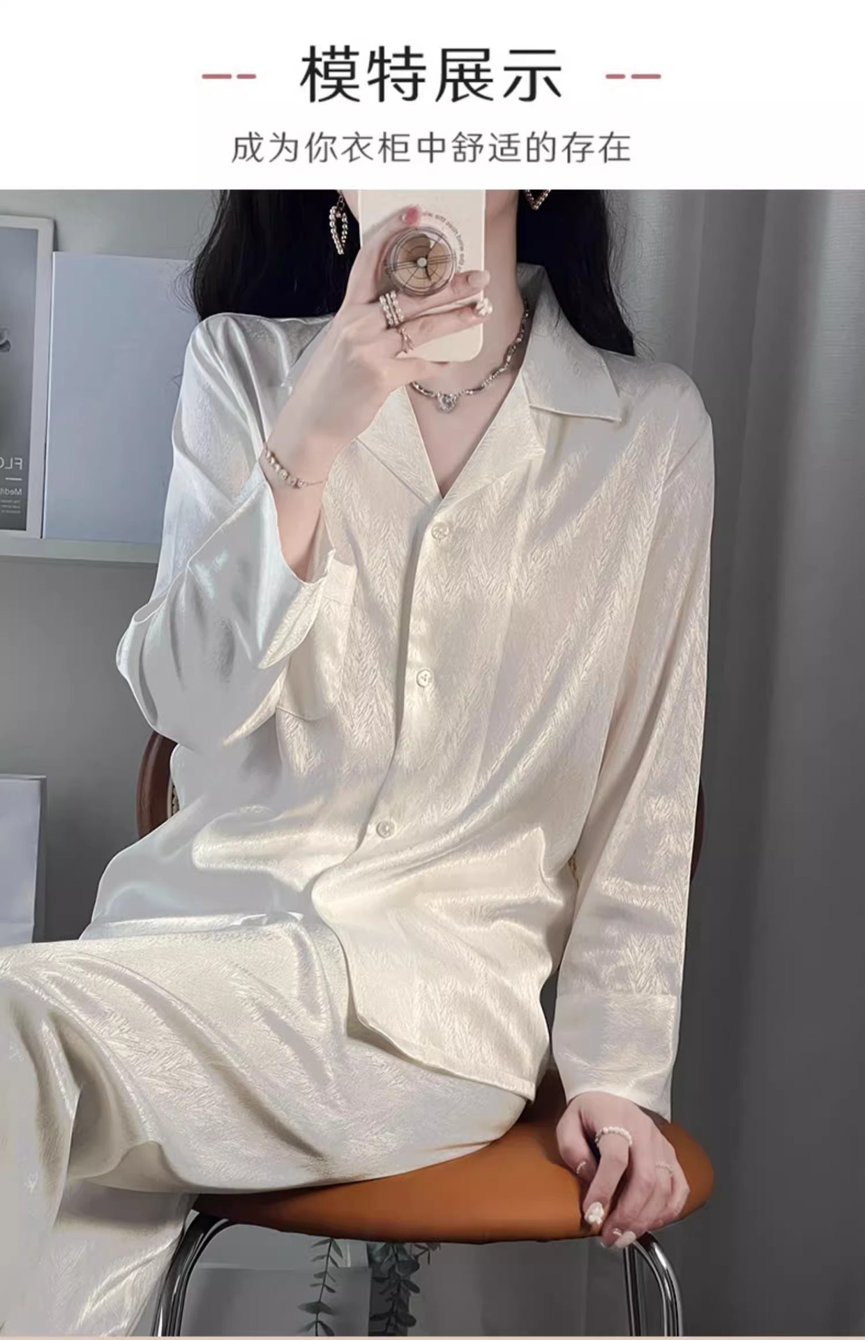새로운 품질 셔츠 잠옷 여성의 봄과 가을 흰색 긴 소매 바지 자카드 카디건 홈 옷 실크 아이스 실크 세트