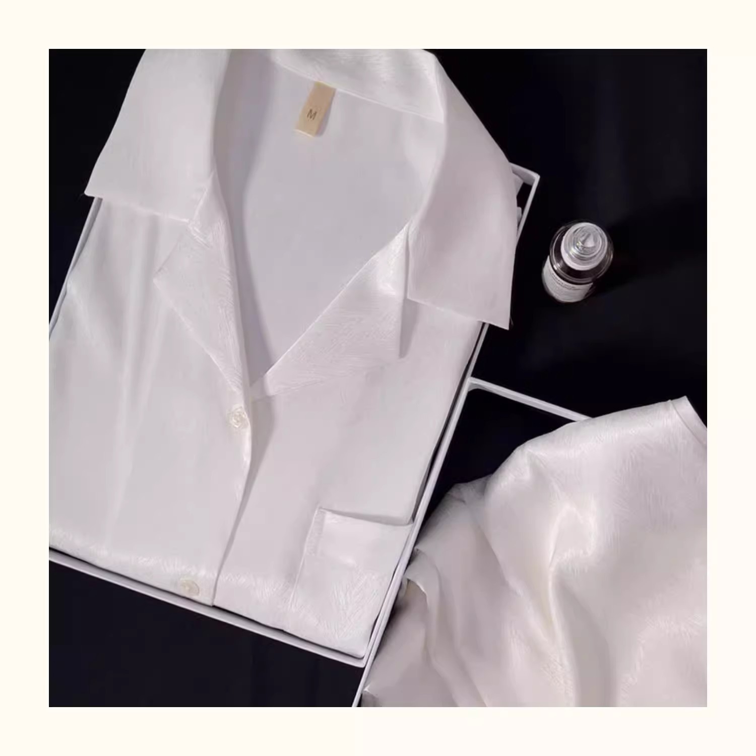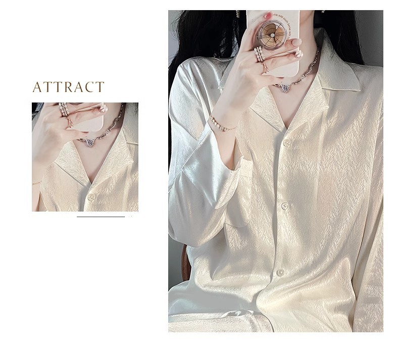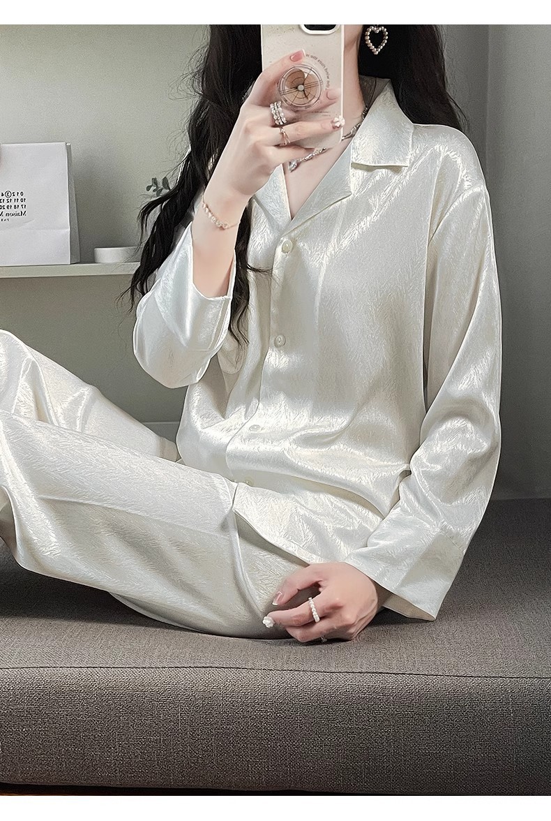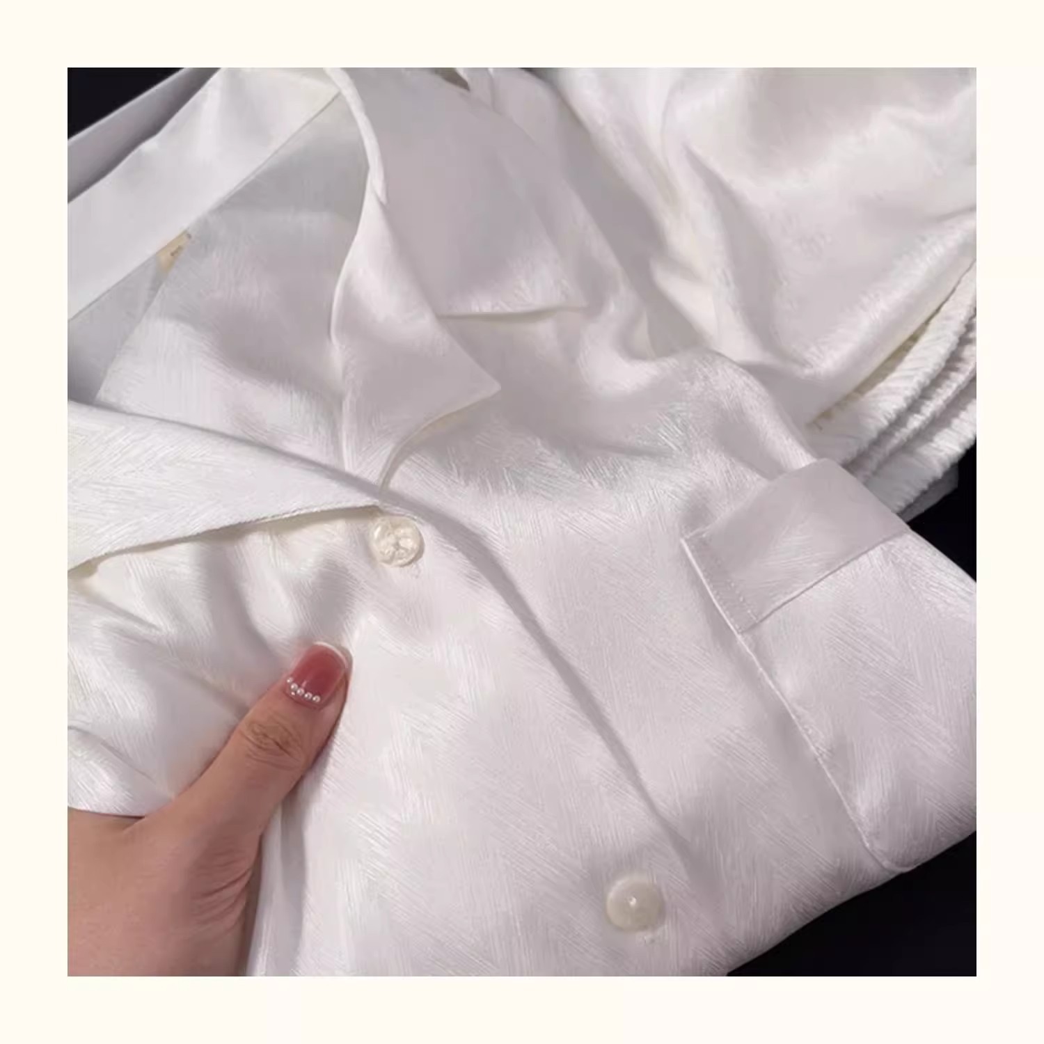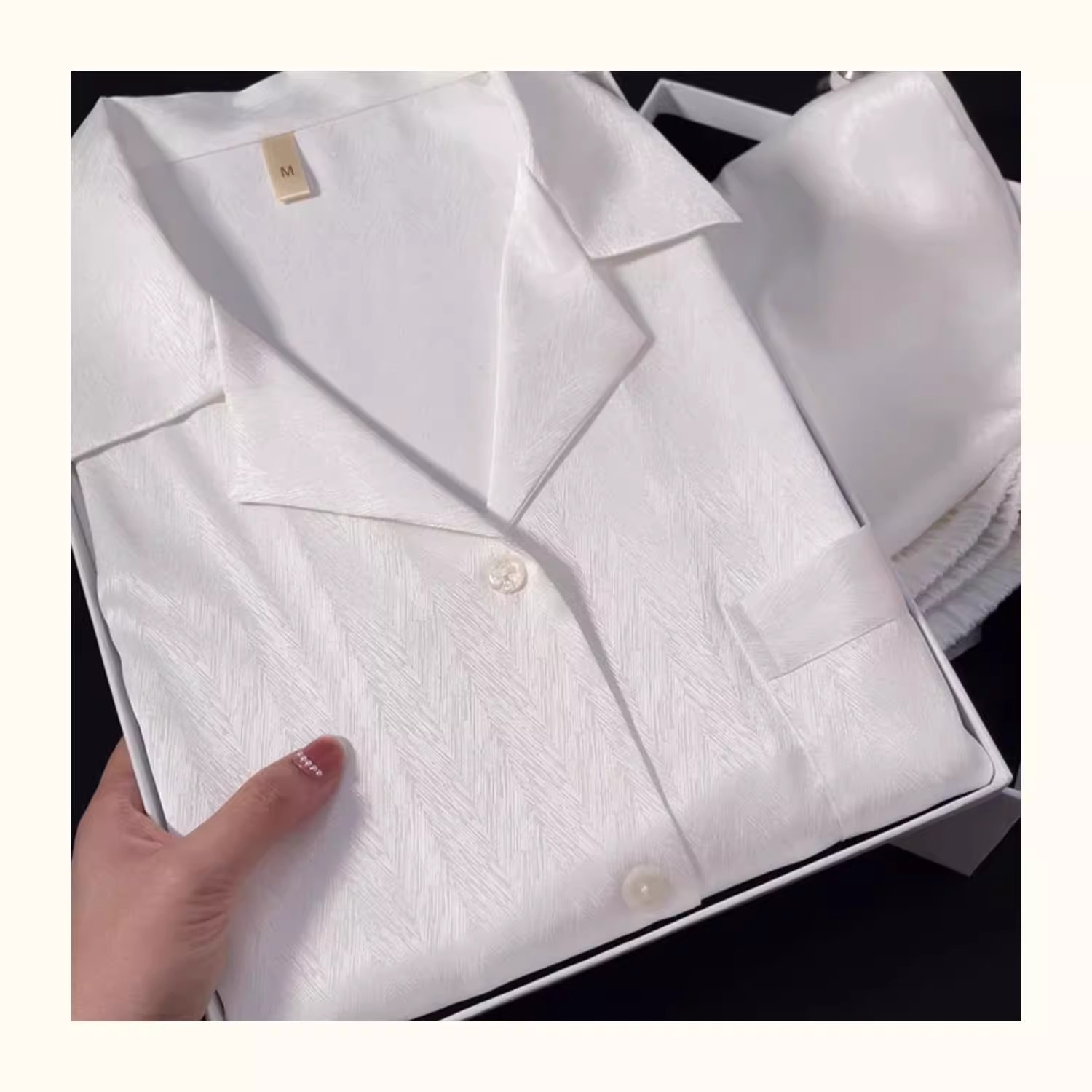 새로운 품질 셔츠 잠옷 여성의 봄과 가을 흰색 긴 소매 바지 자카드 카디건 홈 옷 실크 아이스 실크 세트