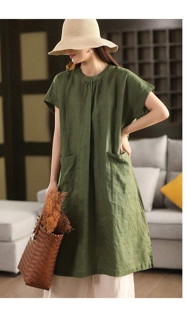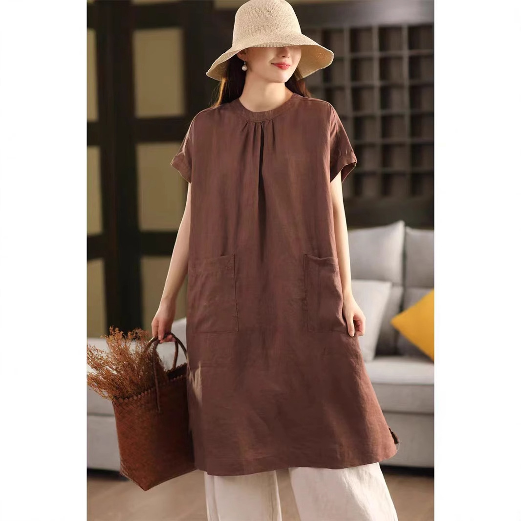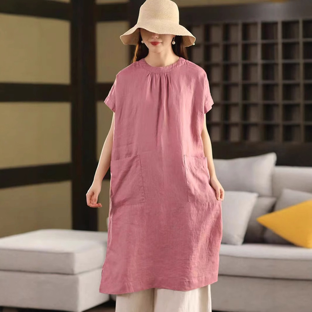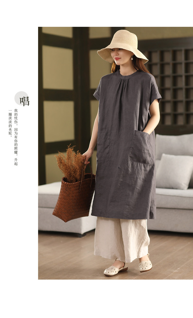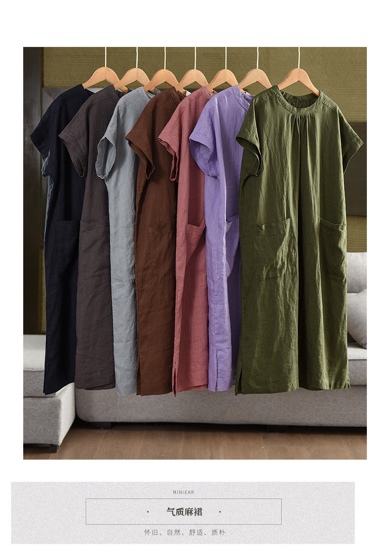 2025 여름 새로운 빈티지 리넨 원피스 여성의 우아한 중간 길이 슬리밍 느슨한 원피스 예술적 리넨 원피스스토어 가기