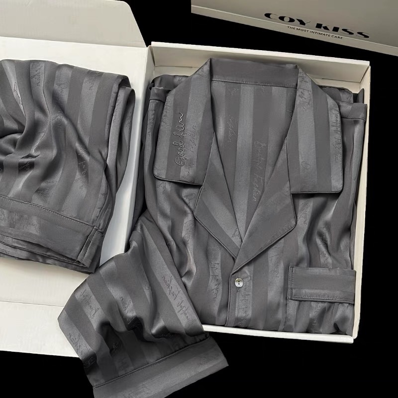 [넥라인 자수] 남성용 잠옷 심플 자카드 잠옷 아이스 실크 실크 자수 고급 긴팔 홈웨어