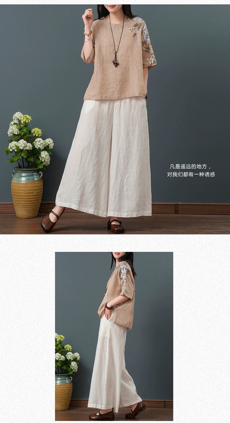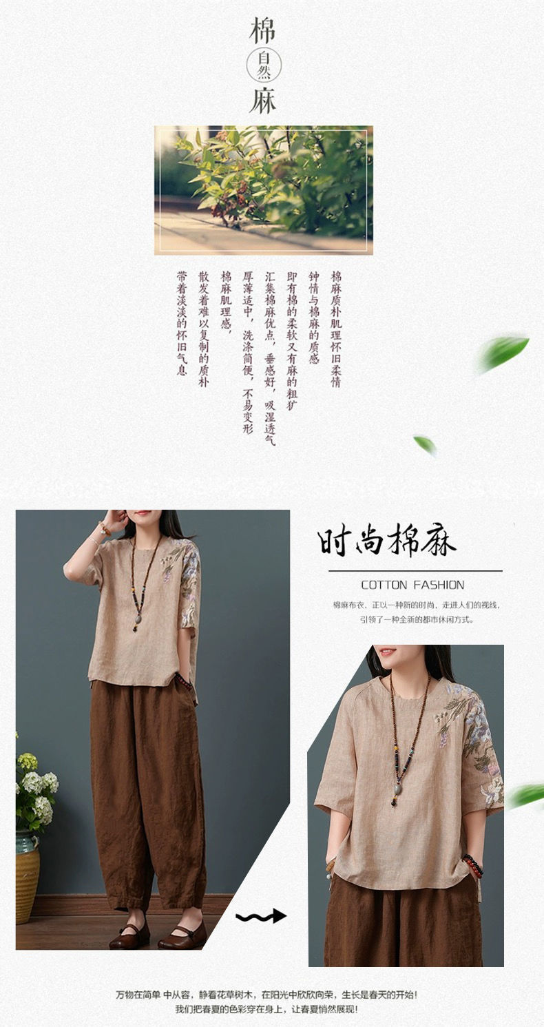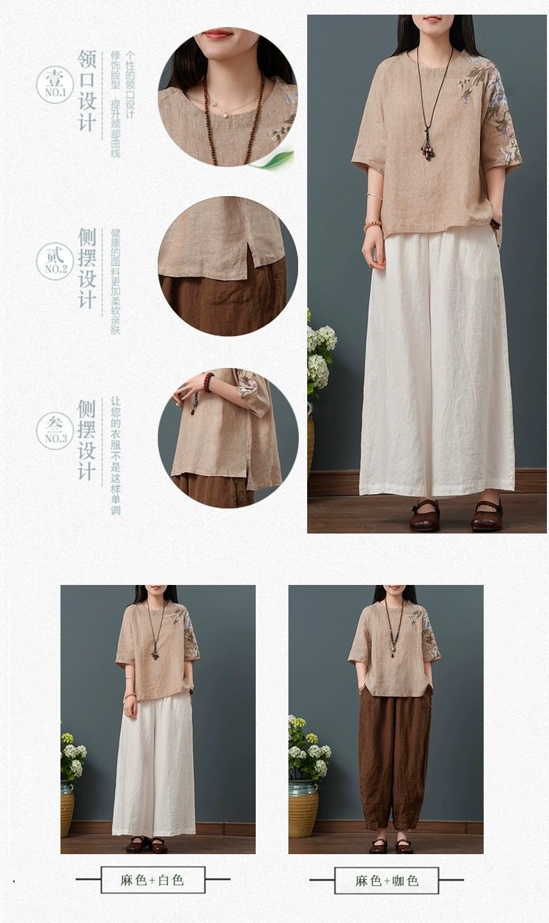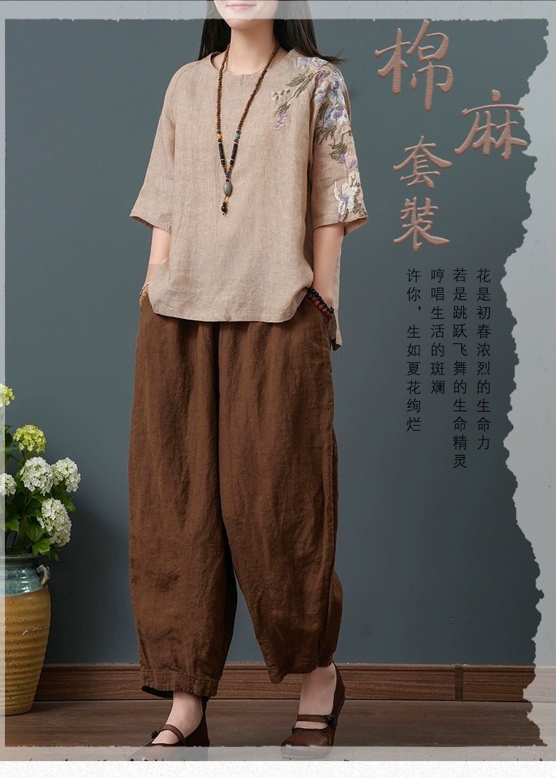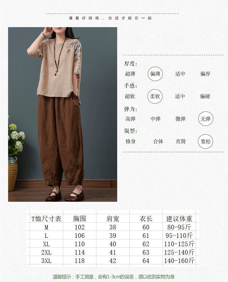 느슨한 플러스 사이즈 여성 의류 중년 어머니 여름 린넨 면화 및 리넨 최고 여성 반팔 티셔츠 발목 길이 바지 세트스토어 가기