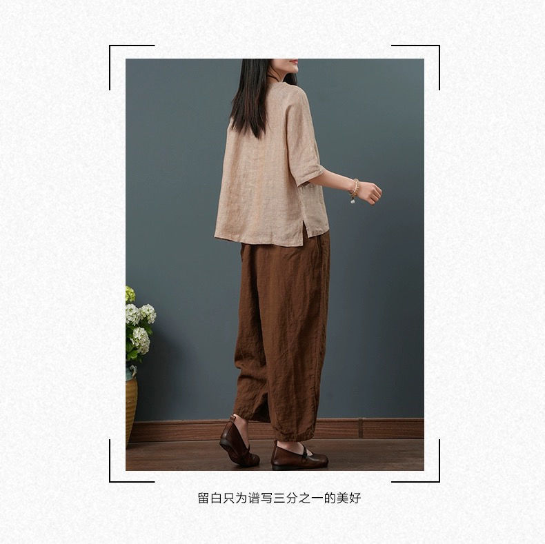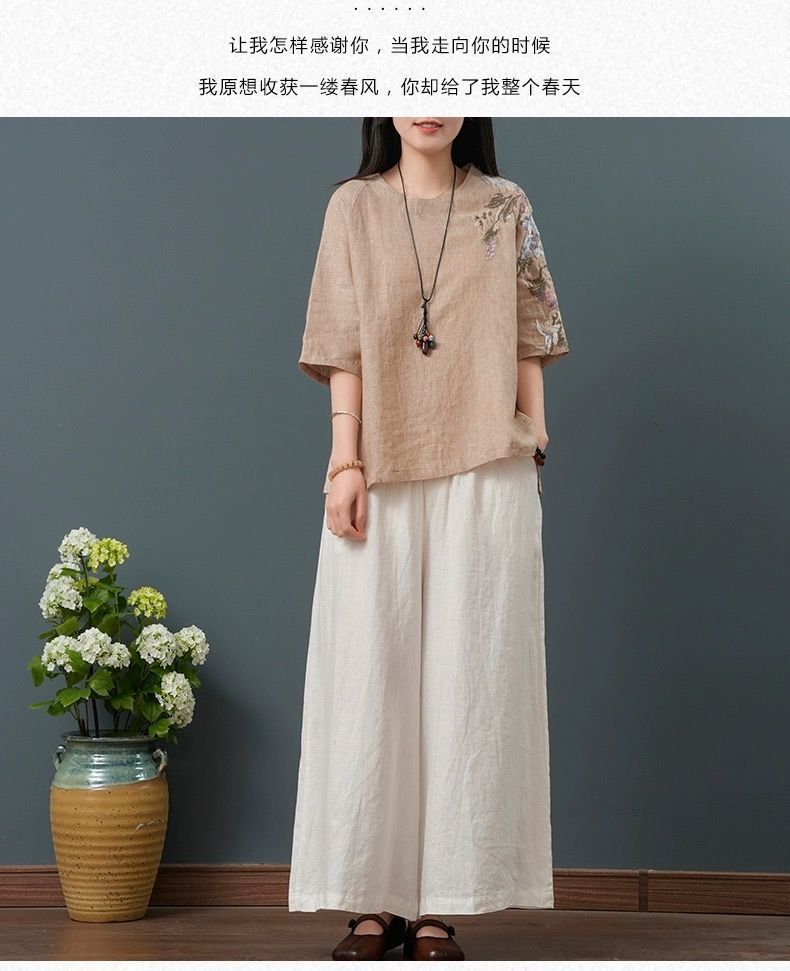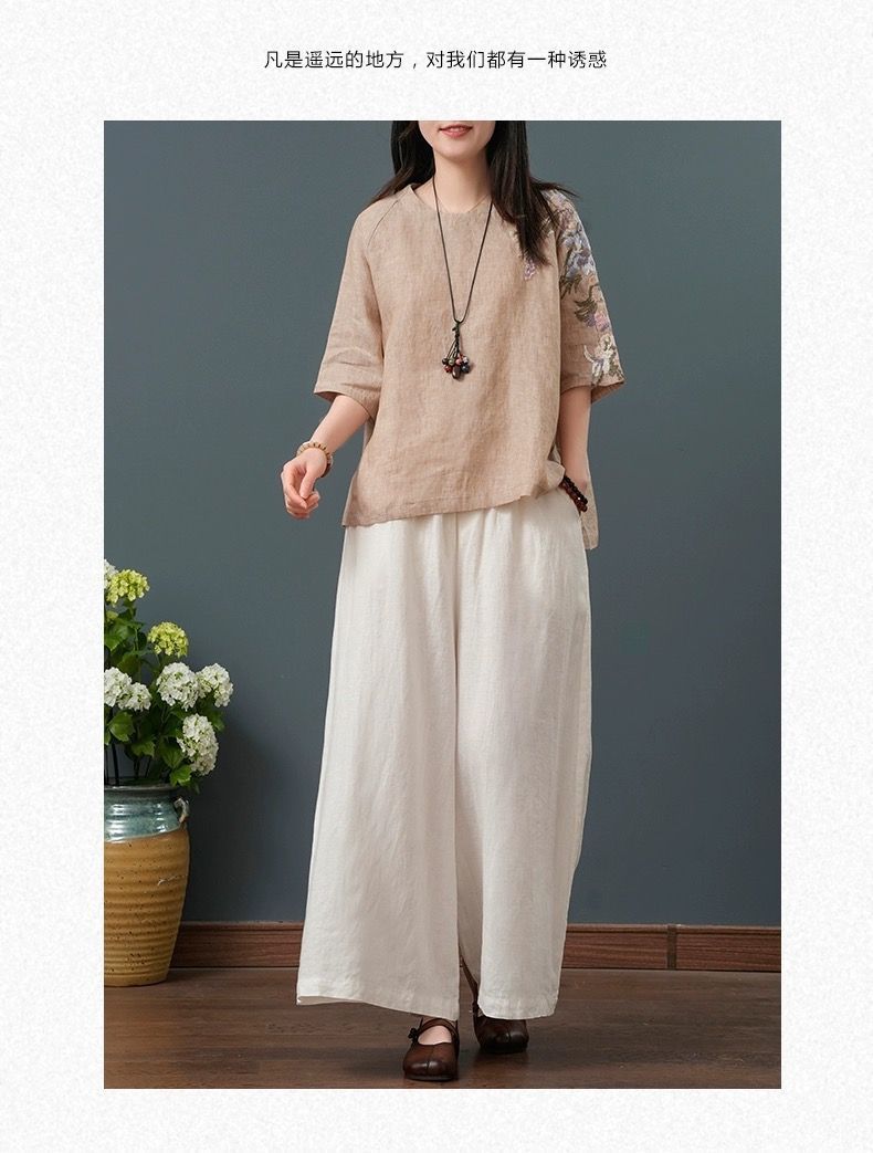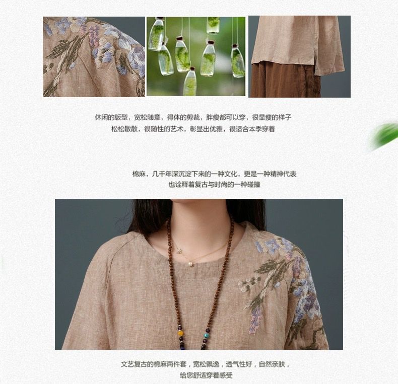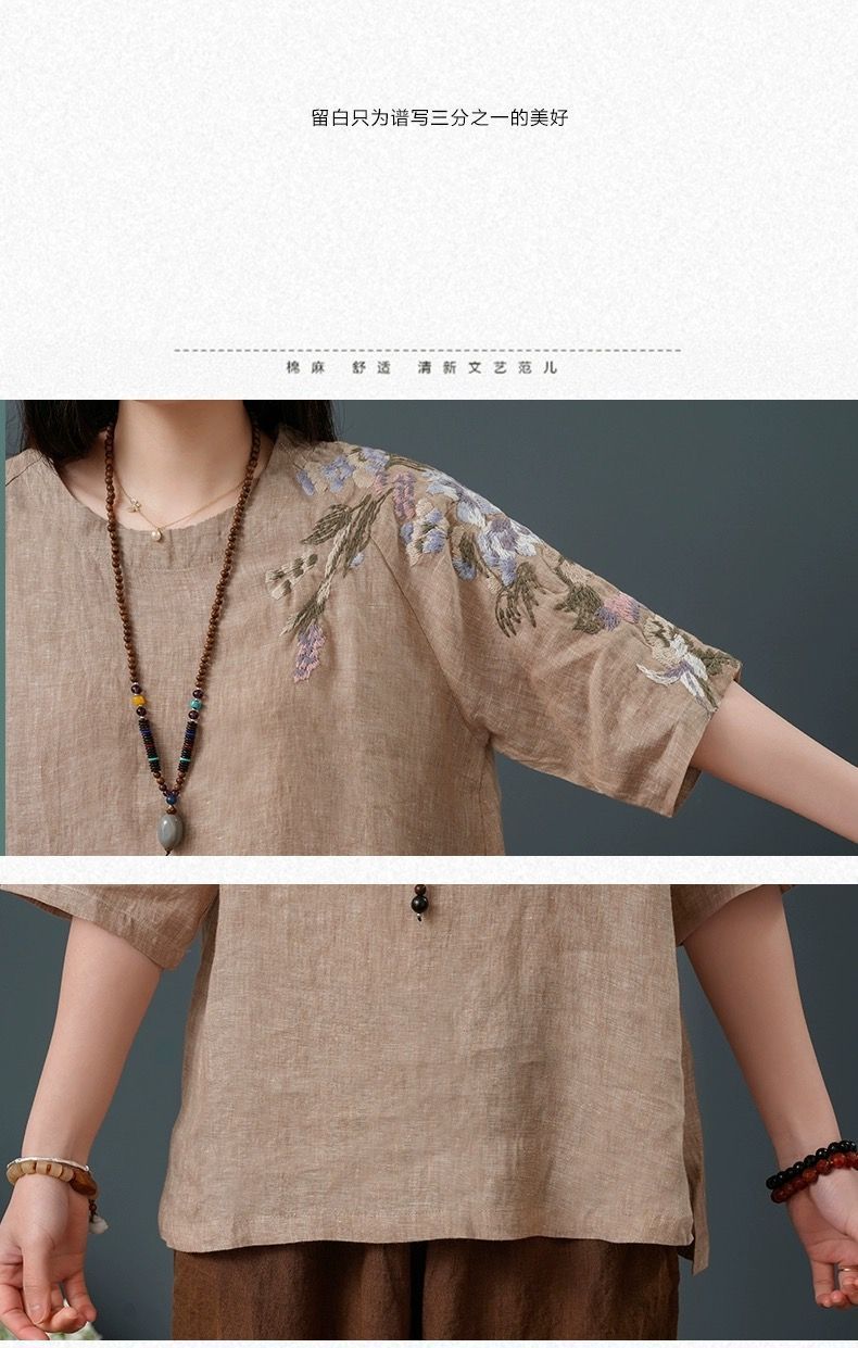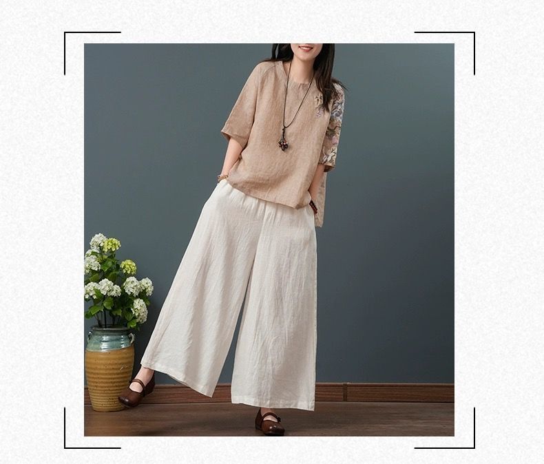 느슨한 플러스 사이즈 여성 의류 중년 어머니 여름 린넨 면화 및 리넨 최고 여성 반팔 티셔츠 발목 길이 바지 세트스토어 가기