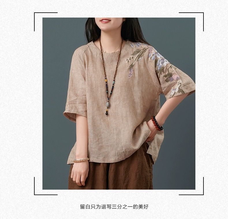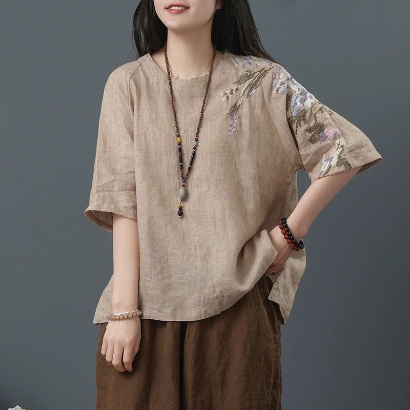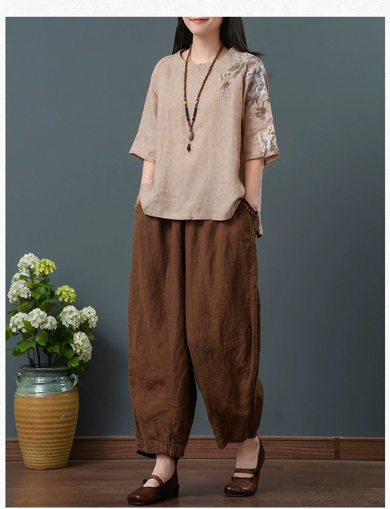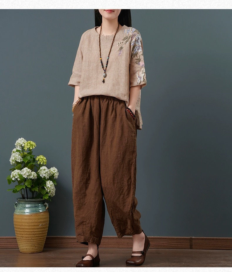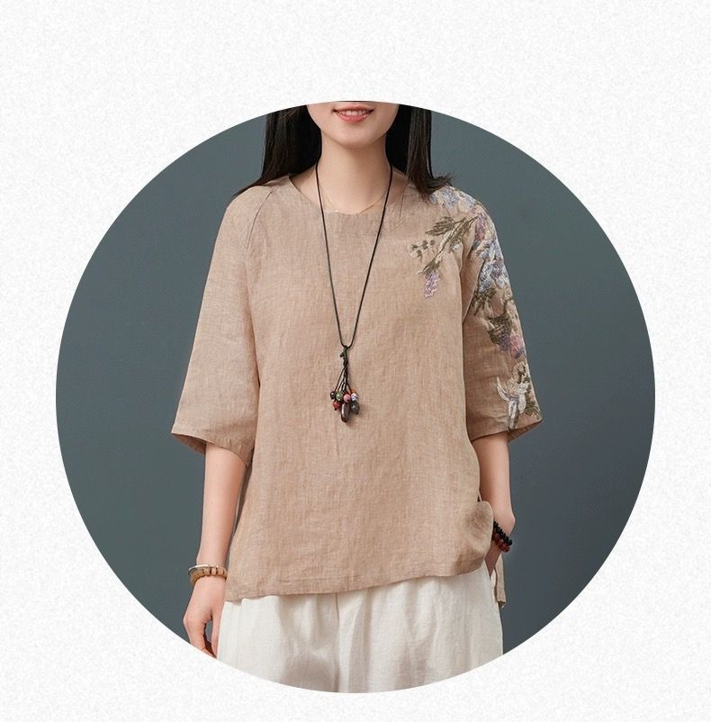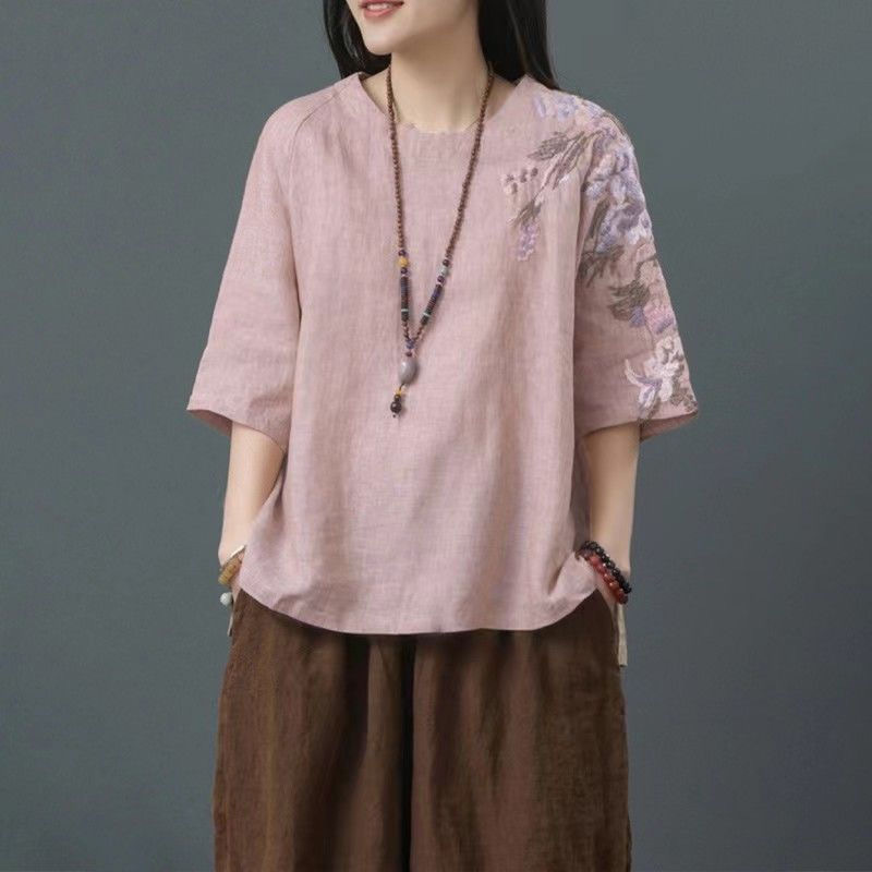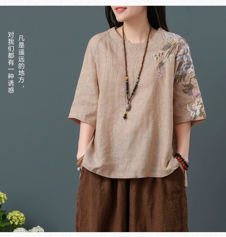 느슨한 플러스 사이즈 여성 의류 중년 어머니 여름 린넨 면화 및 리넨 최고 여성 반팔 티셔츠 발목 길이 바지 세트스토어 가기
