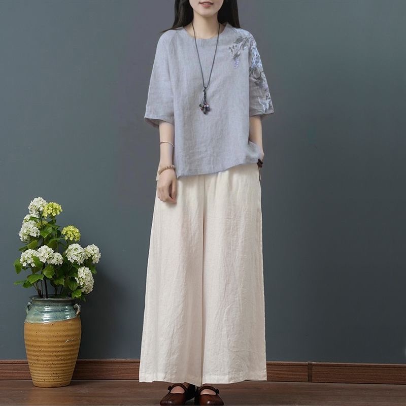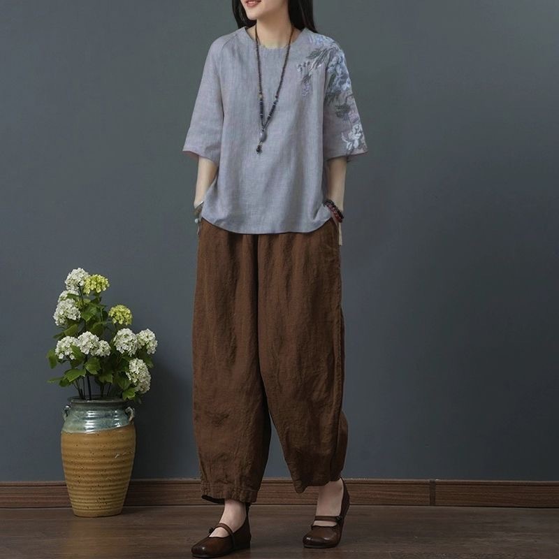 느슨한 플러스 사이즈 여성 의류 중년 어머니 여름 린넨 면화 및 리넨 최고 여성 반팔 티셔츠 발목 길이 바지 세트