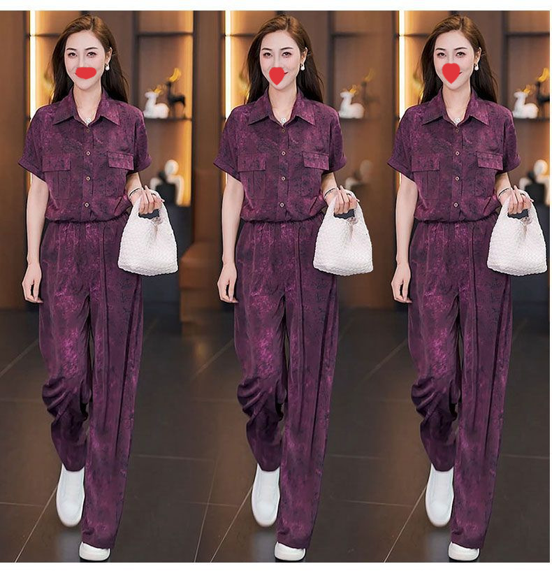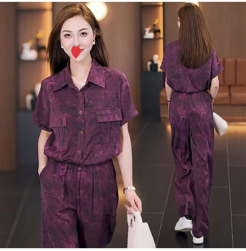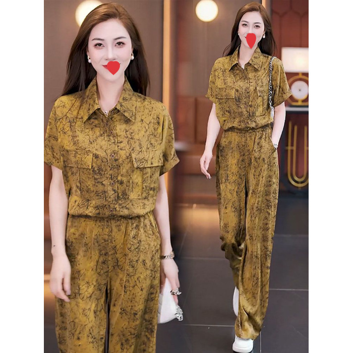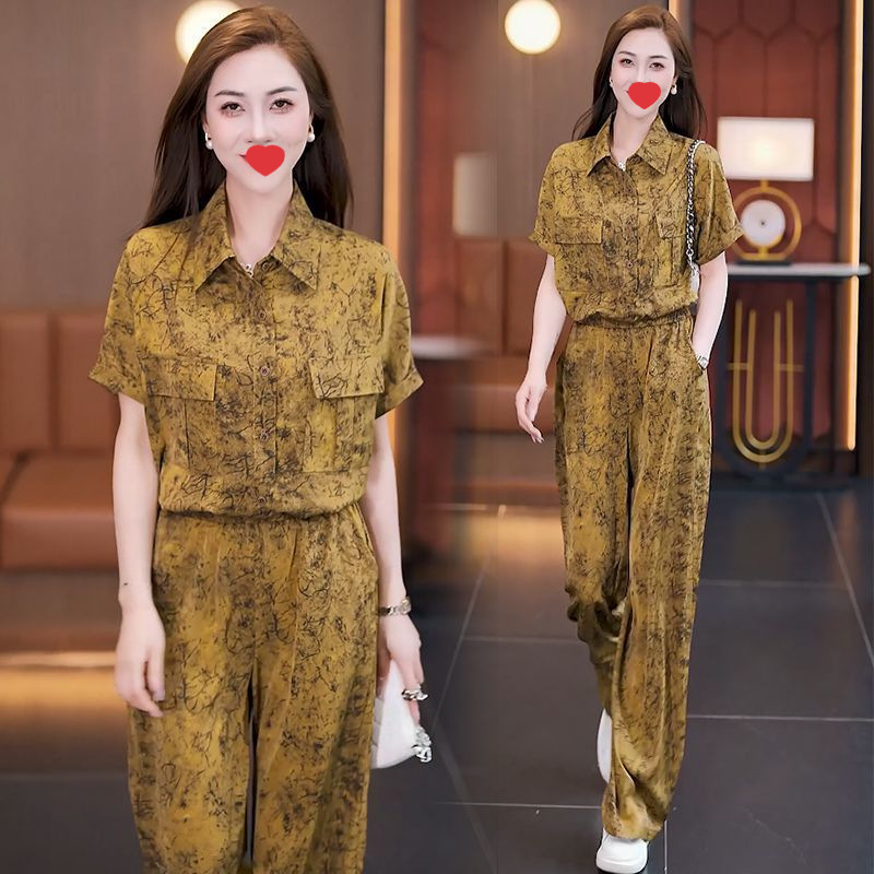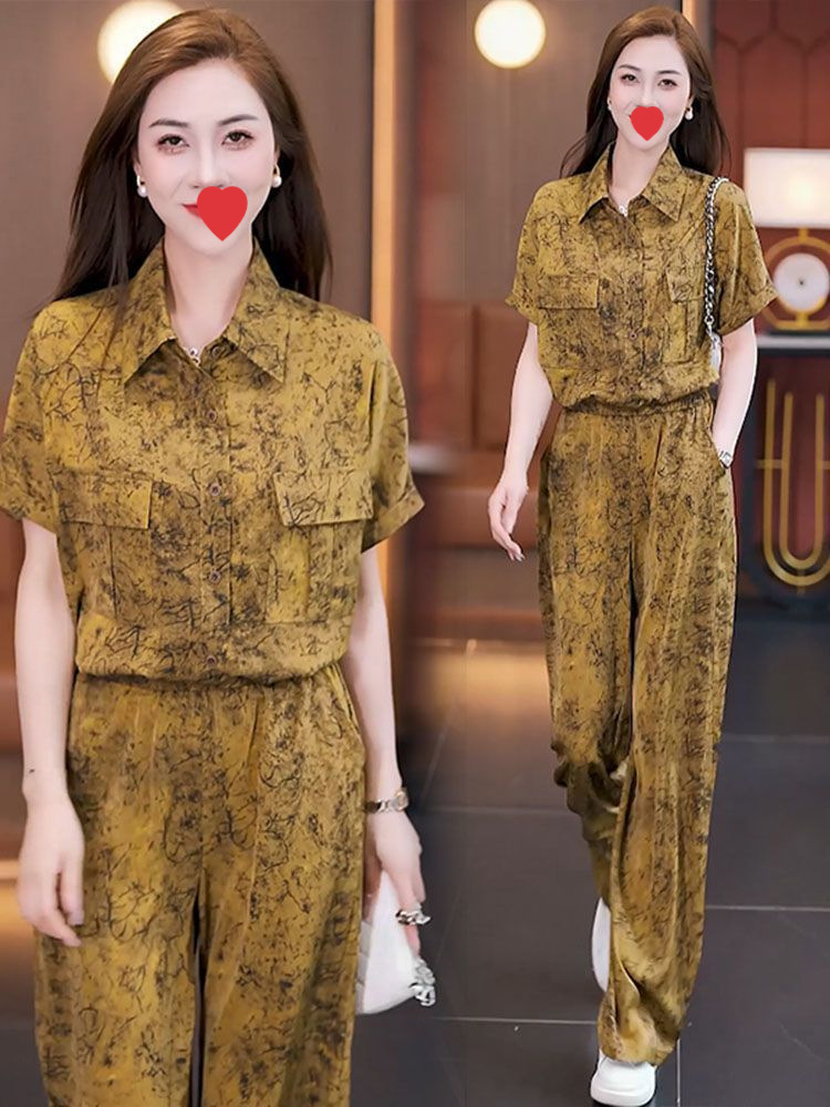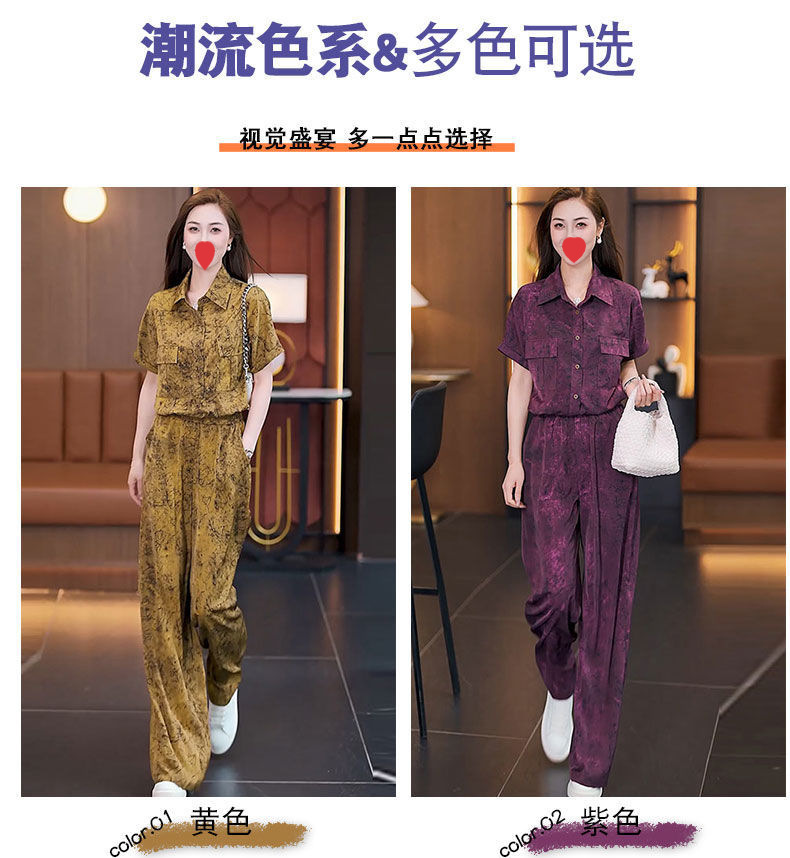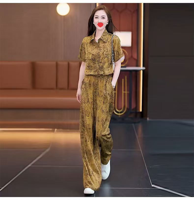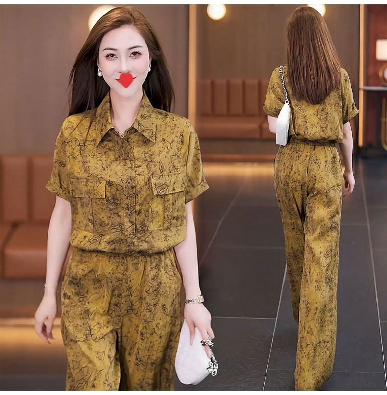 대외 무역 플러스 사이즈 캐주얼 레트로 반팔 세트 여성 여름 새로운 패션 연령 감소 셔츠 슬리밍 와이드 레그 바지 세트스토어 가기