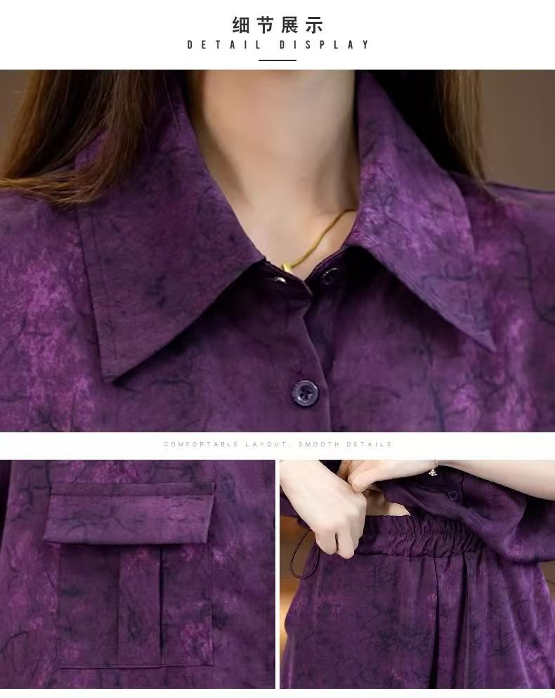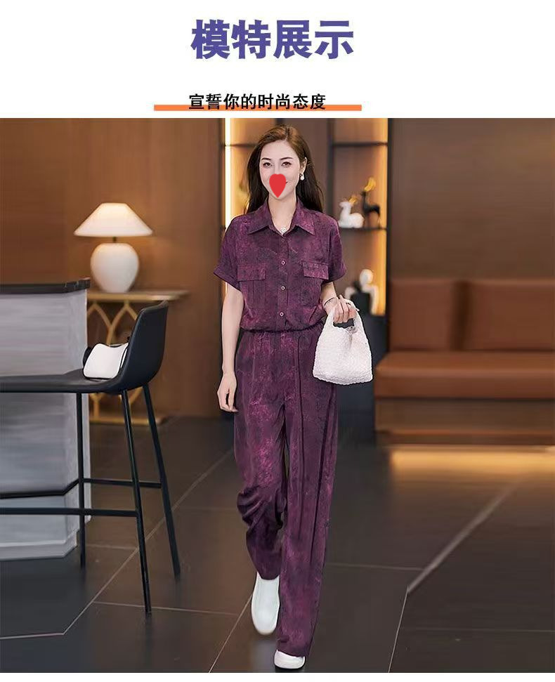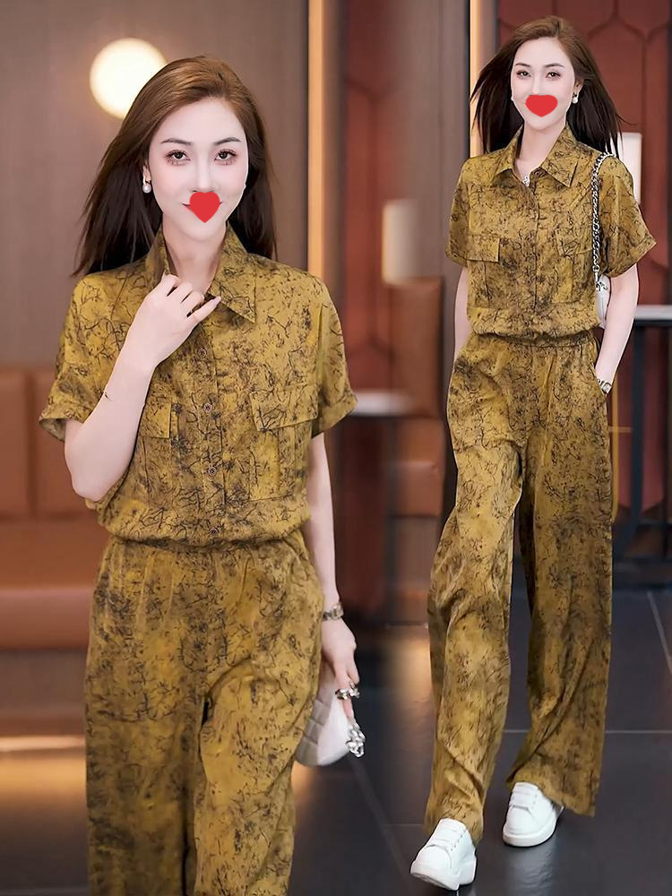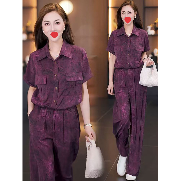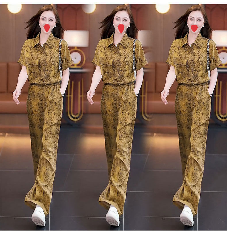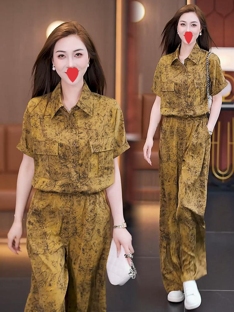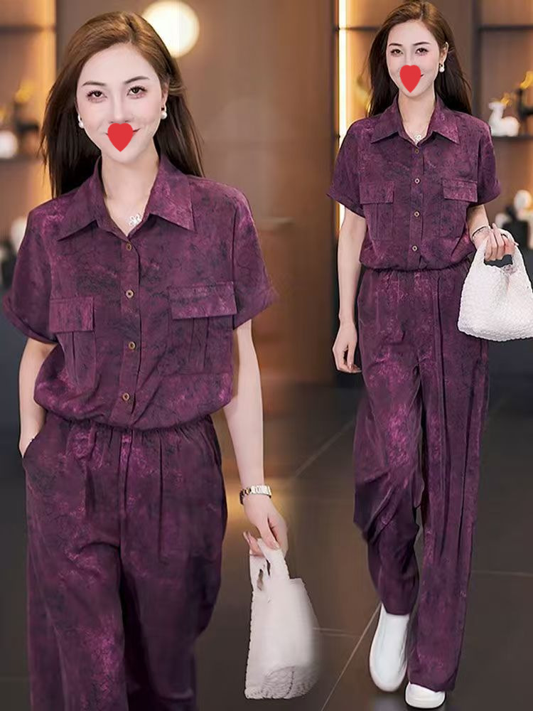 대외 무역 플러스 사이즈 캐주얼 레트로 반팔 세트 여성 여름 새로운 패션 연령 감소 셔츠 슬리밍 와이드 레그 바지 세트스토어 가기
