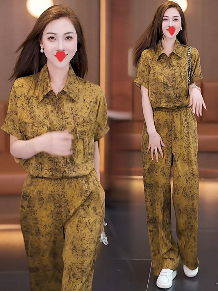 대외 무역 플러스 사이즈 캐주얼 레트로 반팔 세트 여성 여름 새로운 패션 연령 감소 셔츠 슬리밍 와이드 레그 바지 세트