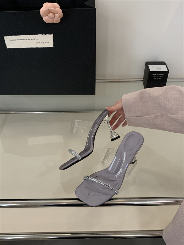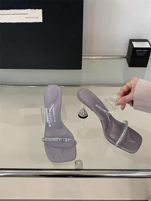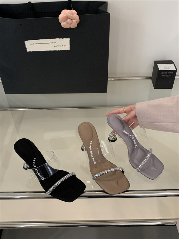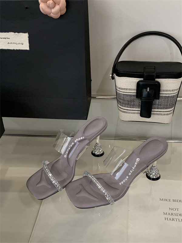 여성을위한 프랑스 스타일의 아름다운 검은 색 투명 라인 석 하이힐 슬리퍼 여름 2025 새로운 패션 다목적 샌들스토어 가기
