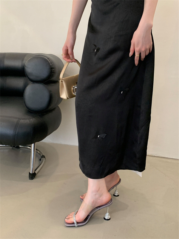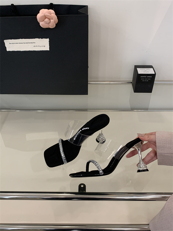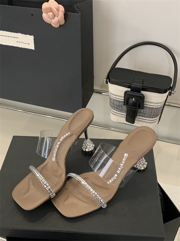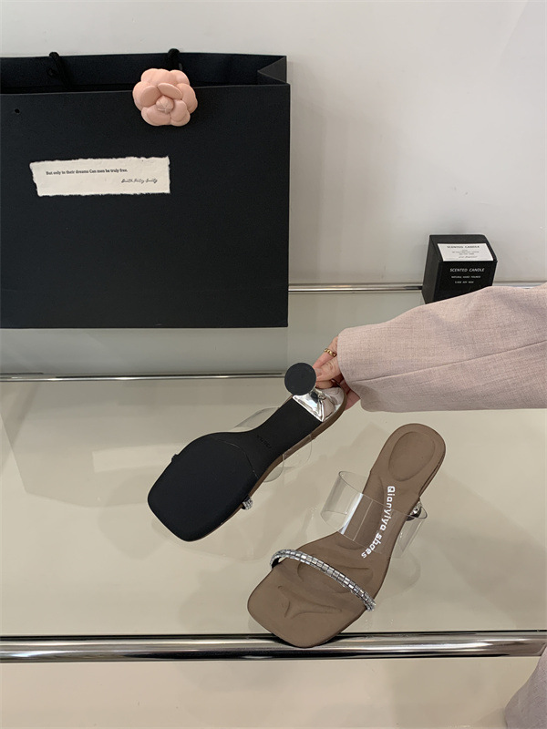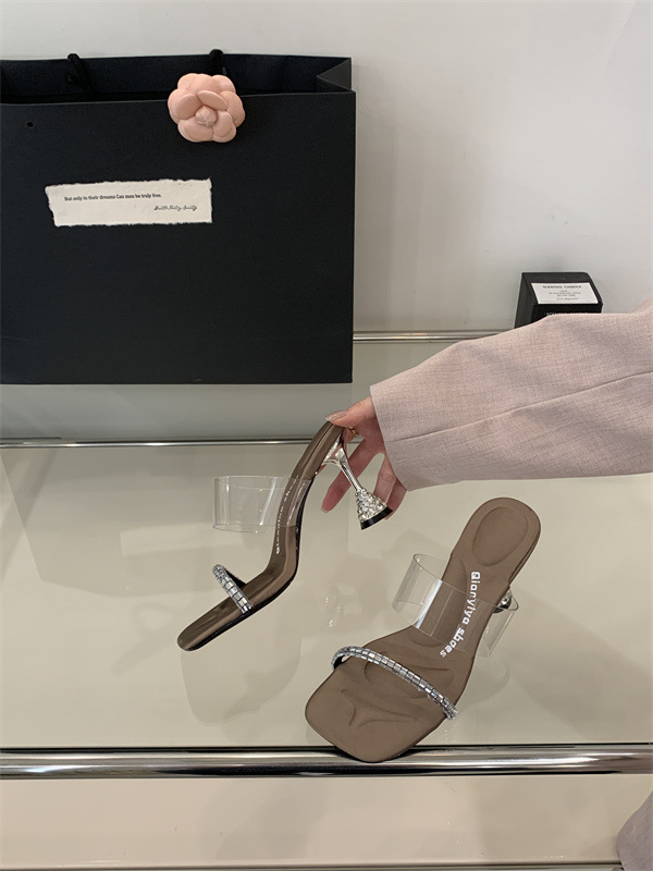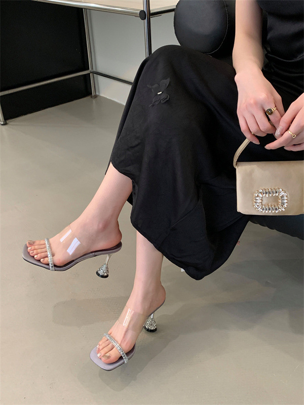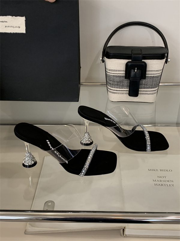 여성을위한 프랑스 스타일의 아름다운 검은 색 투명 라인 석 하이힐 슬리퍼 여름 2025 새로운 패션 다목적 샌들