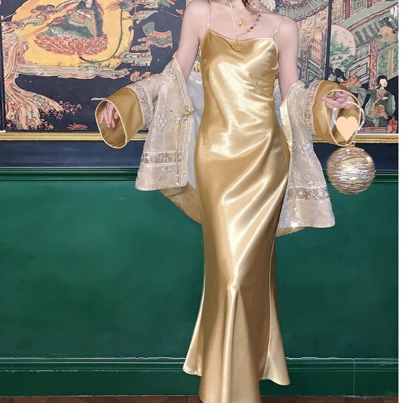 新中式两件套装气质刺绣古风提花短外套长袖女春季吊带连衣裙女