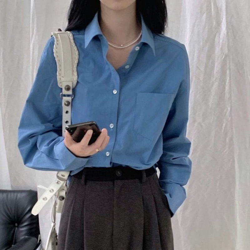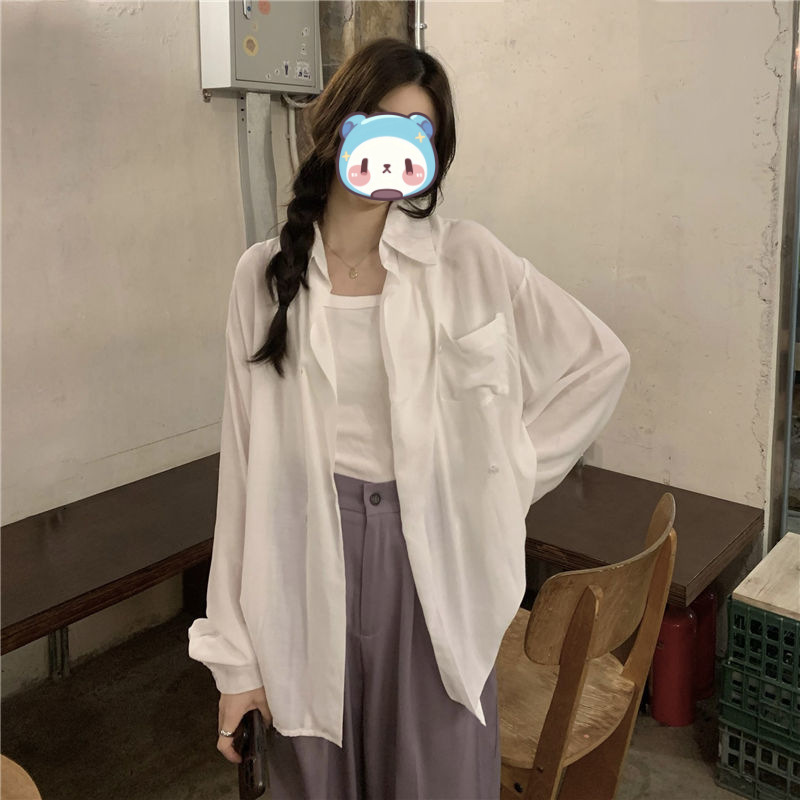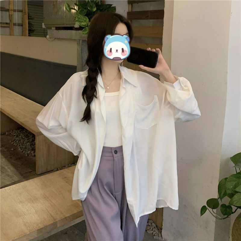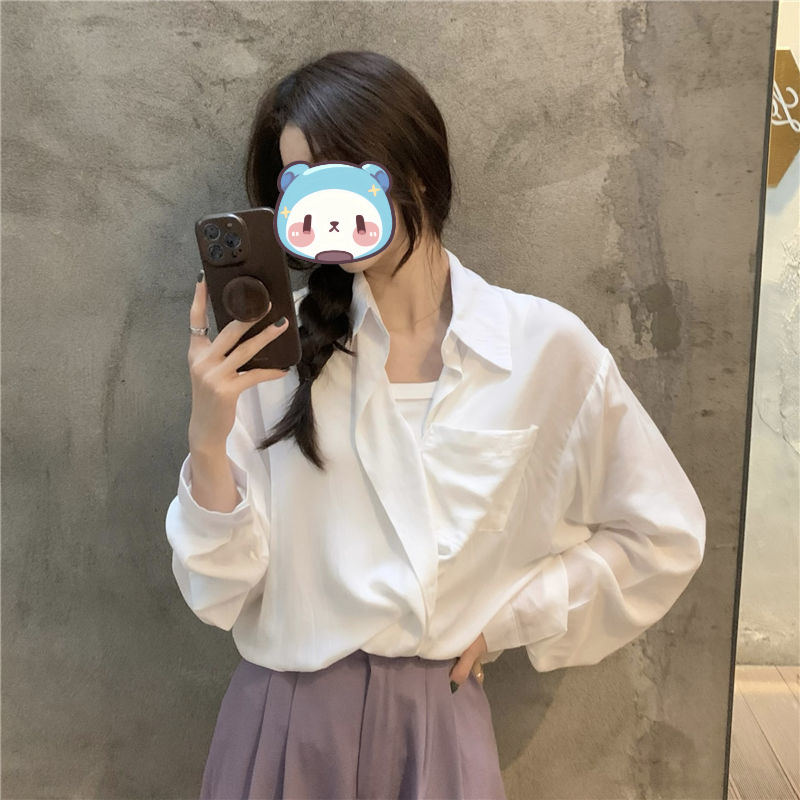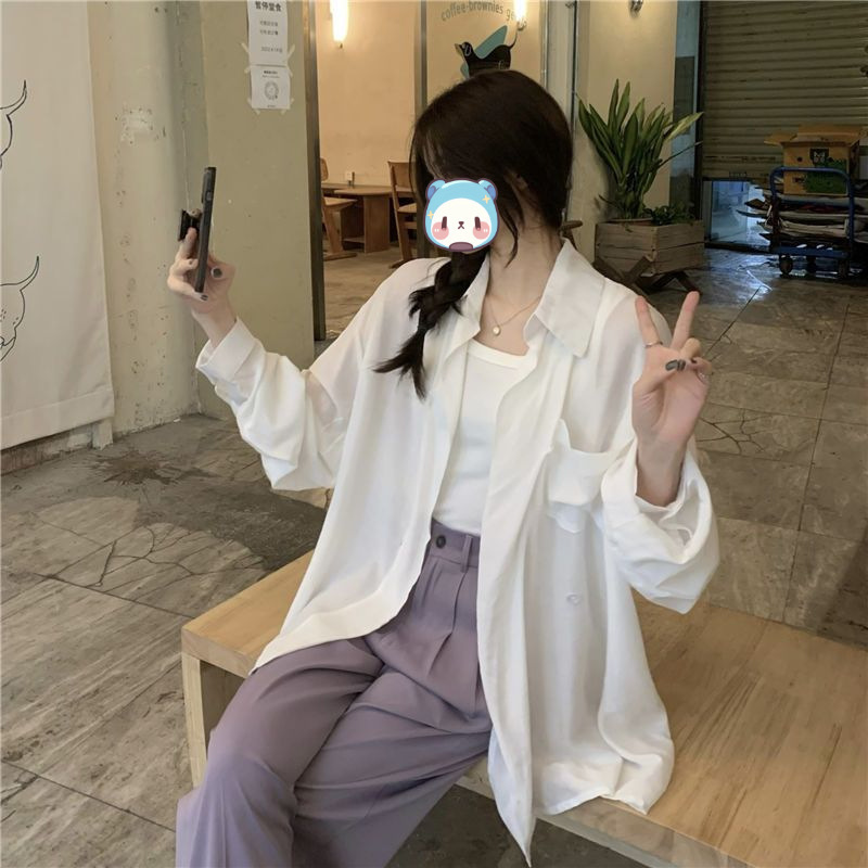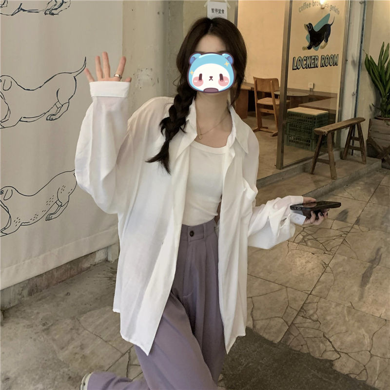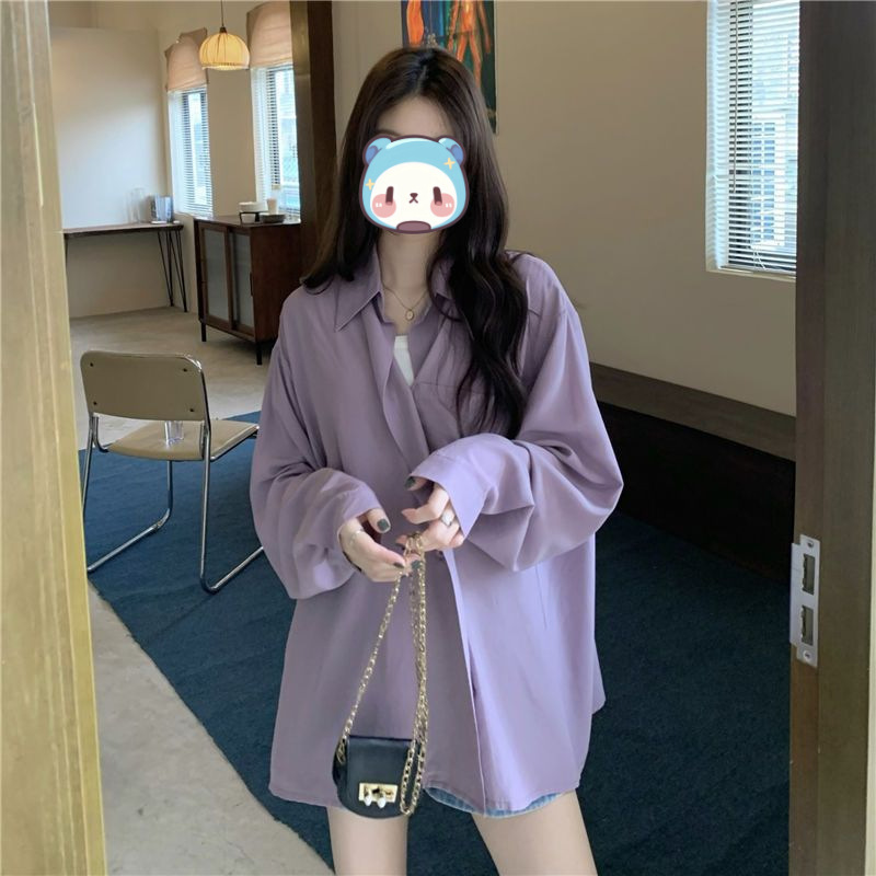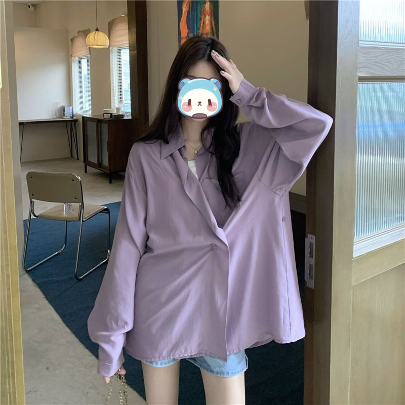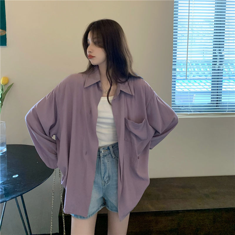 프랑스 보라색 선 스크린 셔츠 가을 새로운 느슨한 틈새 디자인 긴 소매 여성의 얇은 올 매치 폴로 칼라 셔츠