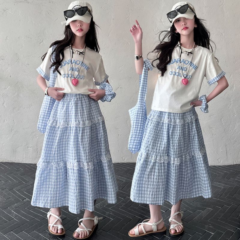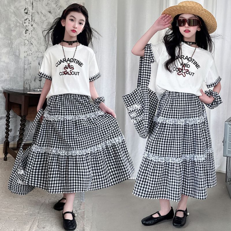 가방과 머리띠 포함, 여아용 4종 세트, 여름 의류, 아동복, 큰 아동용 패셔너블 스커트, 티셔츠, 한국 스타일 투피스 세트, 트렌디스토어 가기
