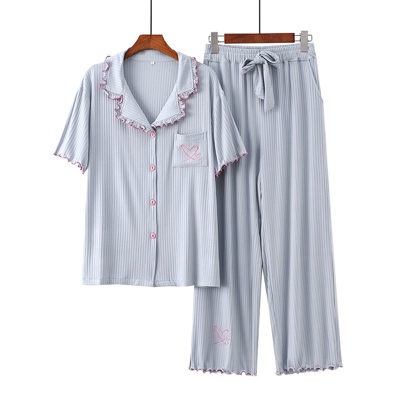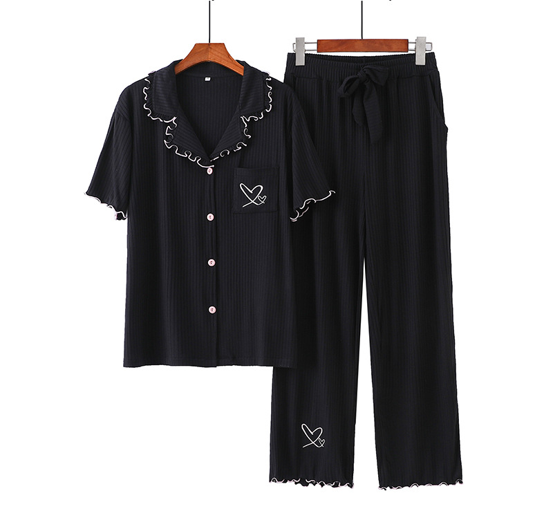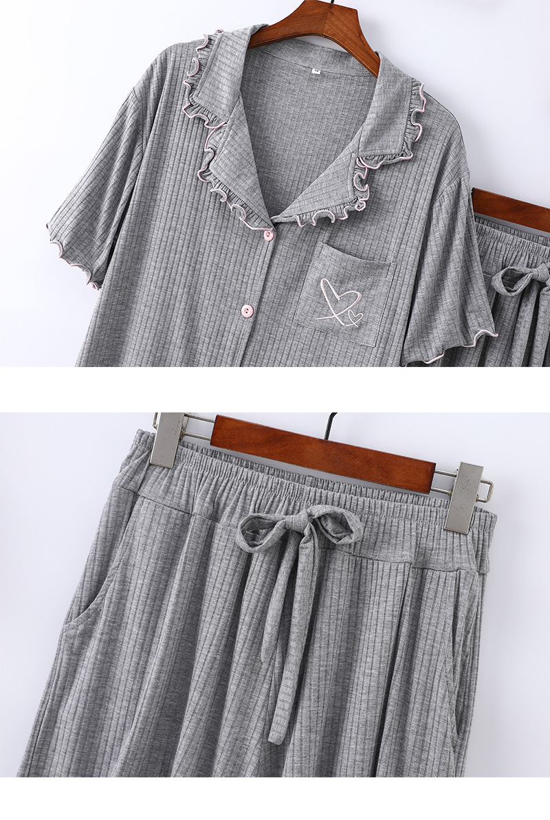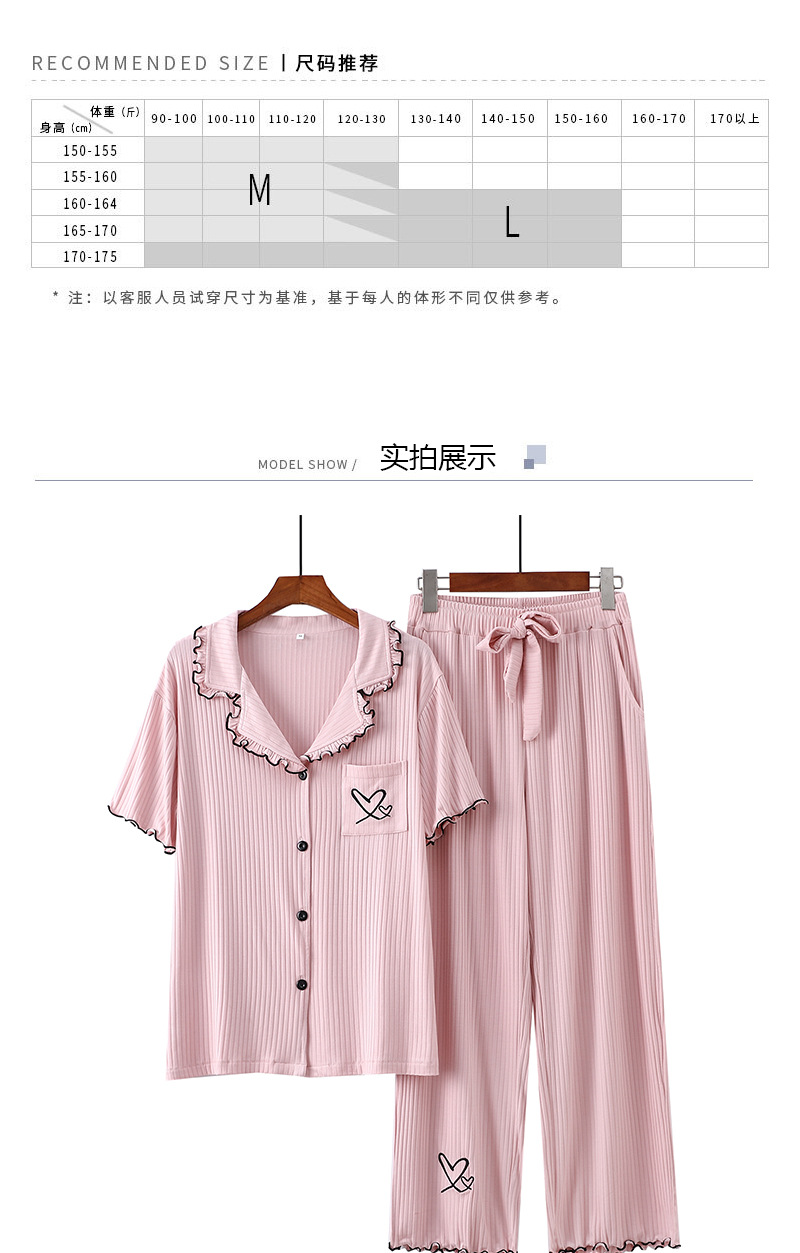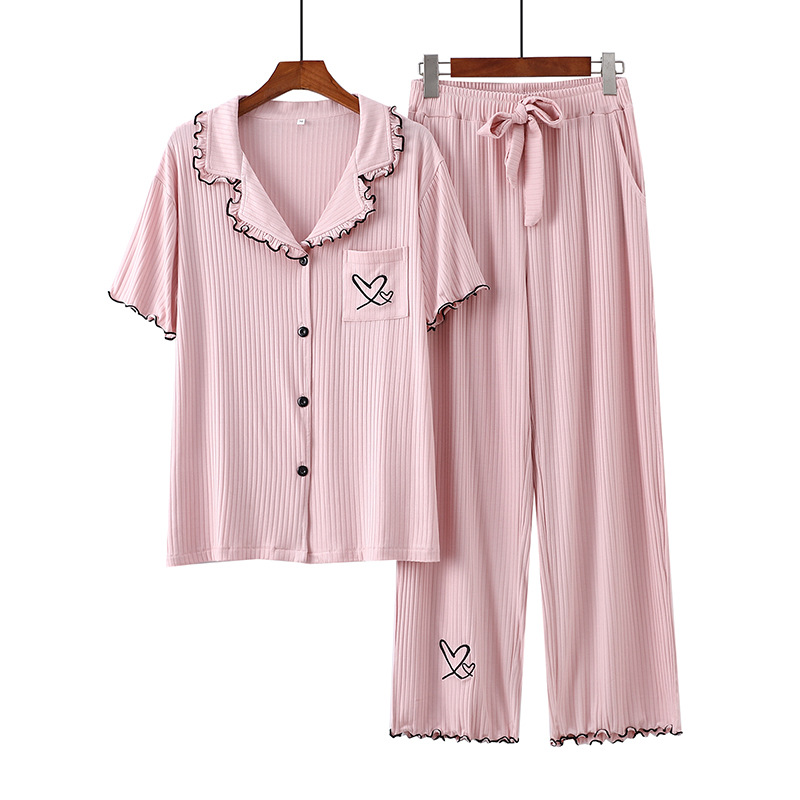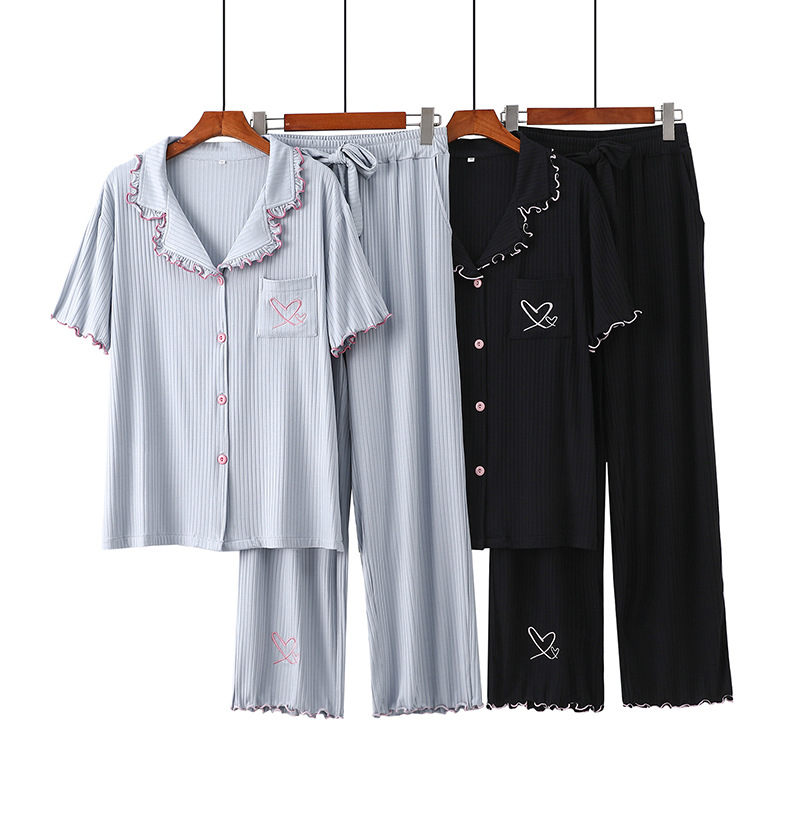 2025 여름 잠옷 여성 8*5 피트 모달 바지 짧은 소매 더블 사랑 자수 카디건 옷깃 홈 옷