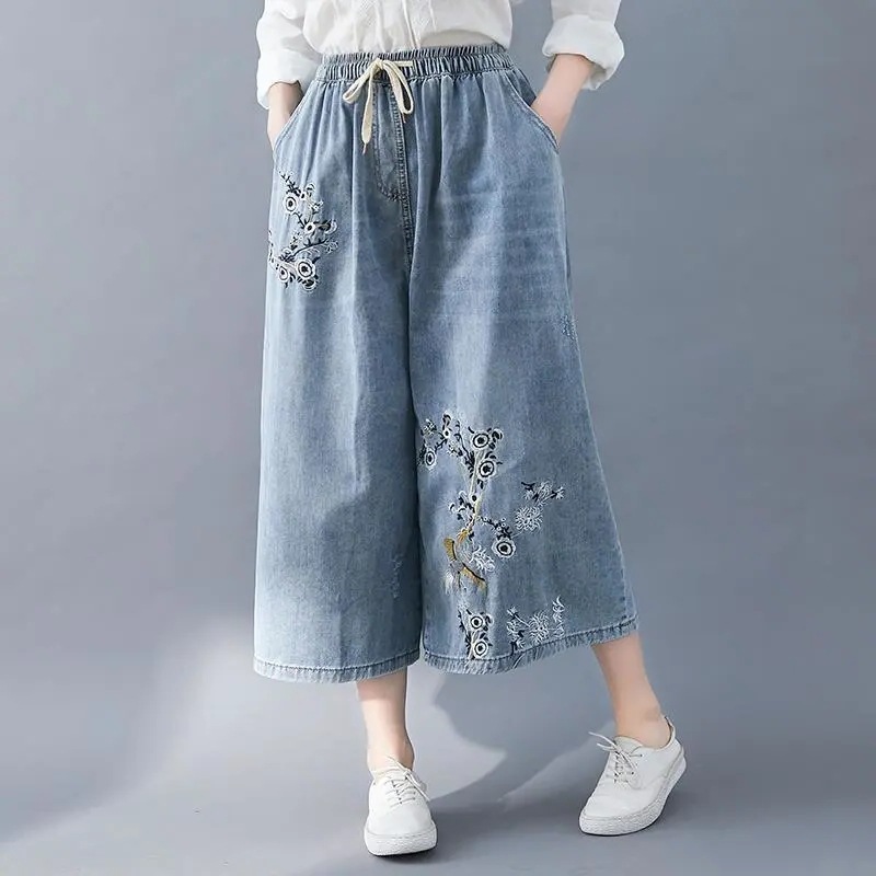 자수 신축성 있는 허리 와이드 팬츠 자수 신축성 있는 허리 캐주얼 와이드 팬츠