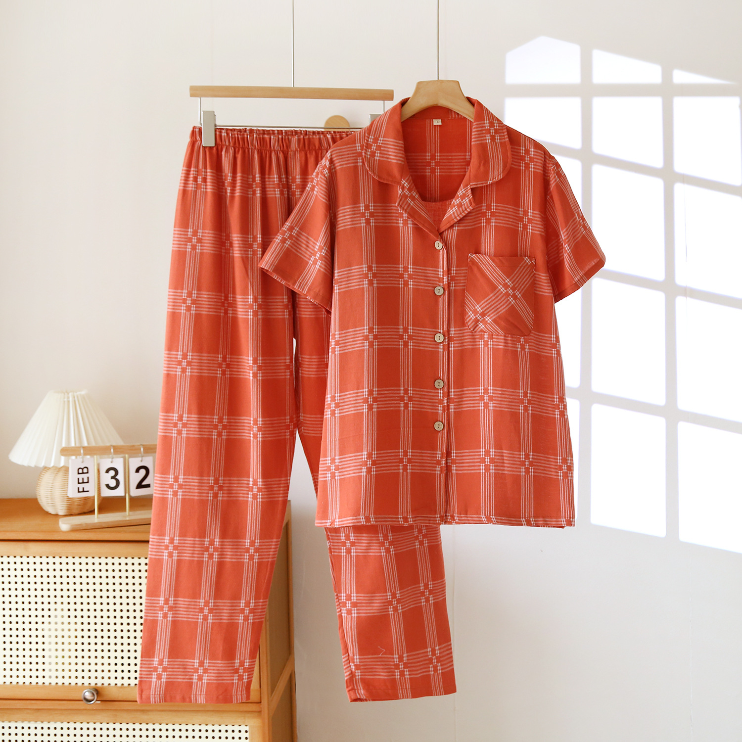 봄과 여름 새로운 순수 코튼 원사 염색 대형 격자 무늬 커플 반팔 바지 잠옷 남성과 여성의 옷깃 카디건 홈웨어 세트스토어 가기