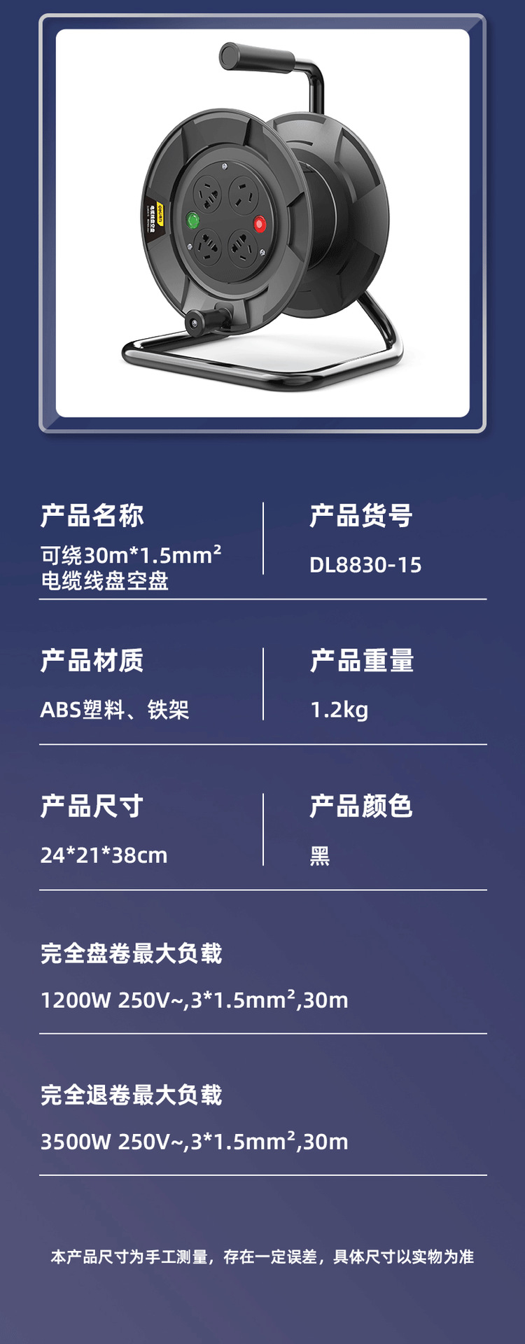 델리 DL8830-15 케이블 와이어 릴 최대 30m1.5 와이어 직경 빈 릴 16A(검정색)
