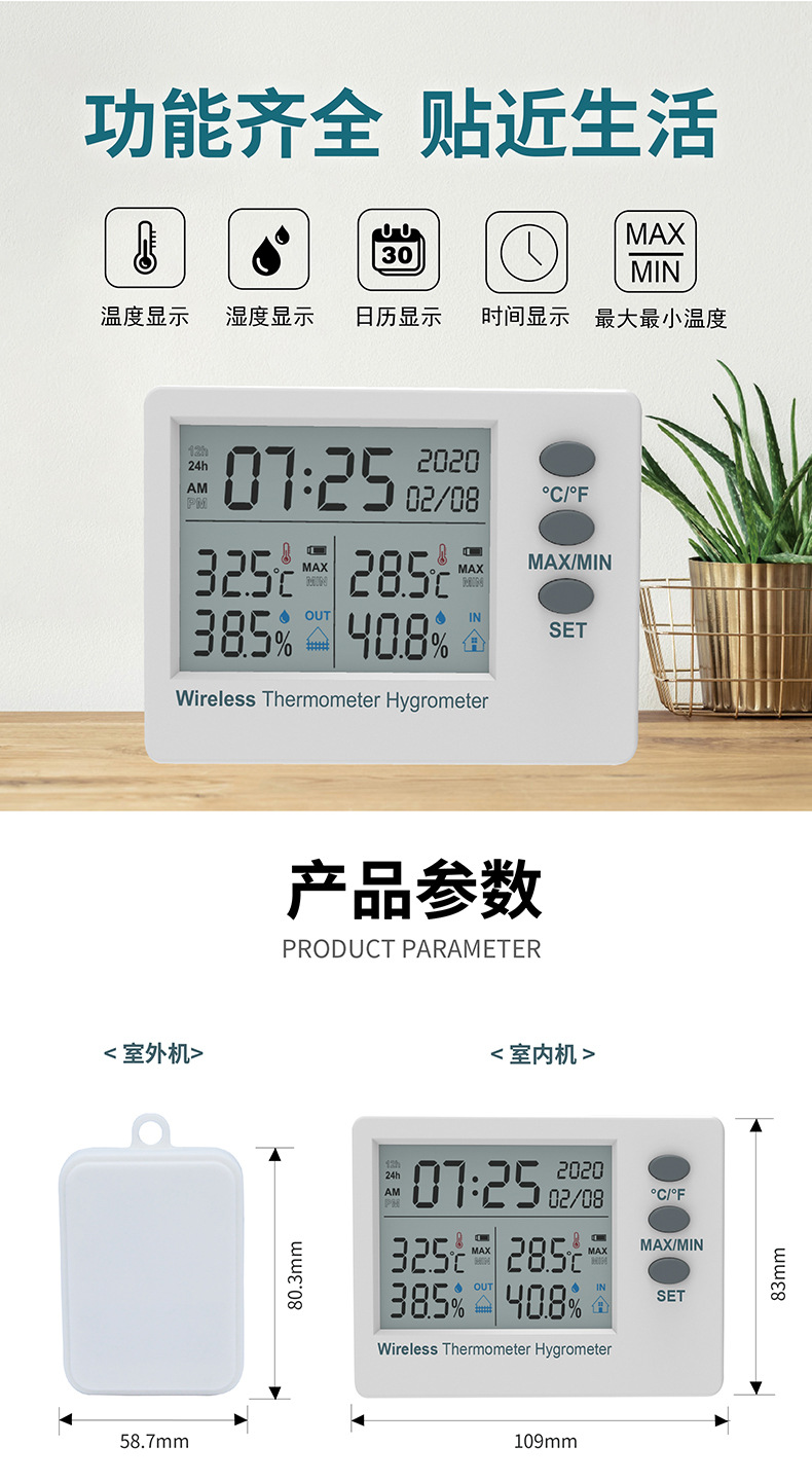室内机尺寸:109×83×20.8mm,室内温度范围:-10~70℃/14~158℉