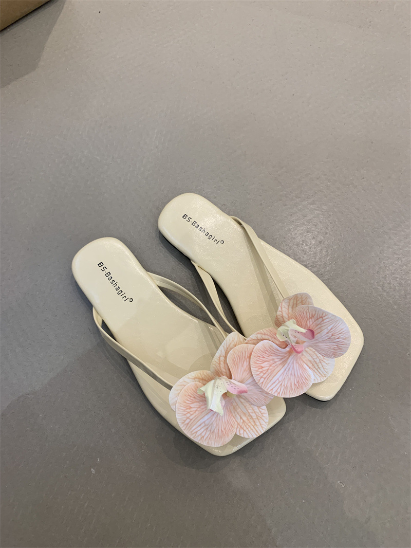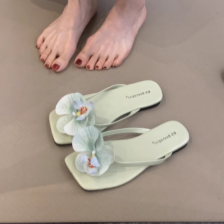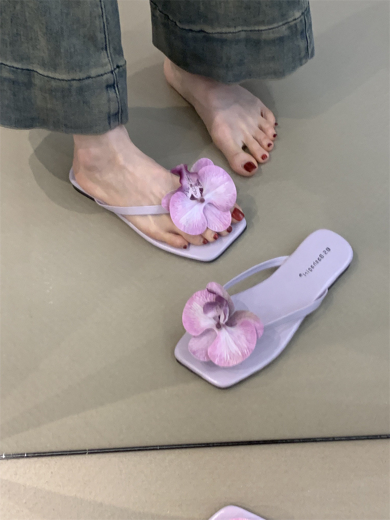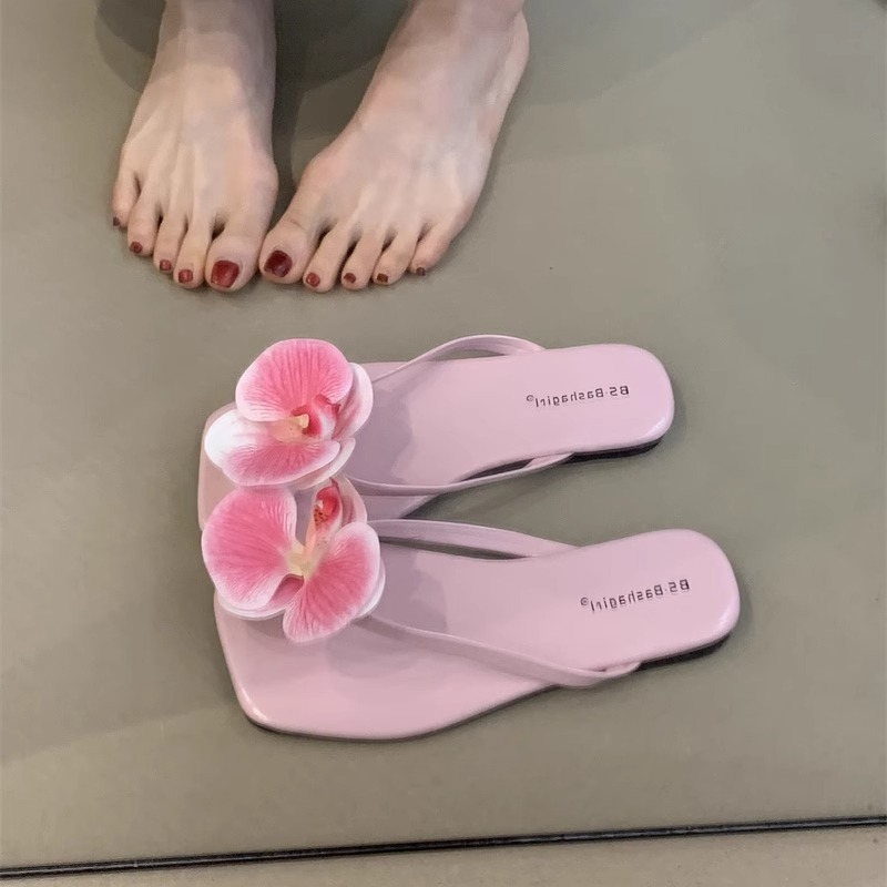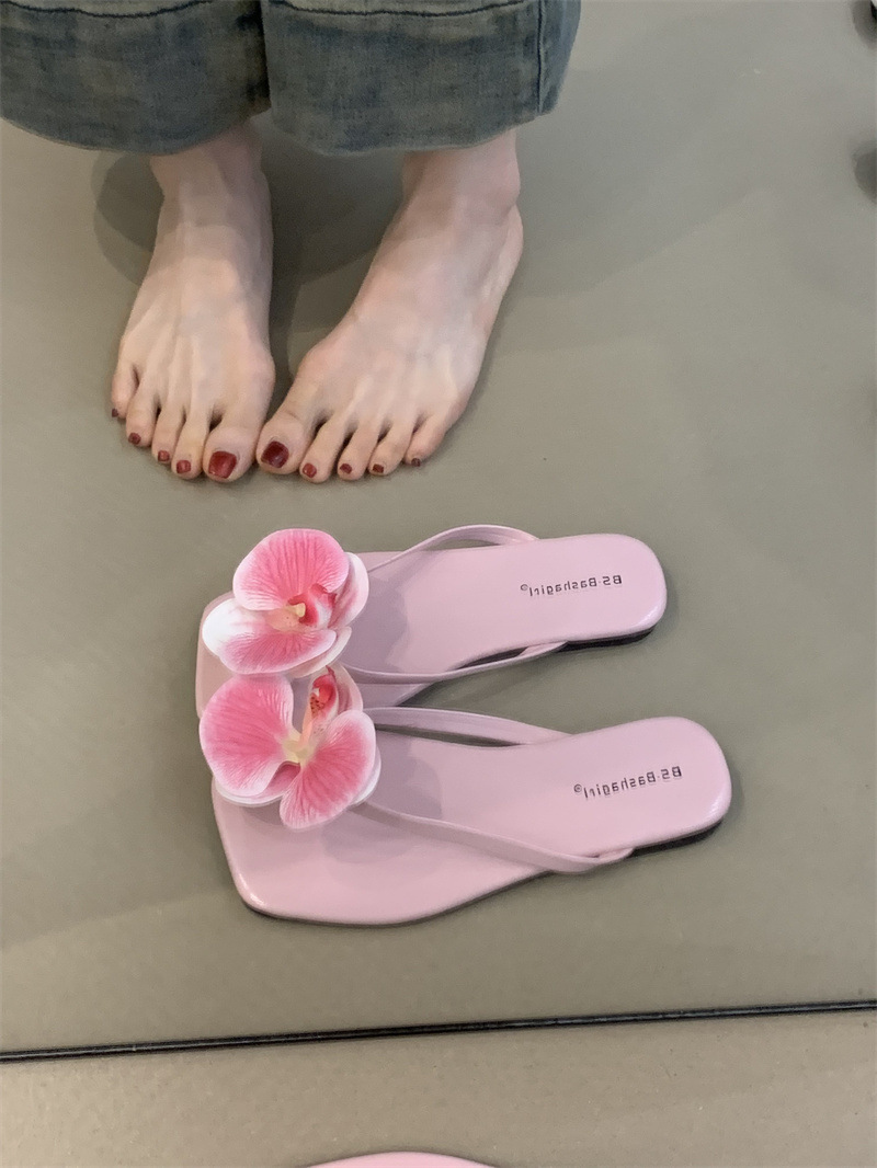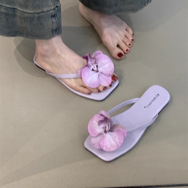 여성을위한 프랑스 부드러운 요정 샌들 여름 2025 틈새 저녁 바람 꽃잎 해변 휴가 플립 플롭