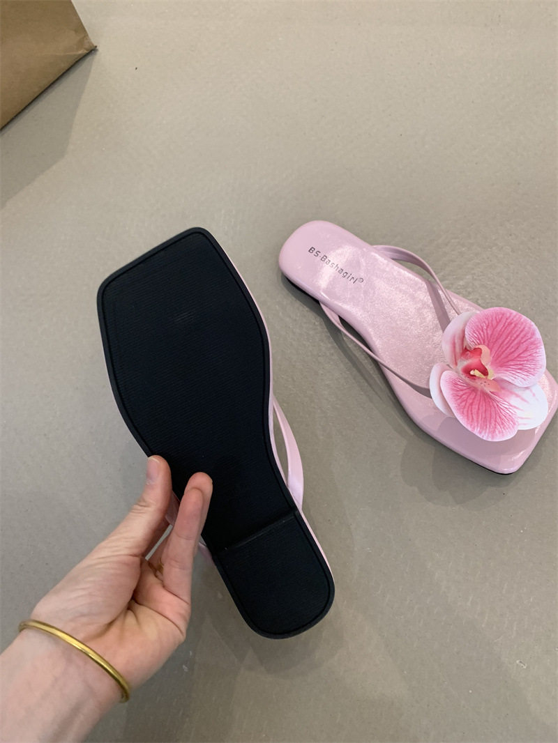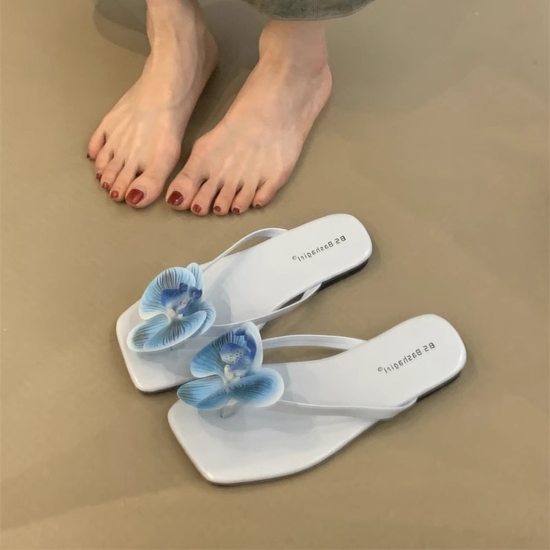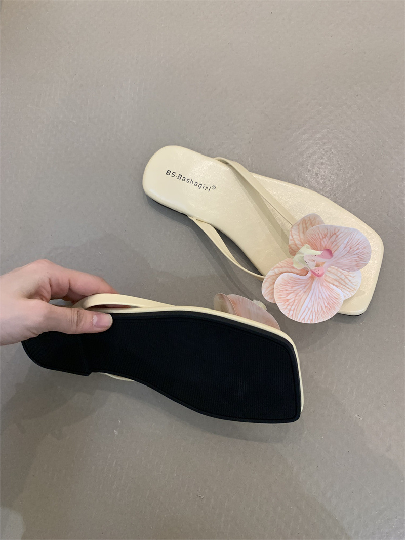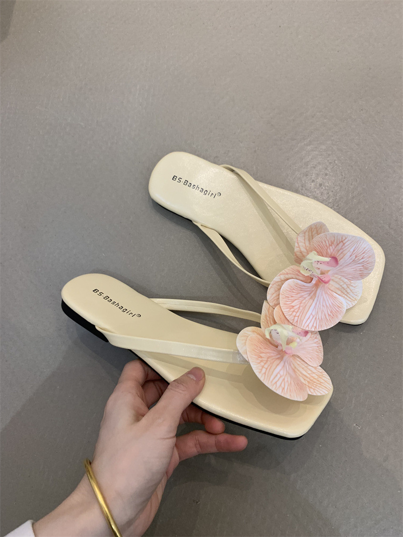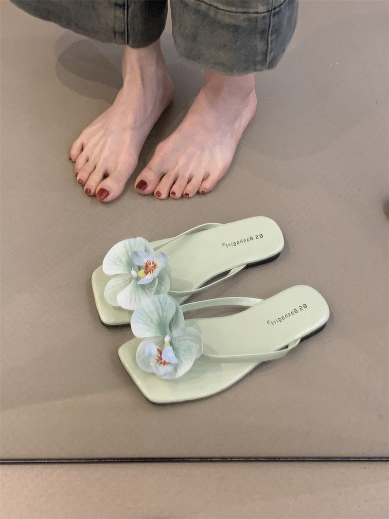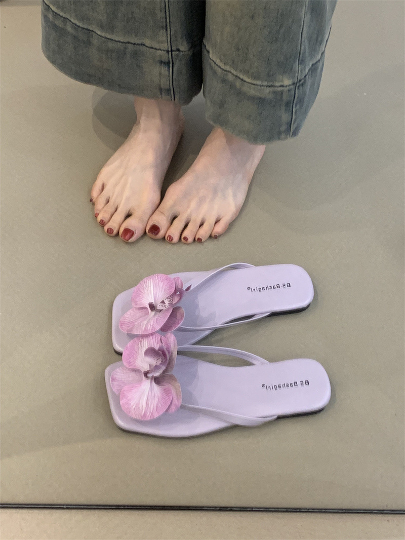 여성을위한 프랑스 부드러운 요정 샌들 여름 2025 틈새 저녁 바람 꽃잎 해변 휴가 플립 플롭