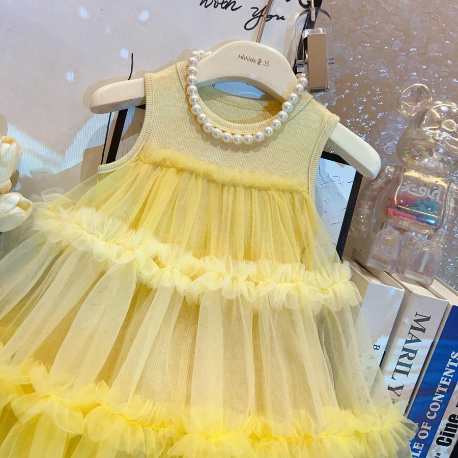 소녀의 봄과 여름 원피스 2025 새로운 한국 스타일 어린이 메쉬 스티칭 조끼 유행 외국인 스타일 공주 원피스스토어 가기