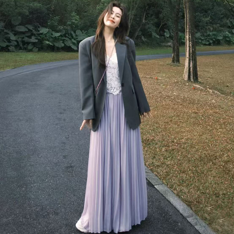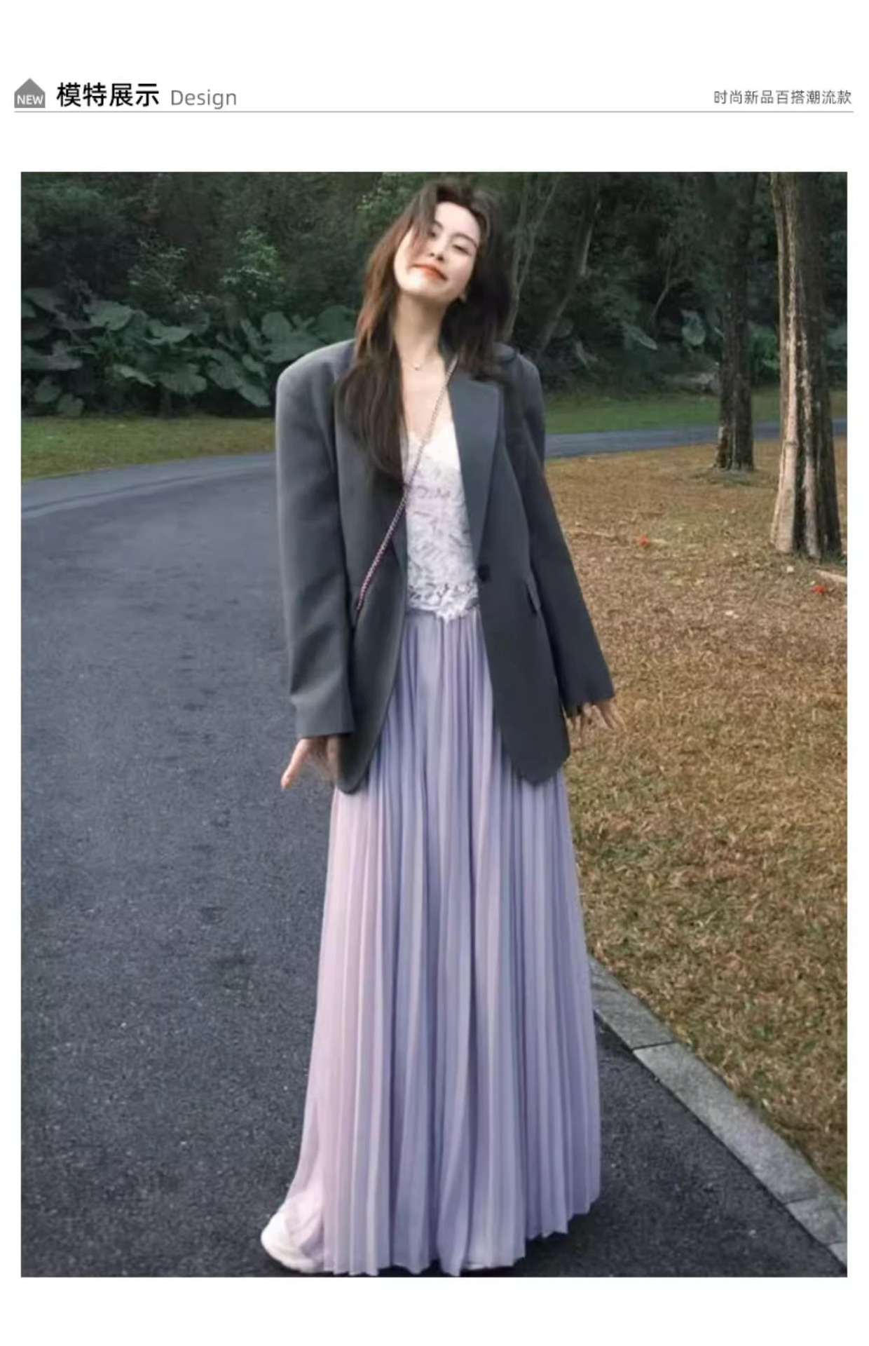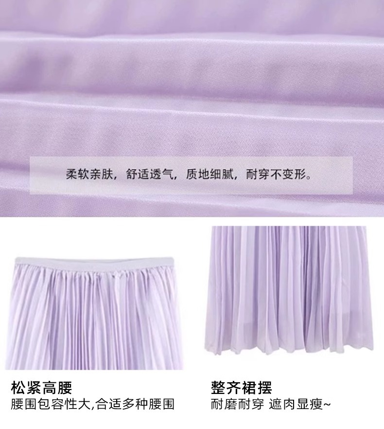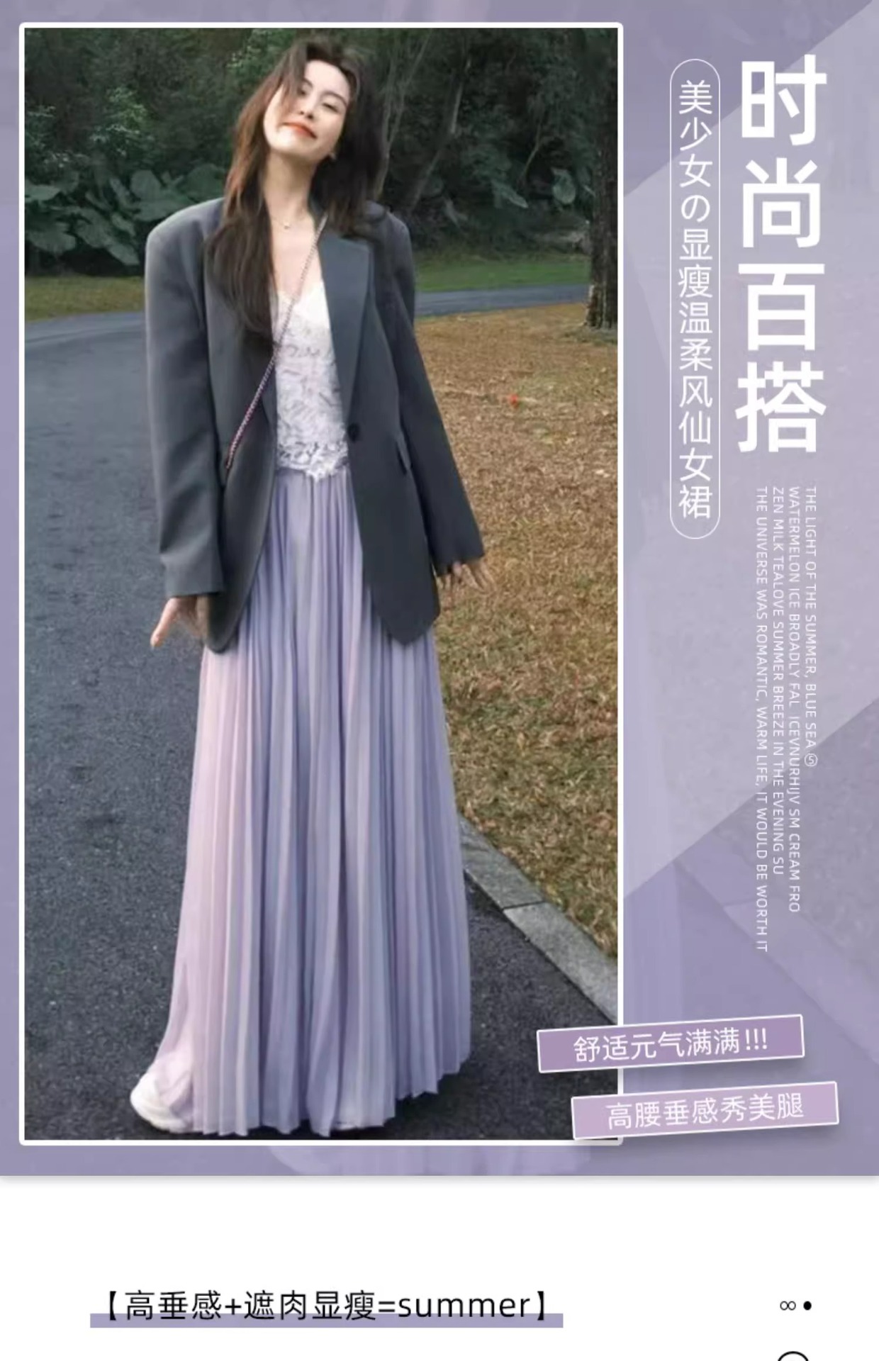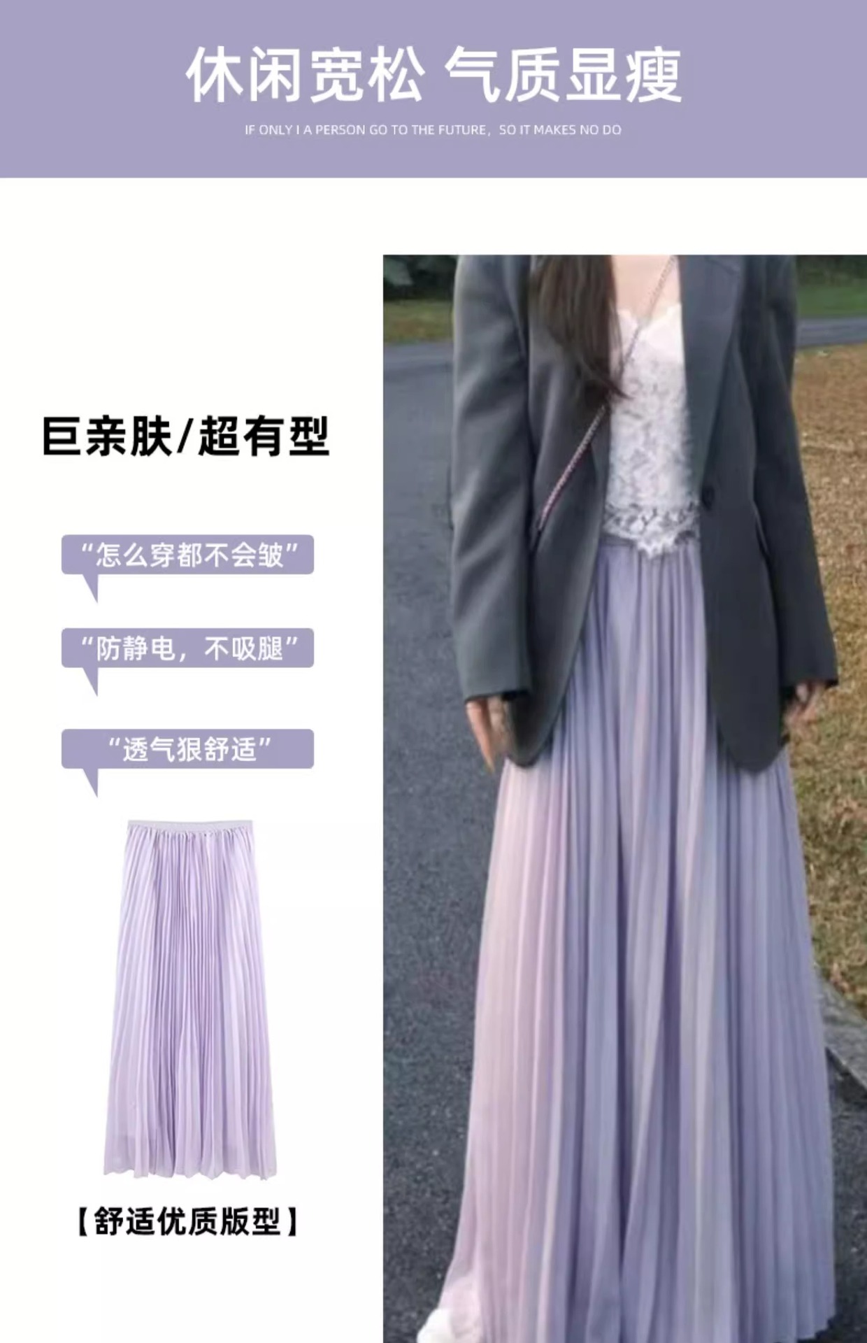 보라색 주름 치마 여성의 여름 얇은 2025 새로운 스타일 우아한 높은 허리 A 라인 거즈 스커트 작은 주름 치마스토어 가기