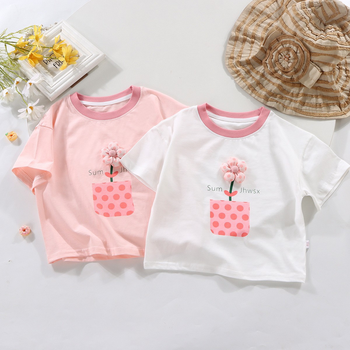 어린이 순면 반팔 2025 여름 새 베이비 탑 싱글 피스 소녀 입체 꽃 티셔츠 아동 의류 도매스토어 가기