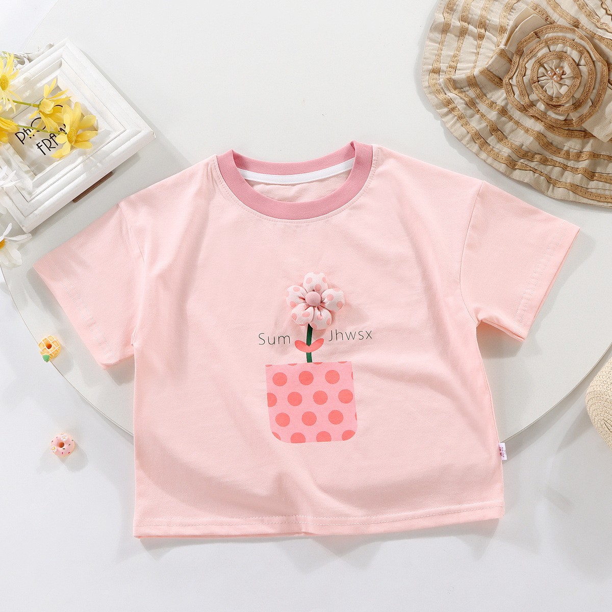 어린이 순면 반팔 2025 여름 새 베이비 탑 싱글 피스 소녀 입체 꽃 티셔츠 아동 의류 도매