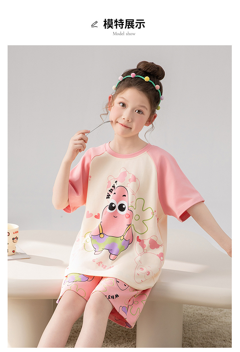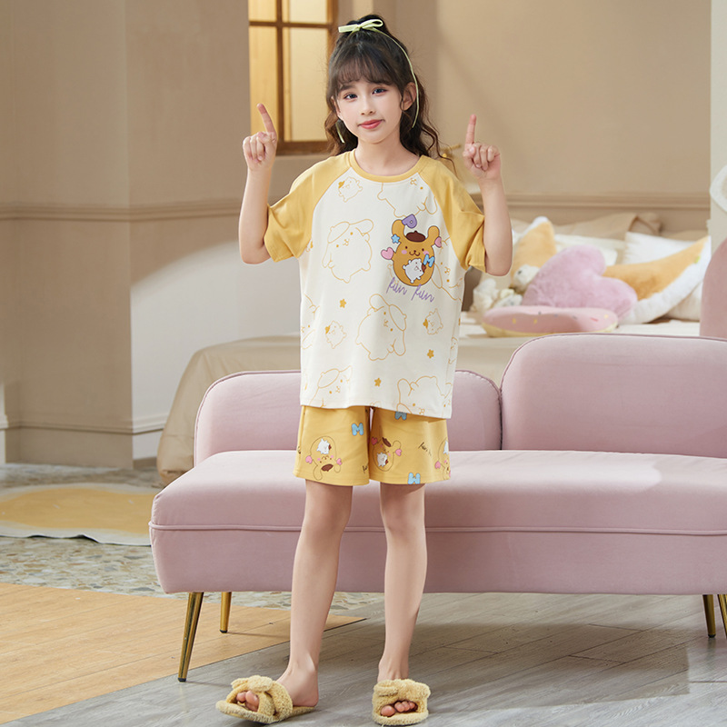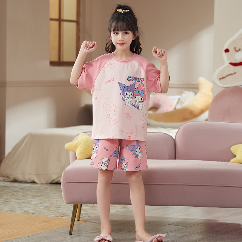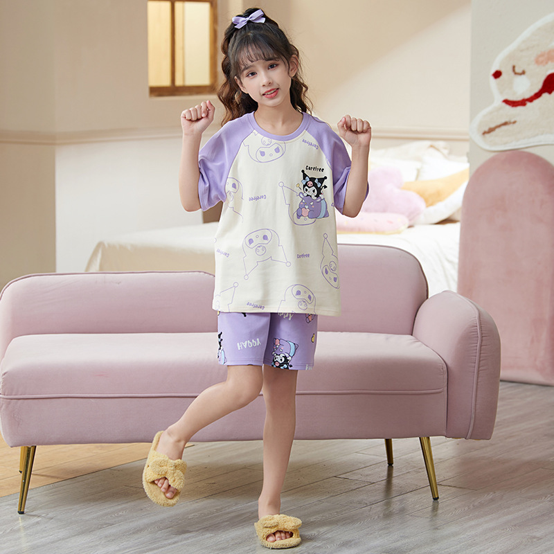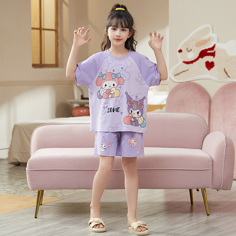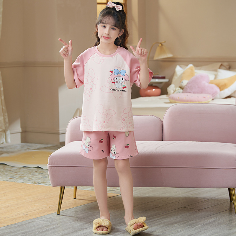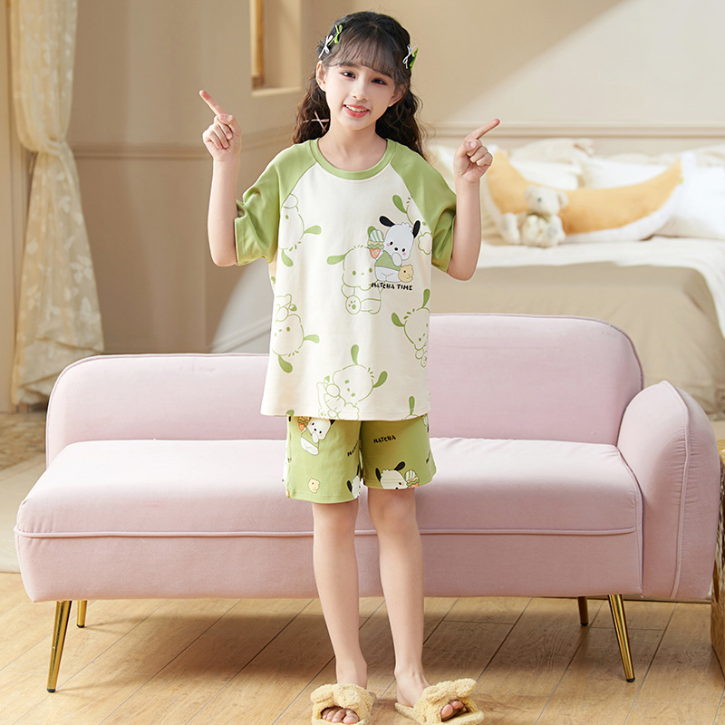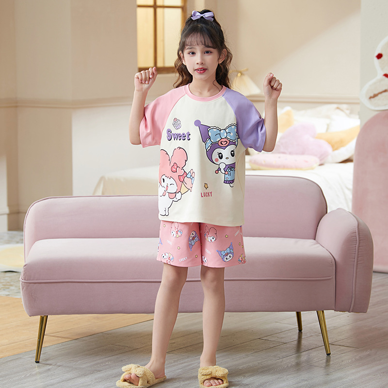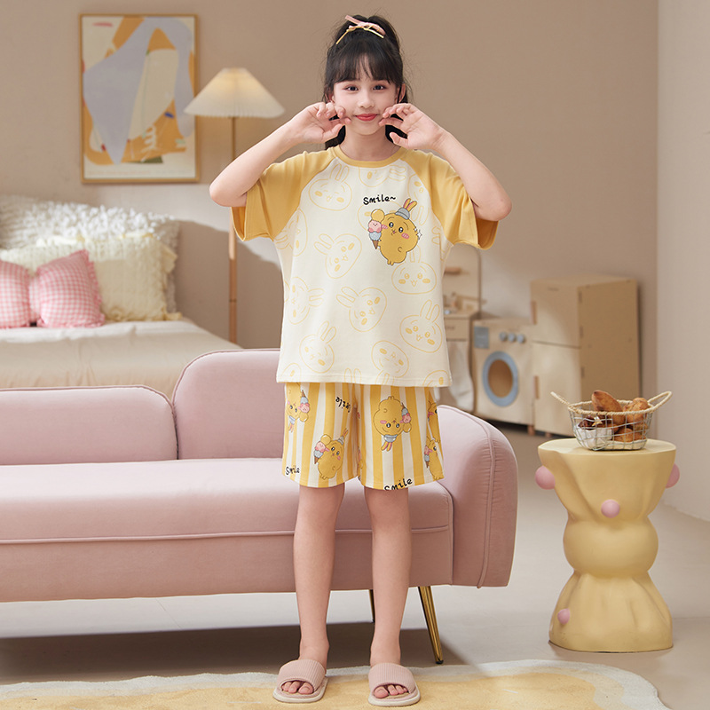 만화 귀여운 반팔 반바지 소녀 잠옷 여름 얇은 스타일은 작은, 중간 및 큰 어린이와 소녀를위한 캐주얼 가정복 외부에 착용 가능