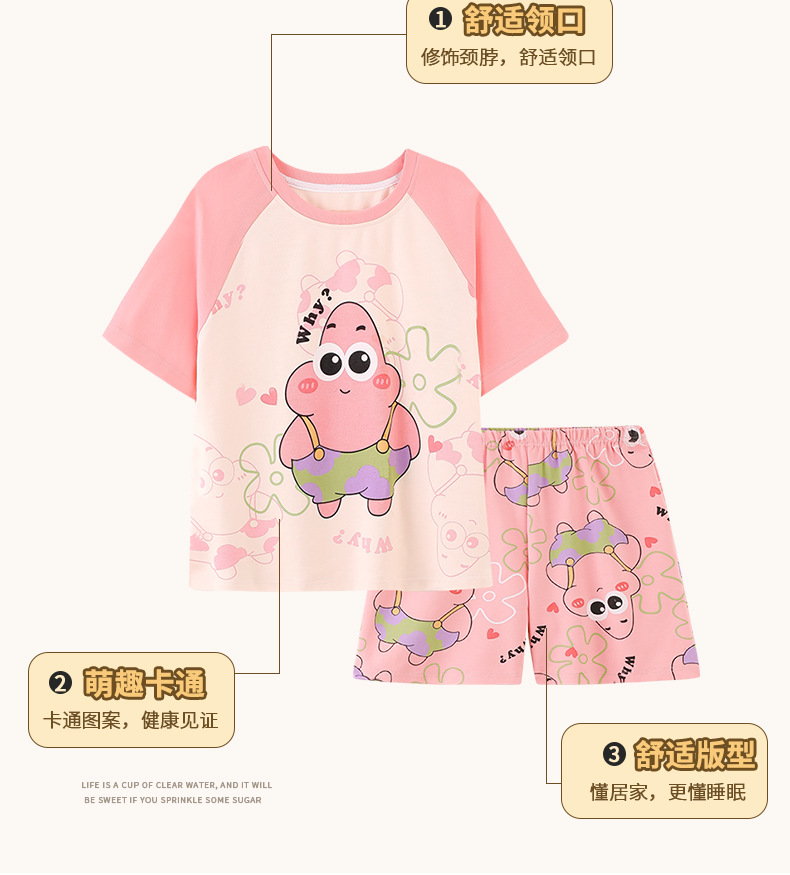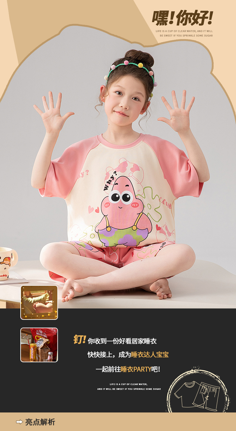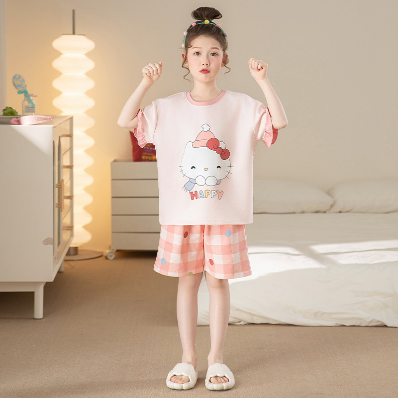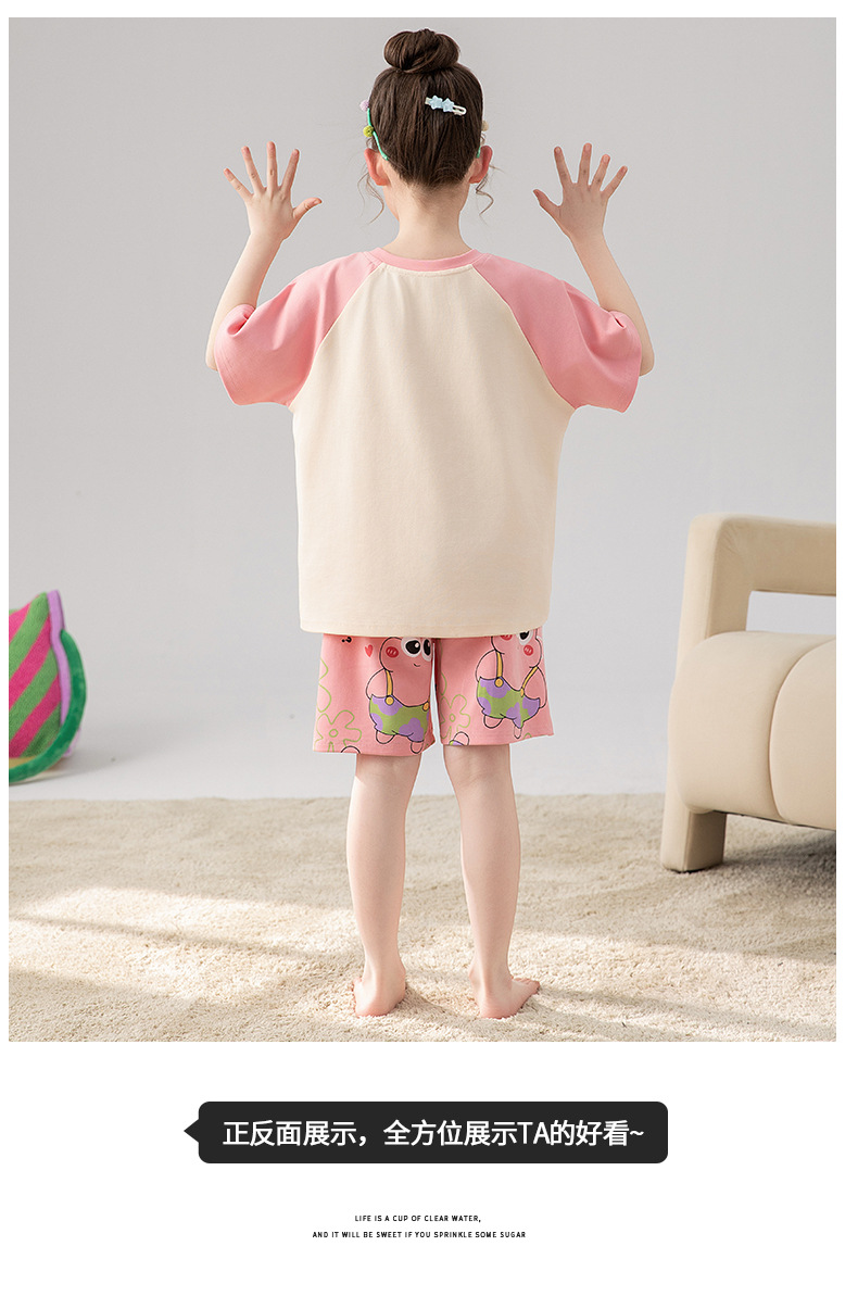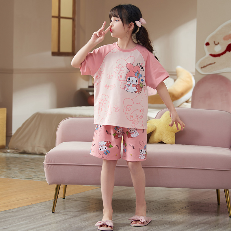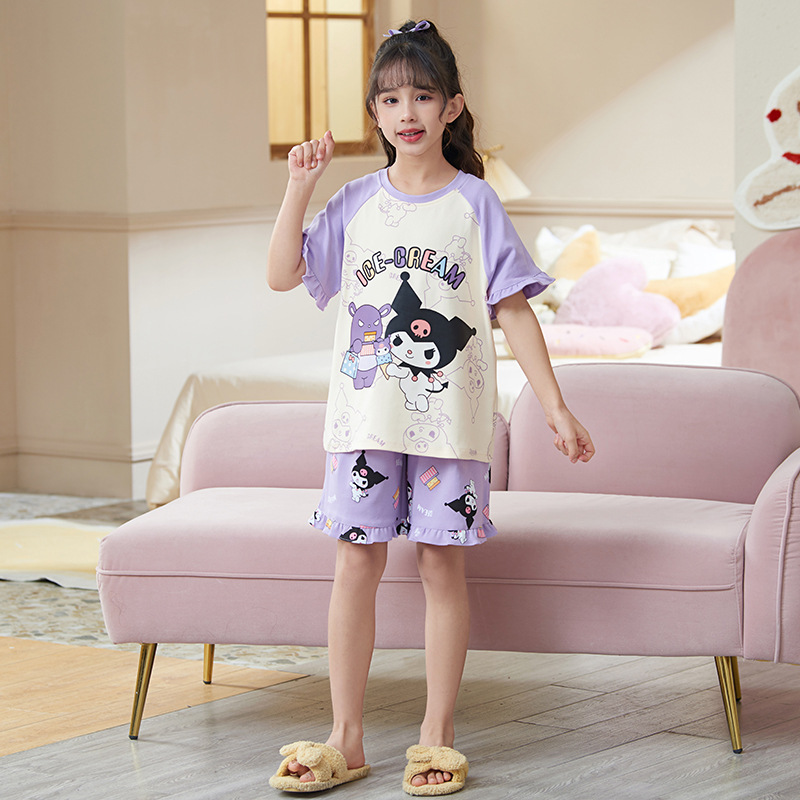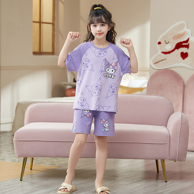 만화 귀여운 반팔 반바지 소녀 잠옷 여름 얇은 스타일은 작은, 중간 및 큰 어린이와 소녀를위한 캐주얼 가정복 외부에 착용 가능
