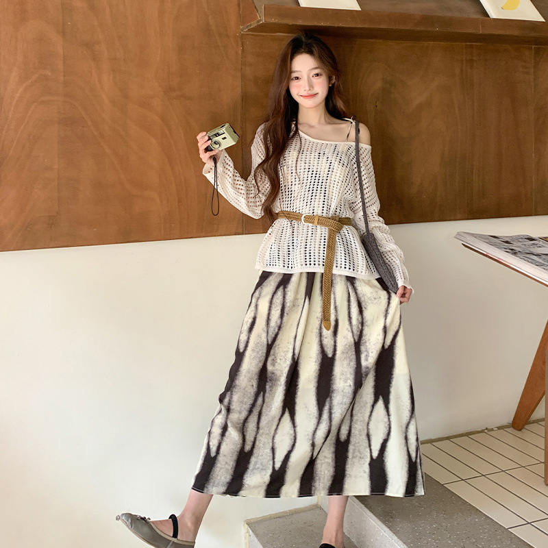 리얼 샷 2025 새로운 유행 부드러운 게으른 스타일 주의 기계 오픈 숄더 할로우 아웃 블라우스 투피스 슬립 스커트스토어 가기