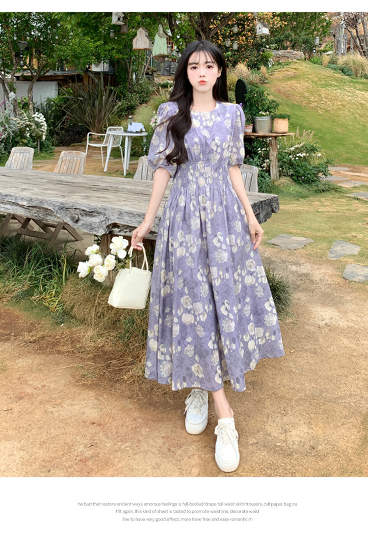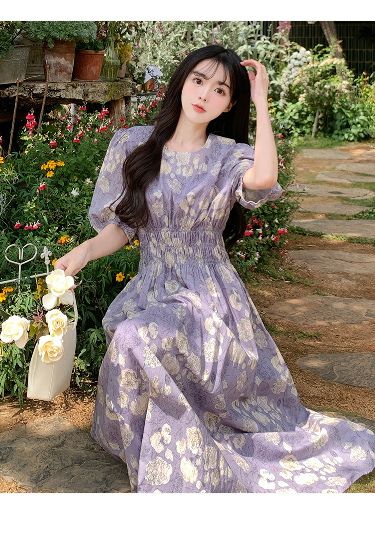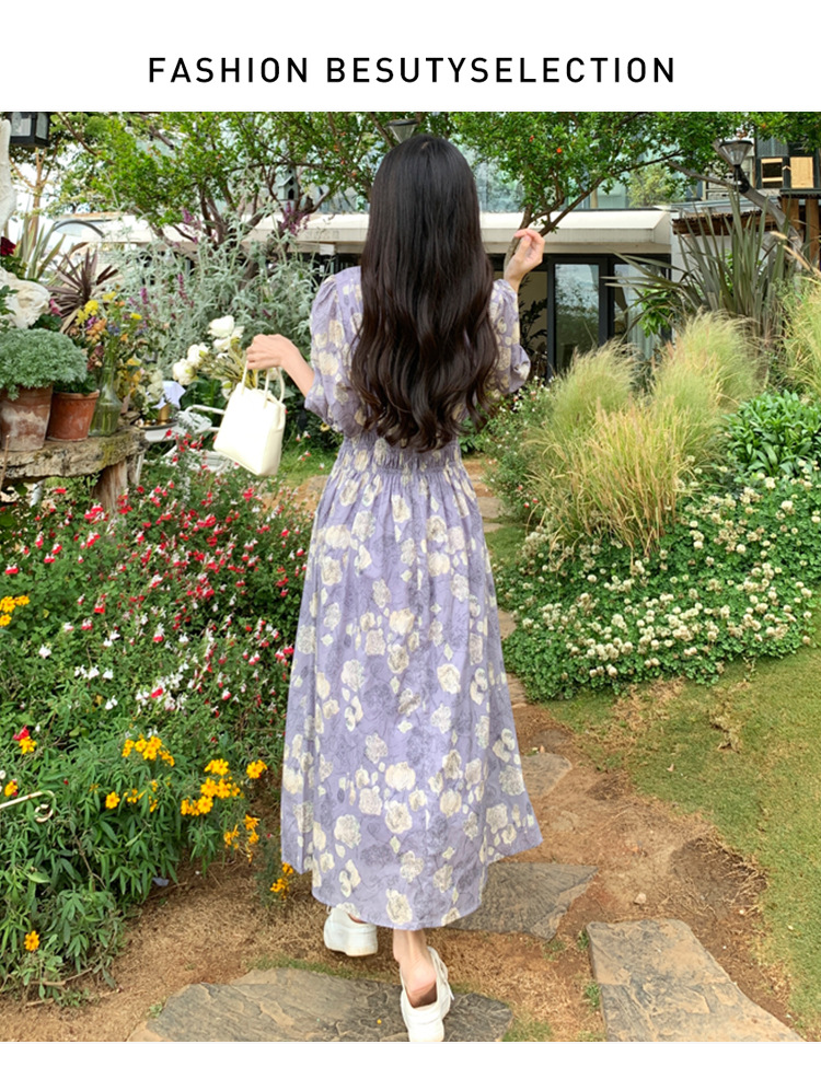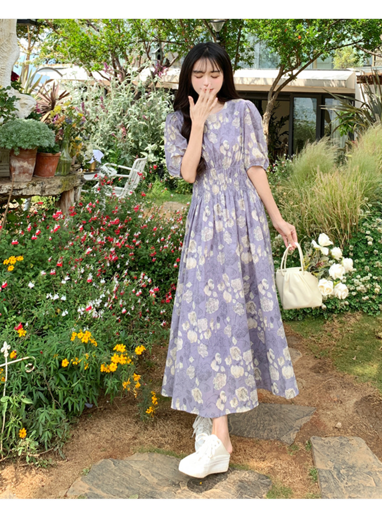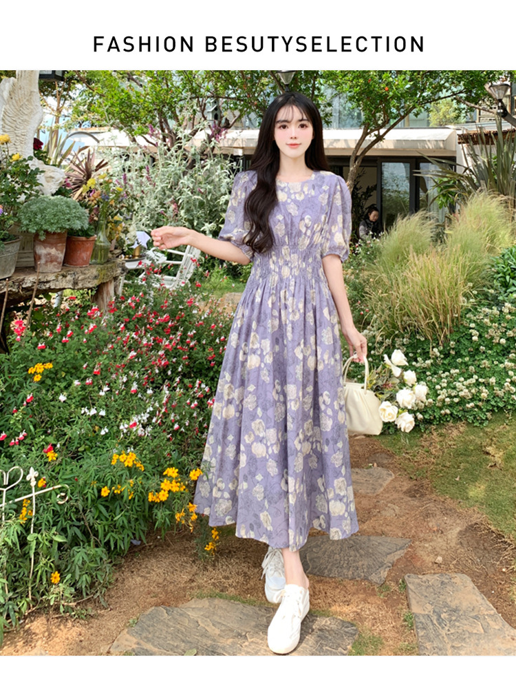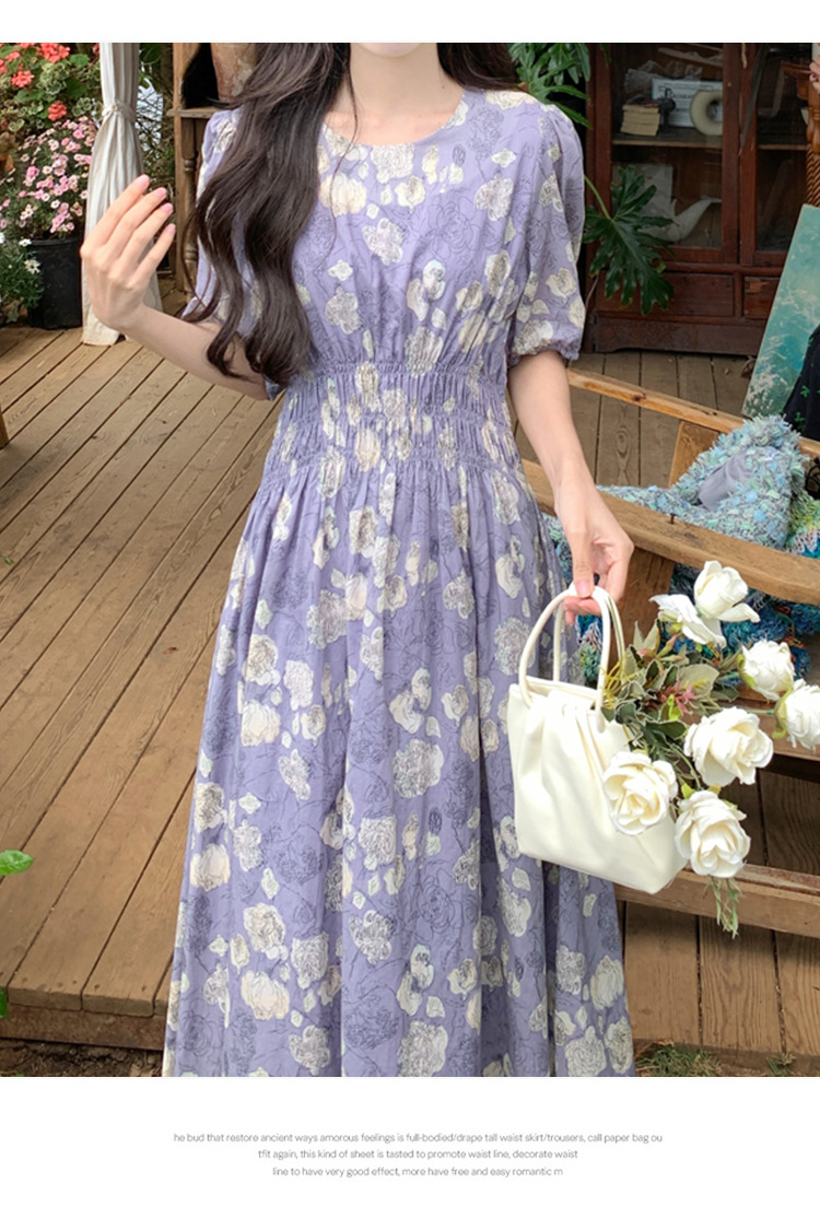 프랑스 스타일 레트로 꽃 원피스 여성용 타이트 허리 슬리밍 반팔 한국식 보라색 롱 원피스 퍼플 원피스 트렌디