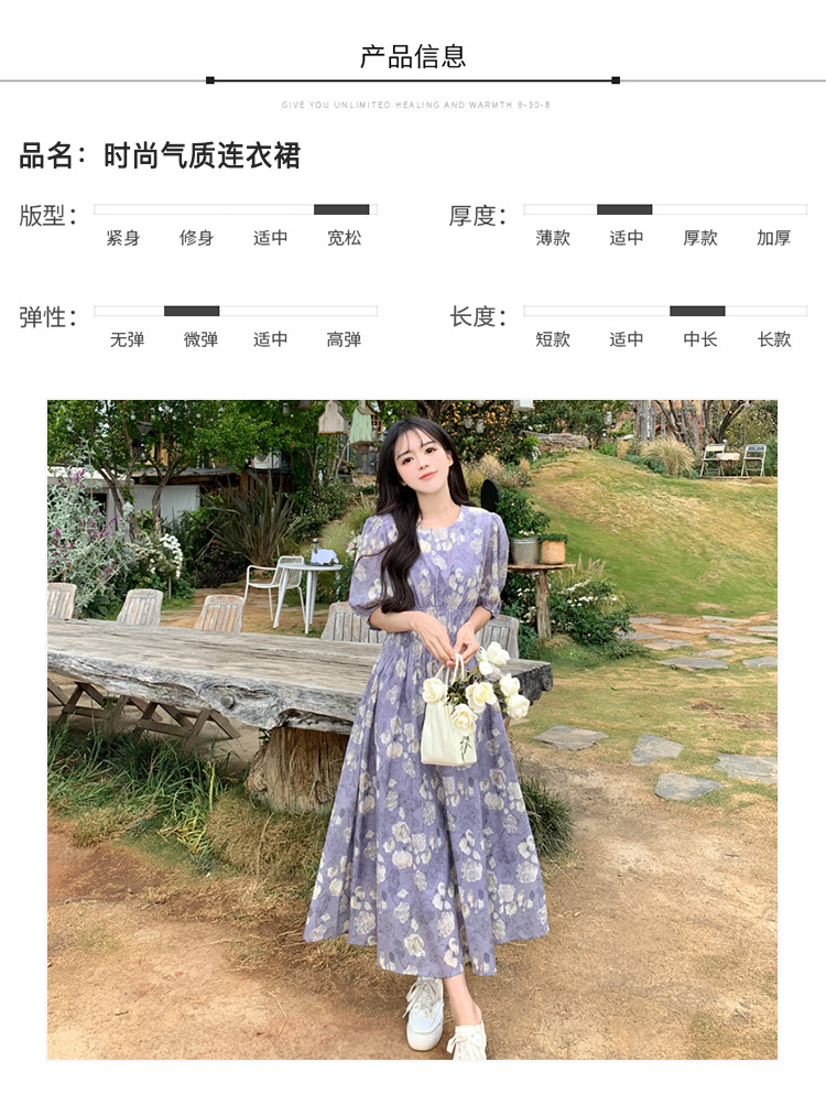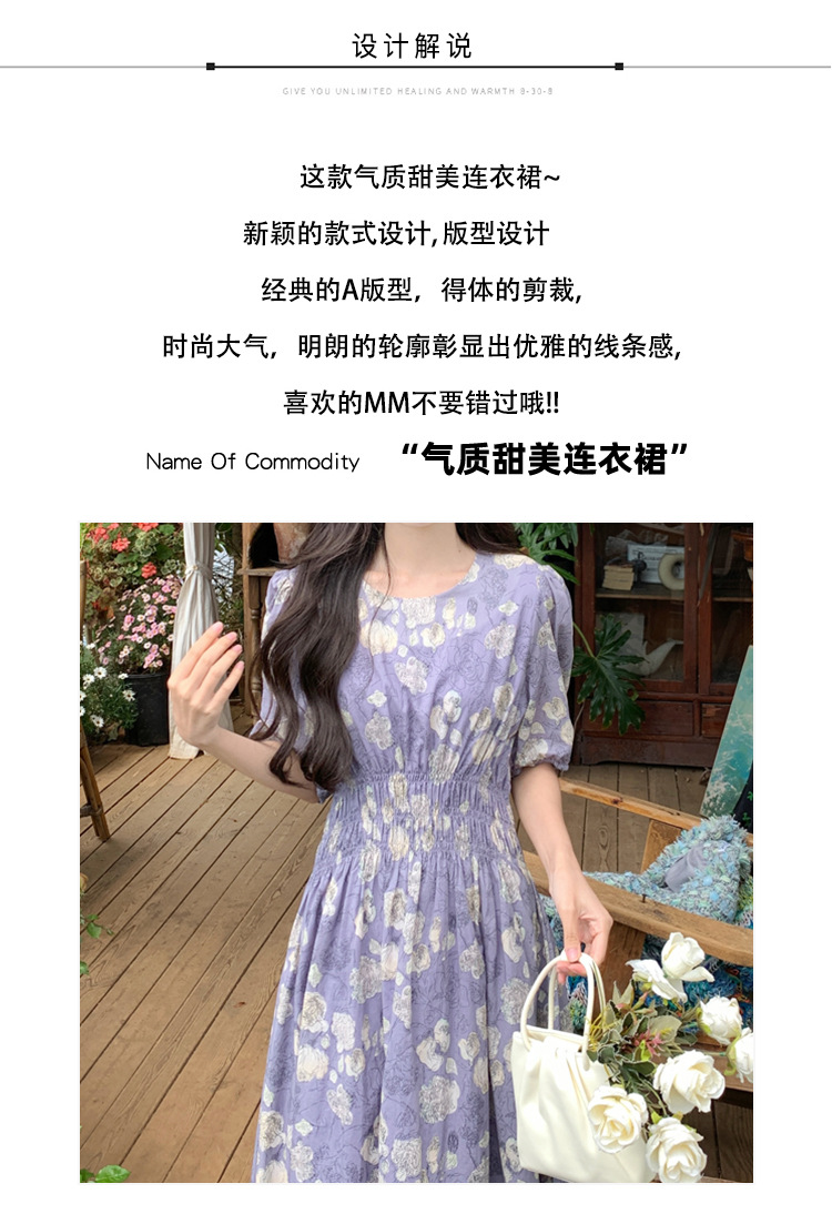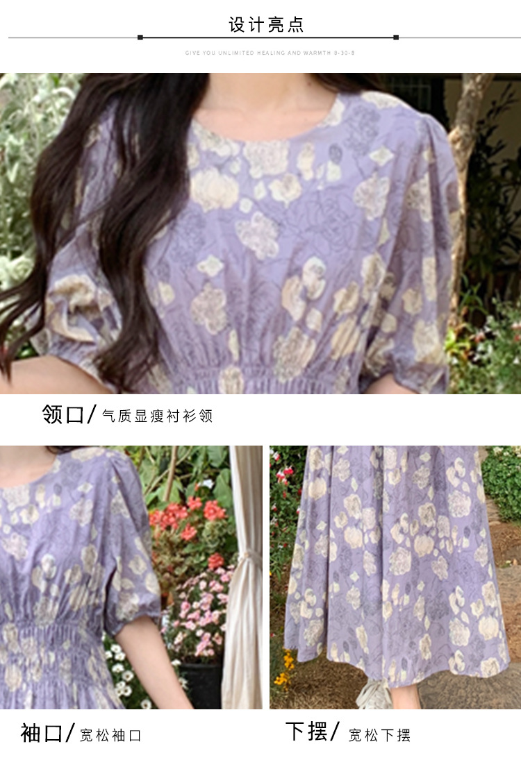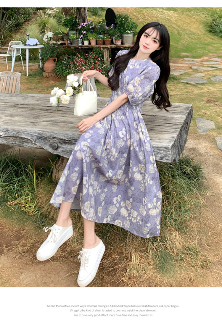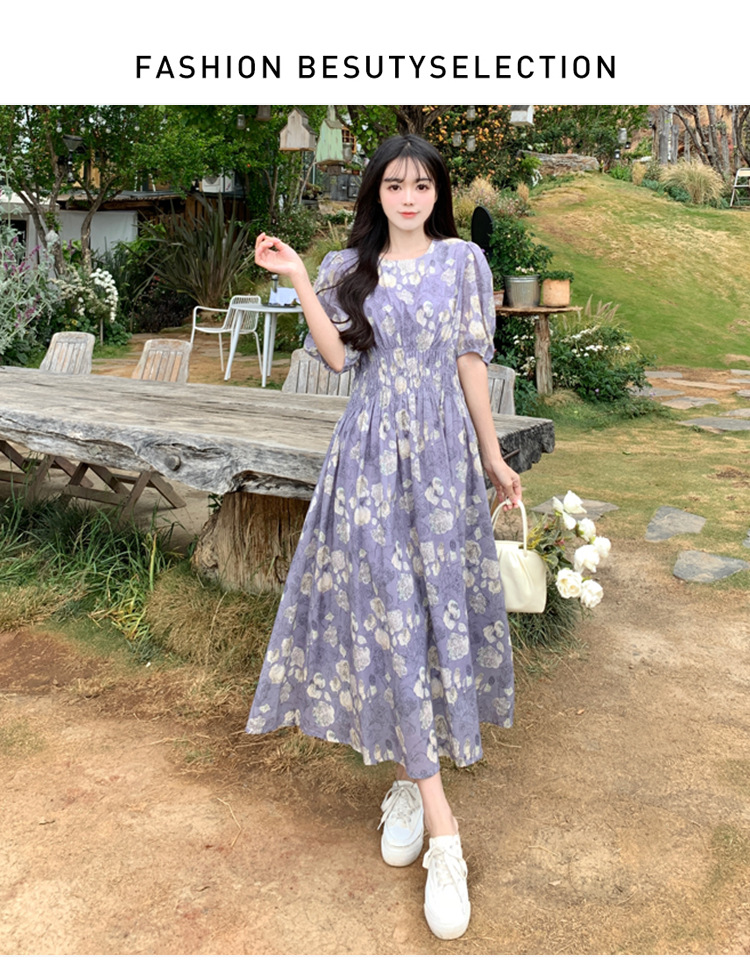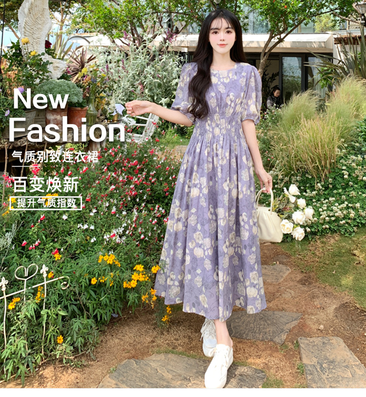 프랑스 스타일 레트로 꽃 원피스 여성용 타이트 허리 슬리밍 반팔 한국식 보라색 롱 원피스 퍼플 원피스 트렌디