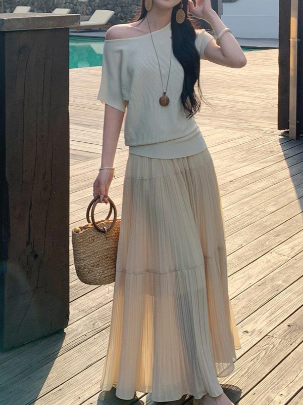 히비스커스 어깨가 노출 된 반팔 티셔츠 솔리드 컬러 올 매치 슬림 핏 슬림 핏 탑 여성용 스커트 세트 순수 우아함