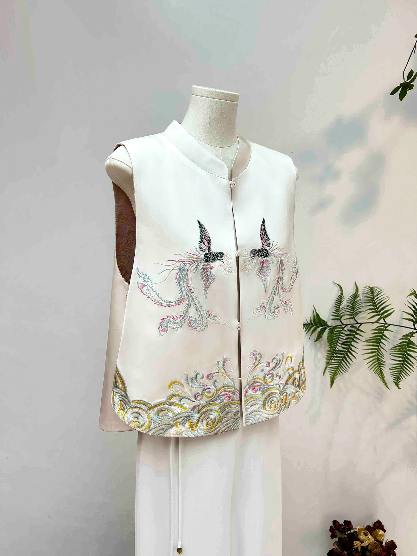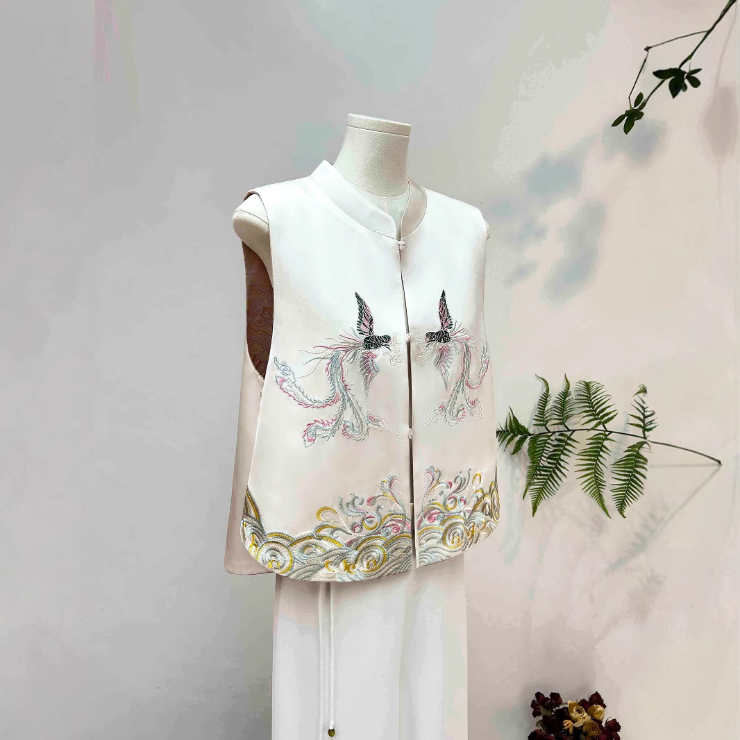 새로운 중국 스타일 피닉스 양면 착용 조끼 여성 봄과 여름 2025 새로운 국가 스타일 수직 칼라 젊은 연령 감소 조끼
