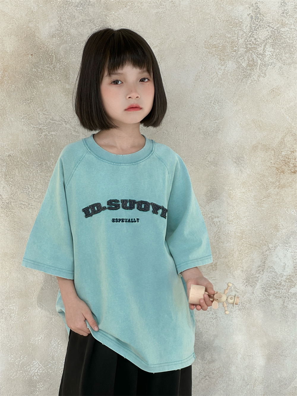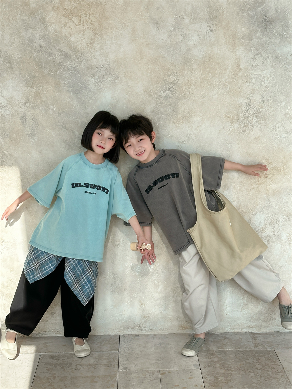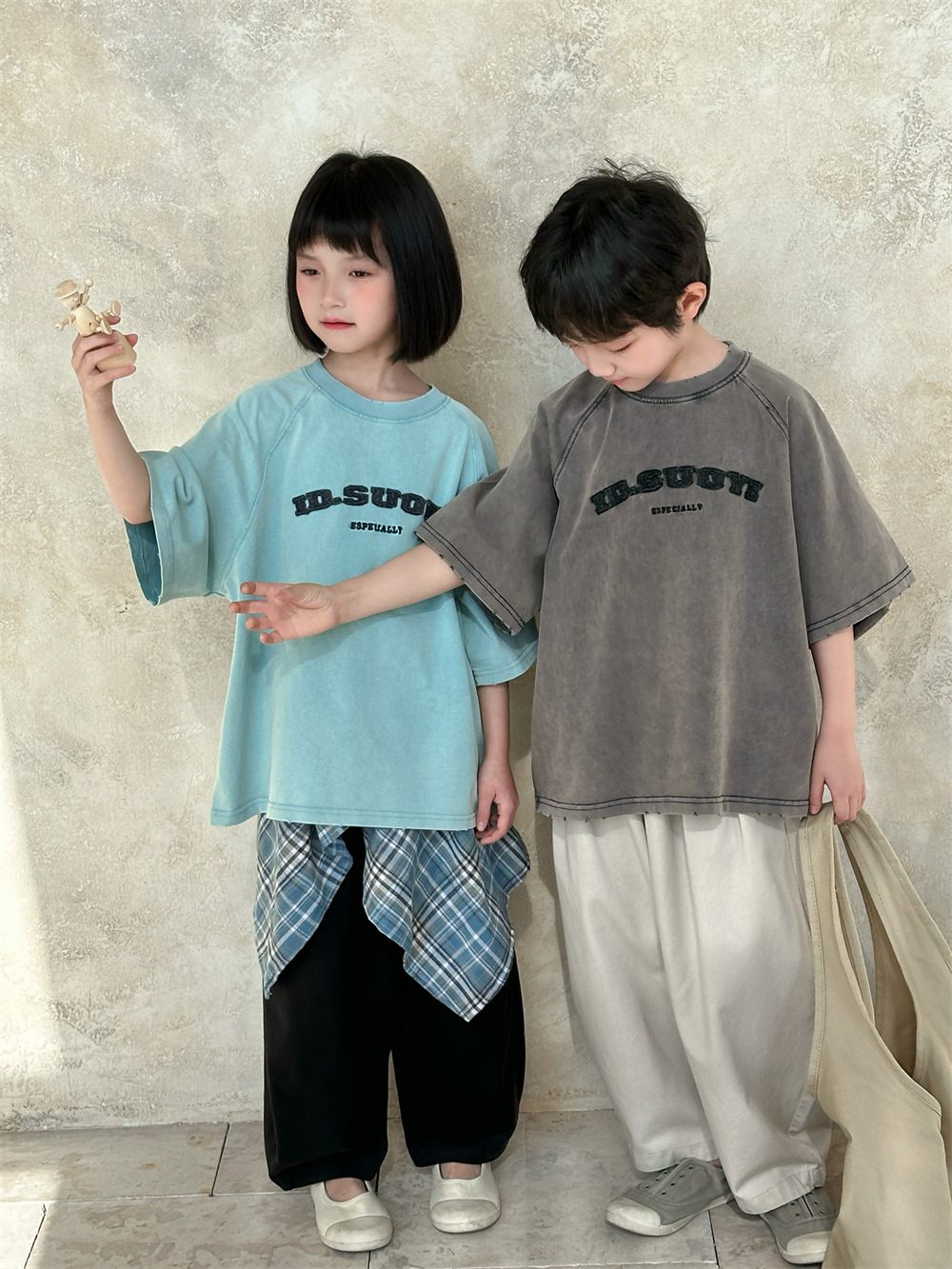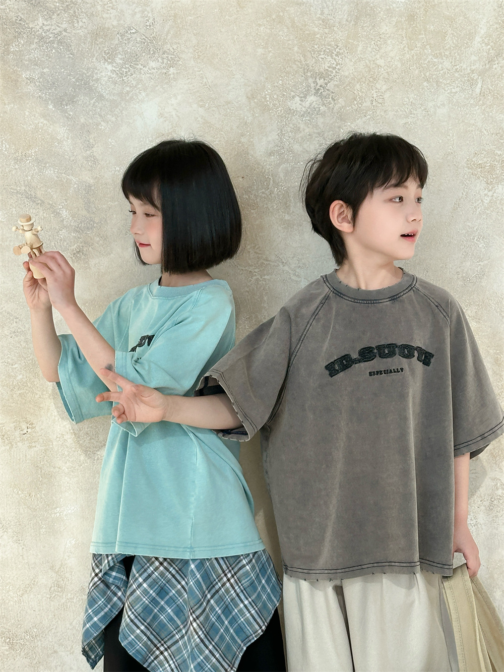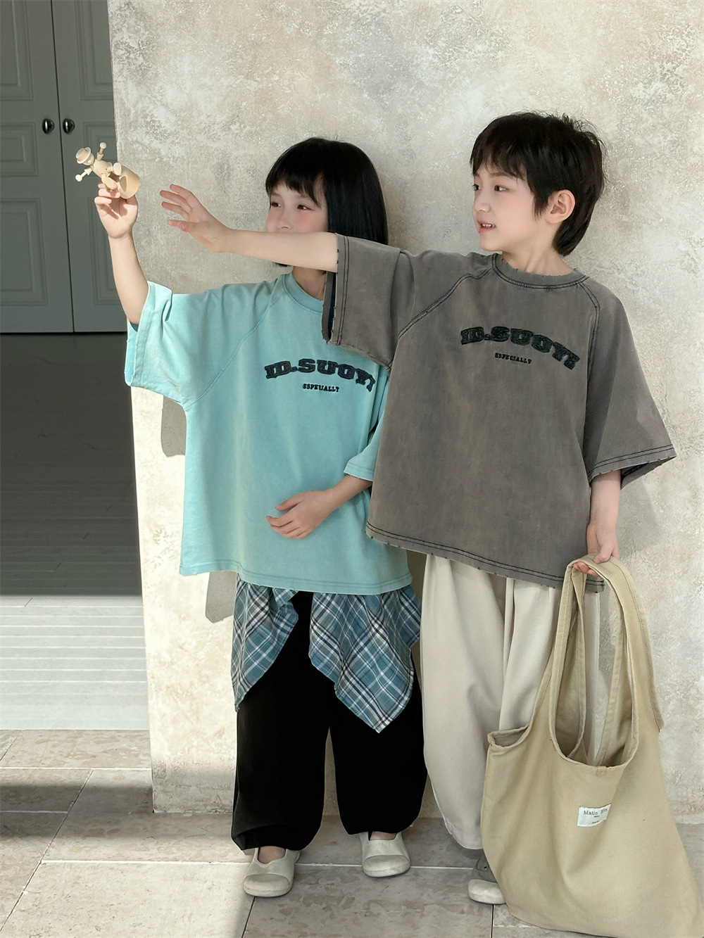 2025 새로운 여름 한국 스타일 어린이 올드 레터 반팔 소년과 소녀 패션 느슨한 유행 멋진 티셔츠 탑스토어 가기
