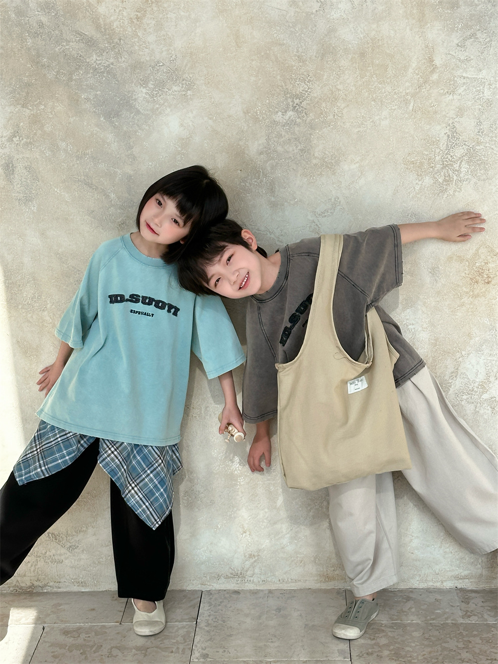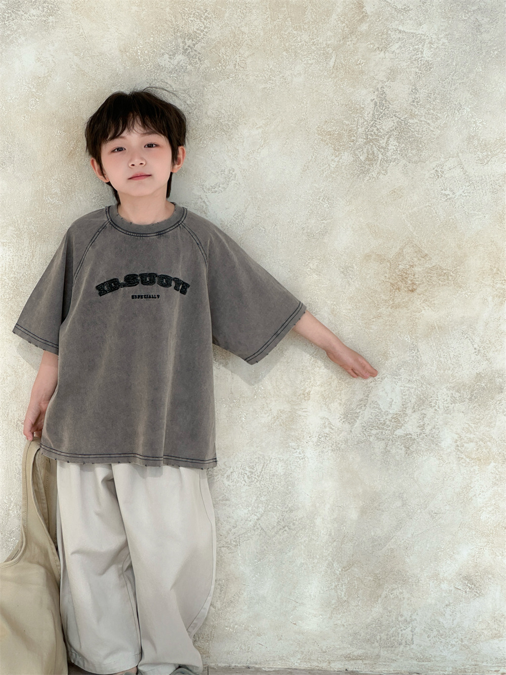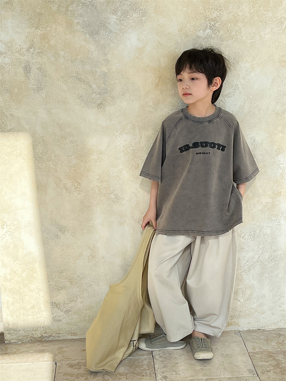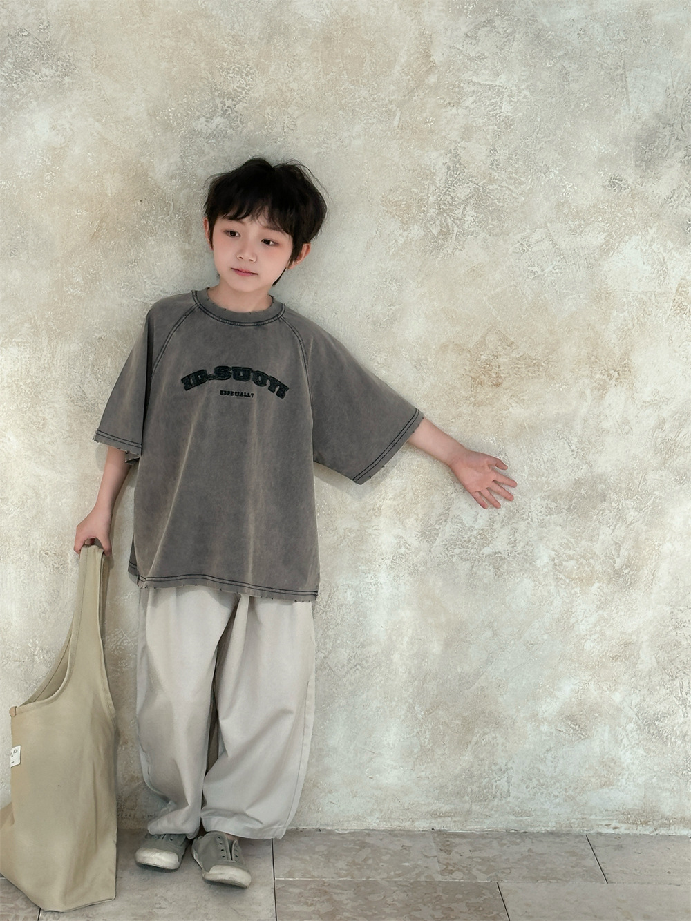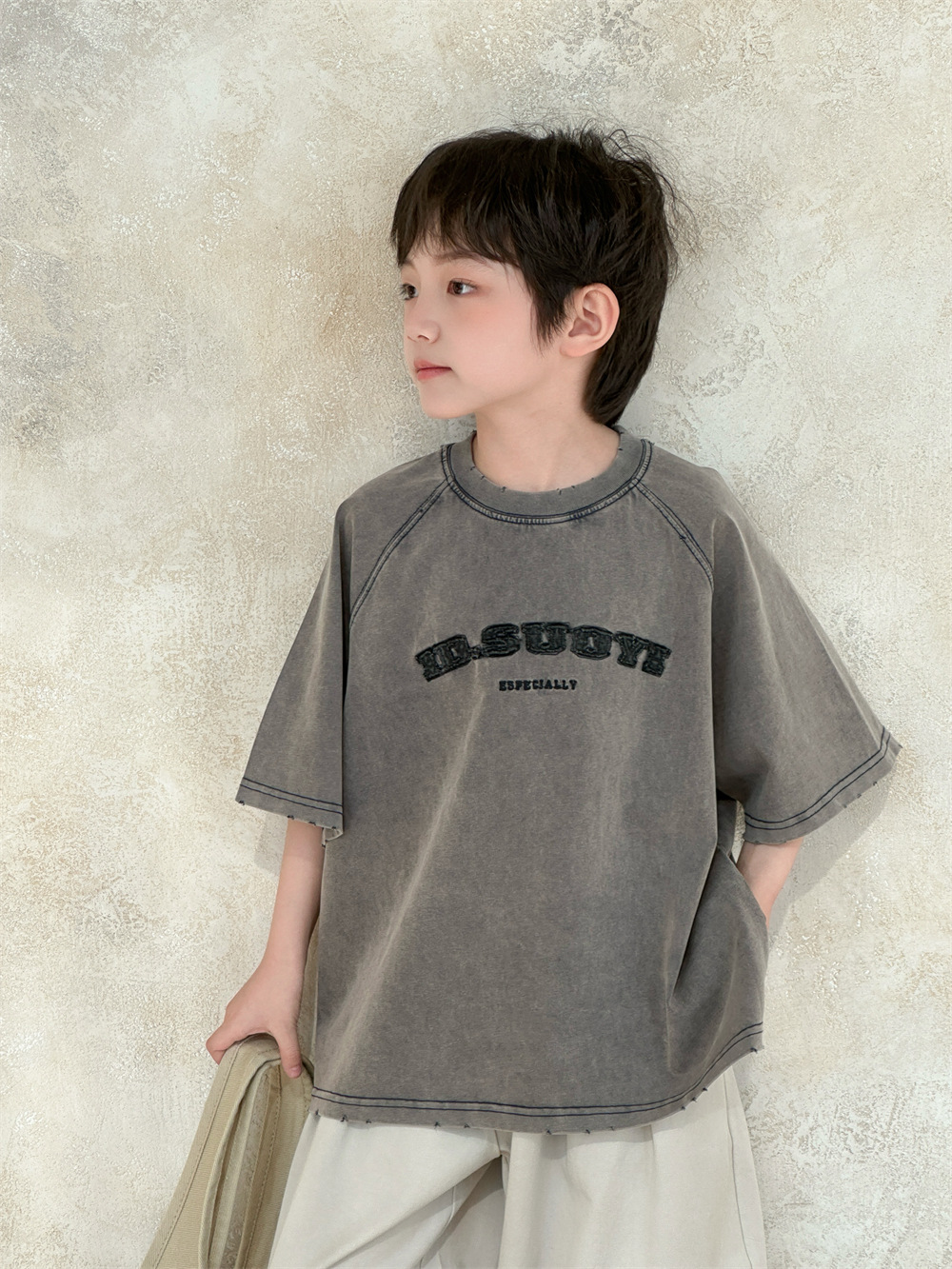 2025 새로운 여름 한국 스타일 어린이 올드 레터 반팔 소년과 소녀 패션 느슨한 유행 멋진 티셔츠 탑스토어 가기