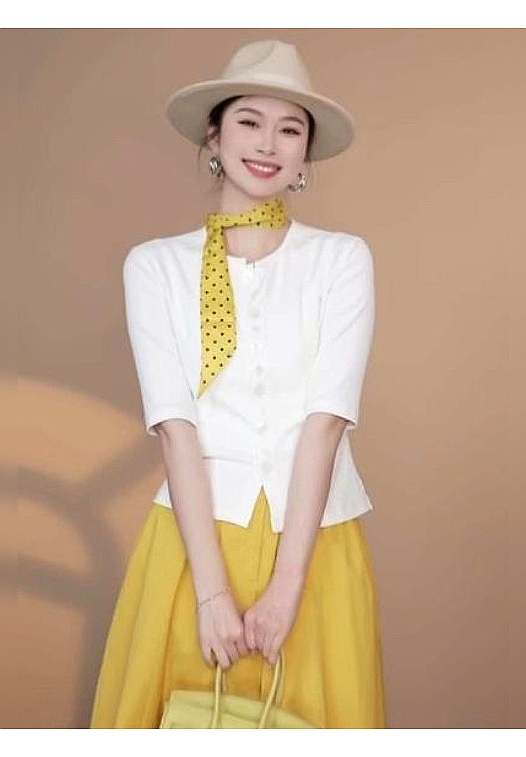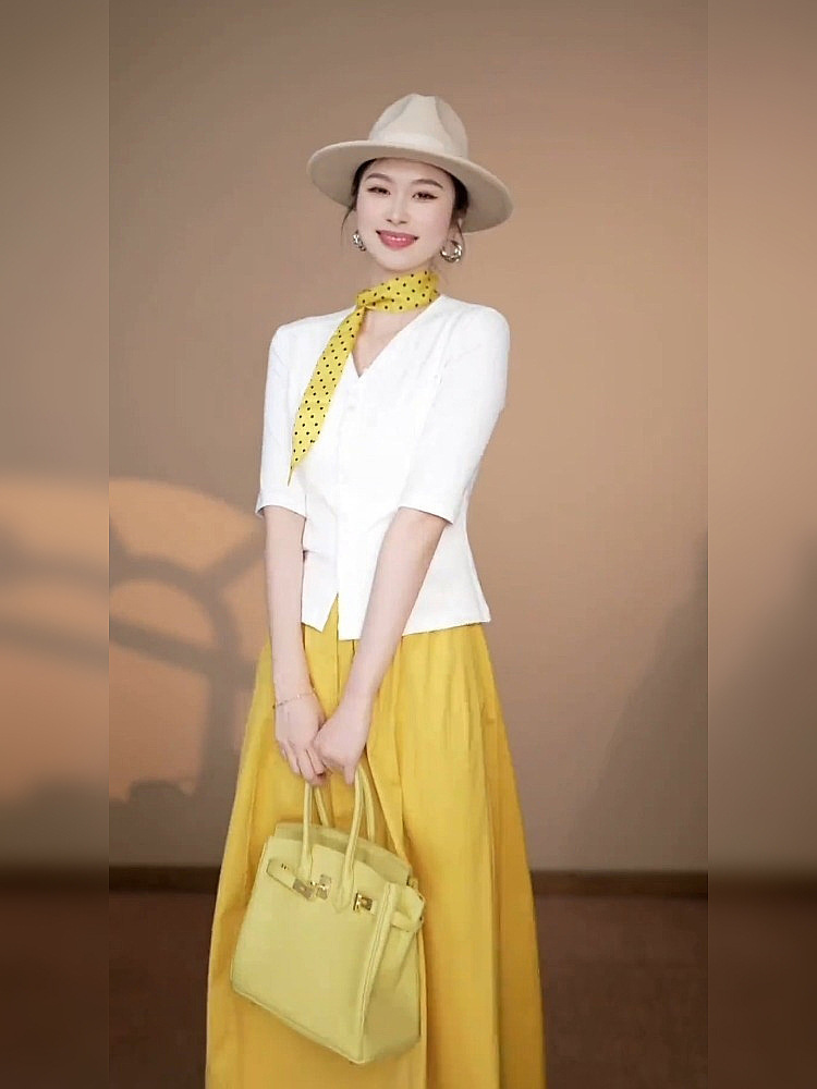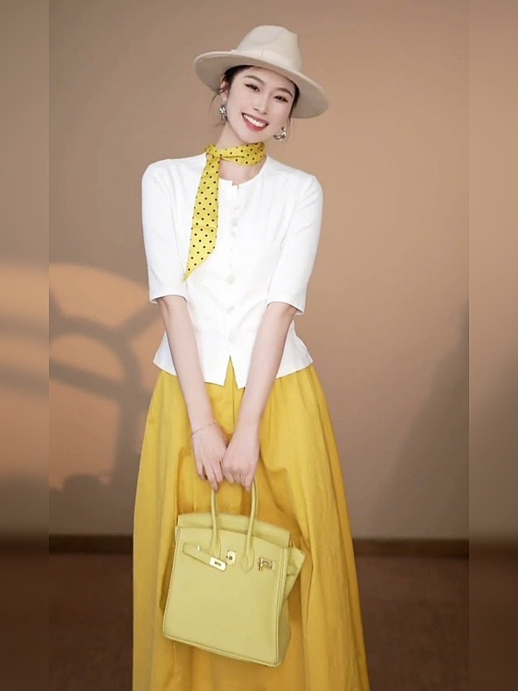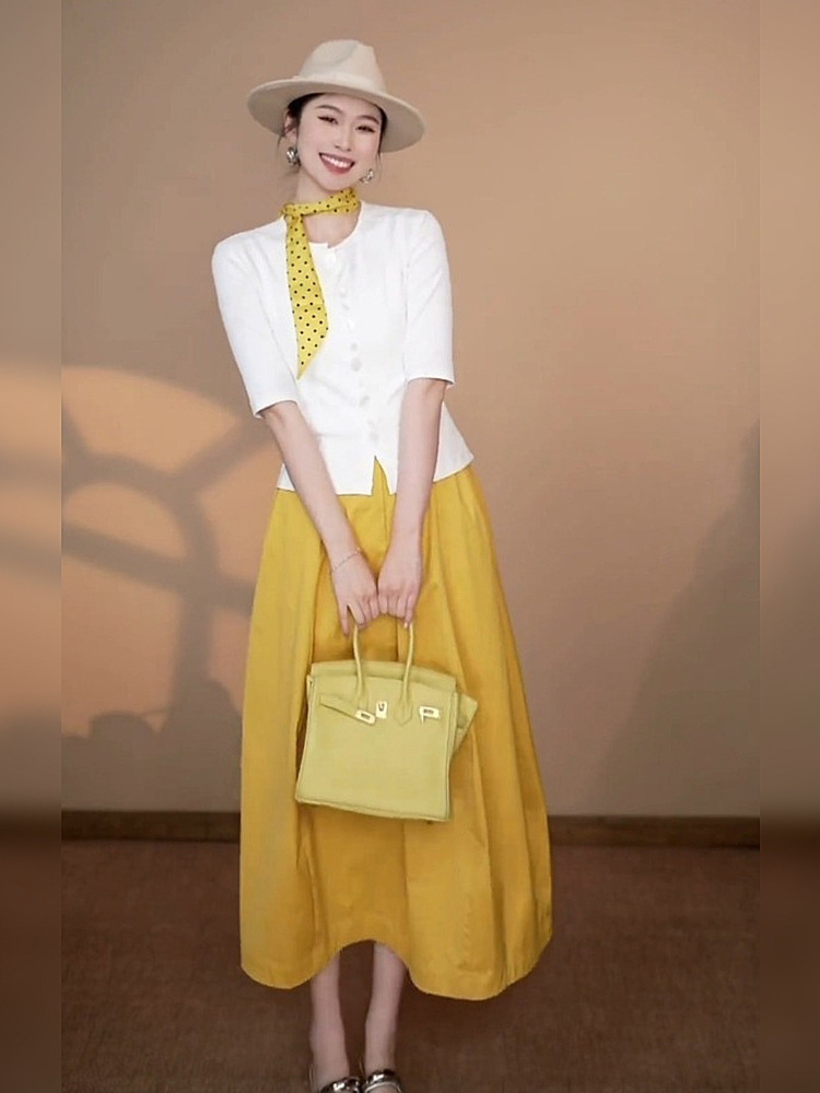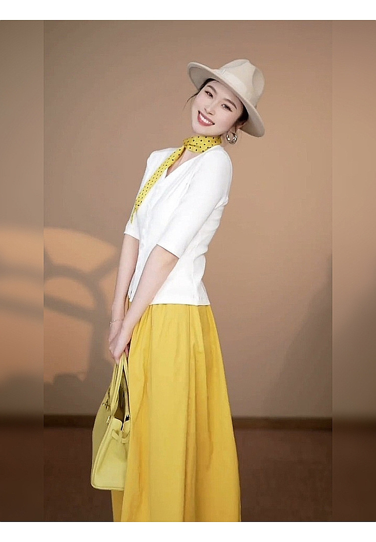 독특한 기질을 착용하는 하이 엔드 틈새 비 범핑 배 모양의 그림 아름다운 노란색 스커트 투피스 세트 여름 원피스스토어 가기