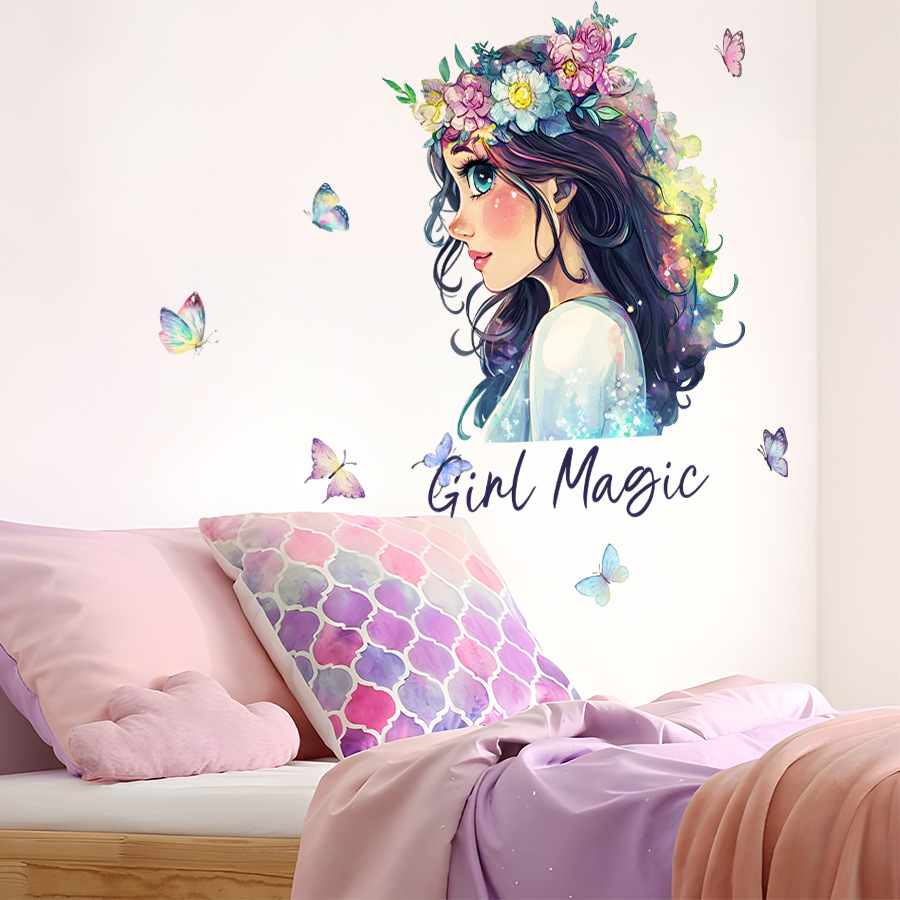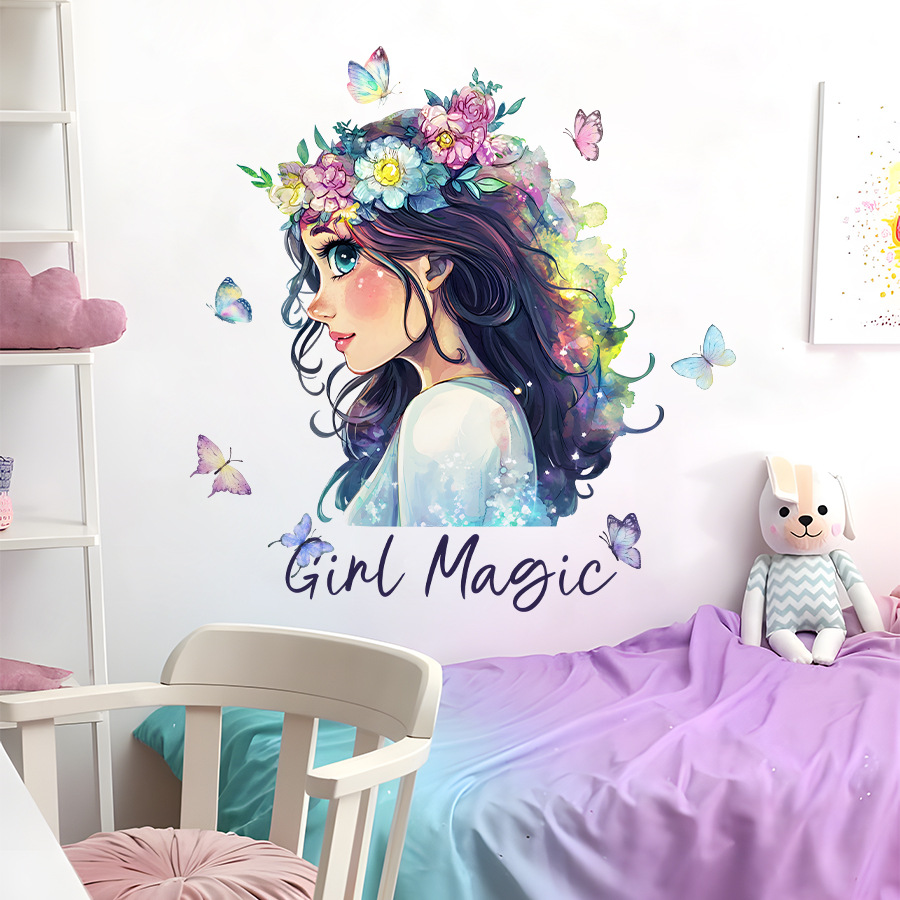 HS3710Q 아름다운 화환 소녀의 측면 만화 자체 접착 애니메이션 벽 스티커 침실 어린이 방 장식 스티커
