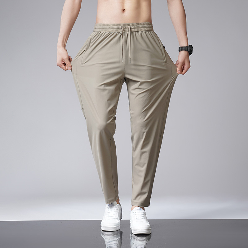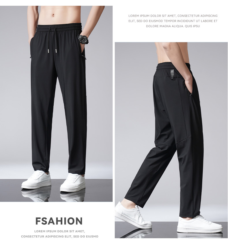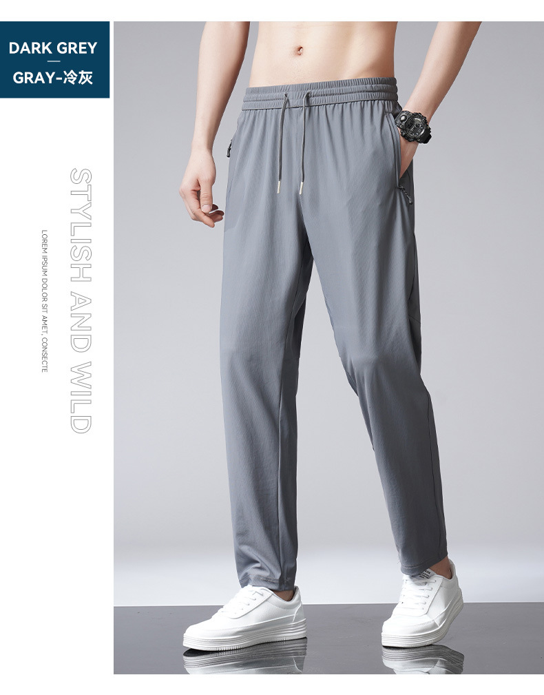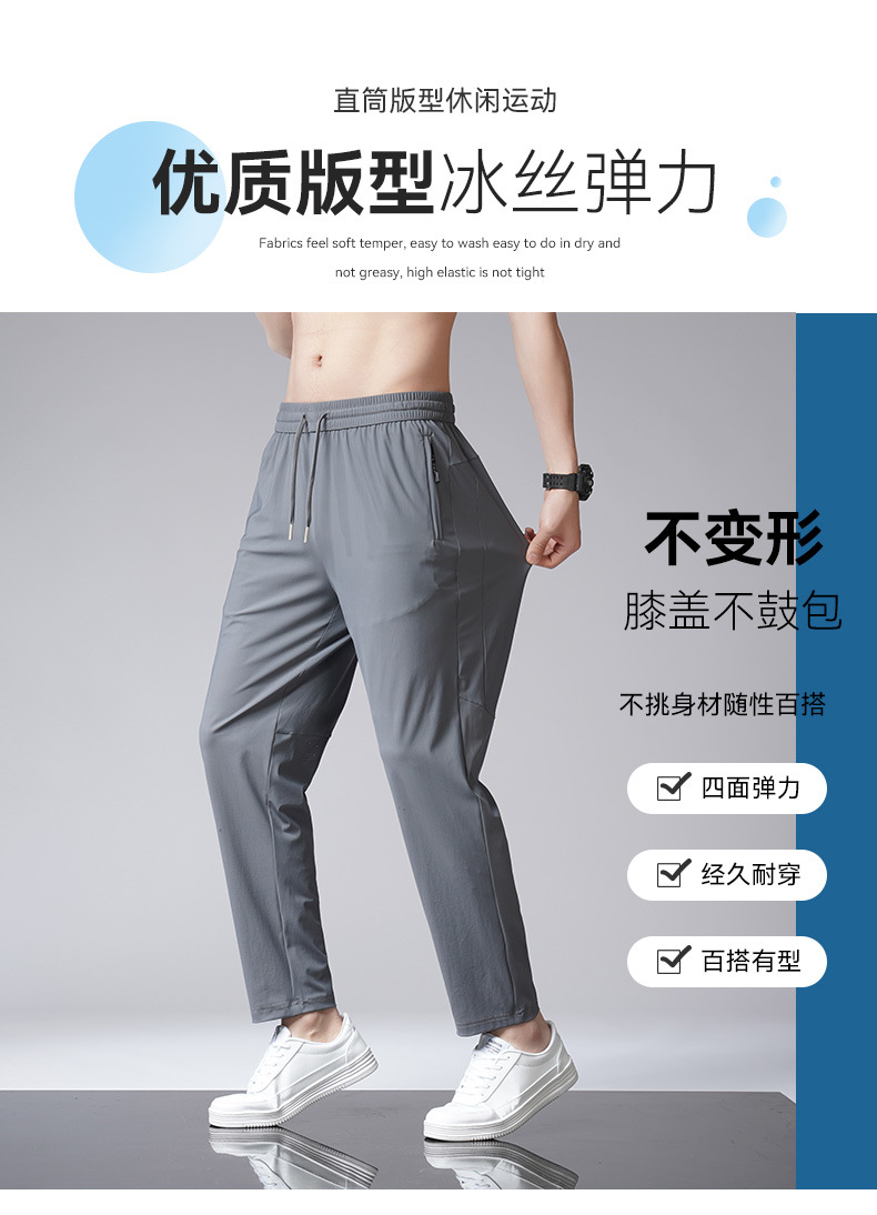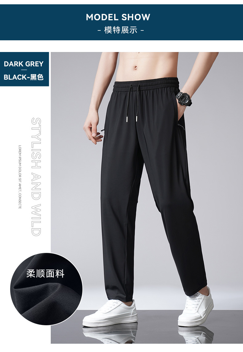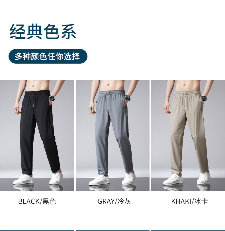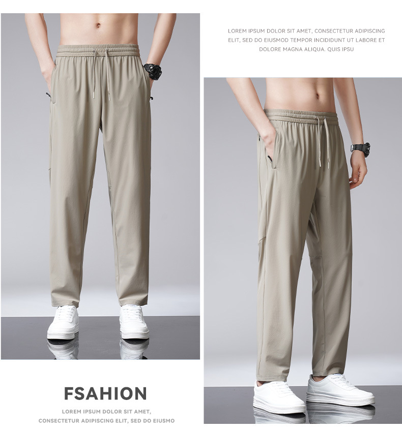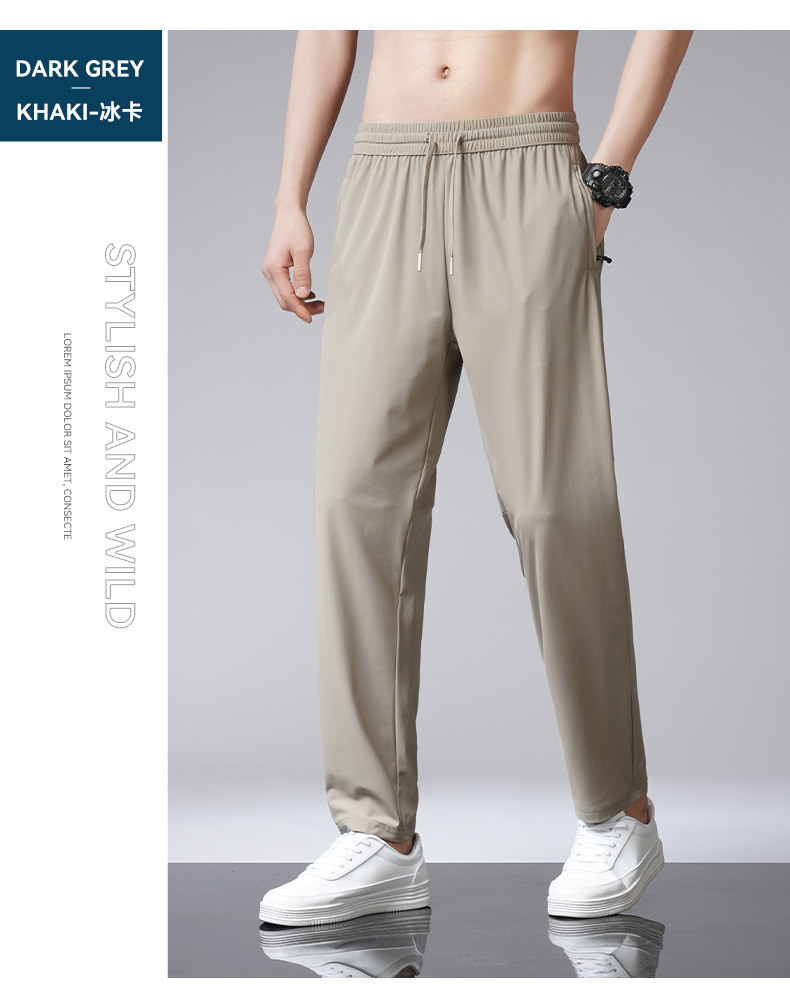 아이스 실크 바지 남자 여름 새로운 차가운 통기성 유두 스트레이트 캐주얼 바지 스트레치 탄성 허리 레이스 업 간단한 바지스토어 가기