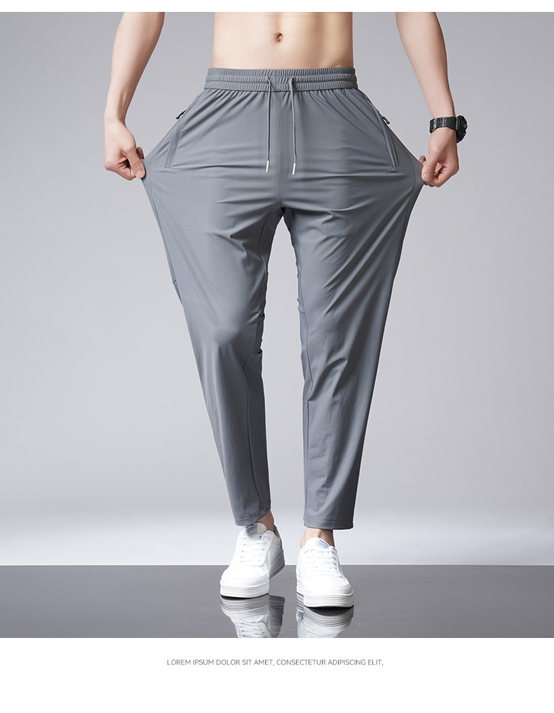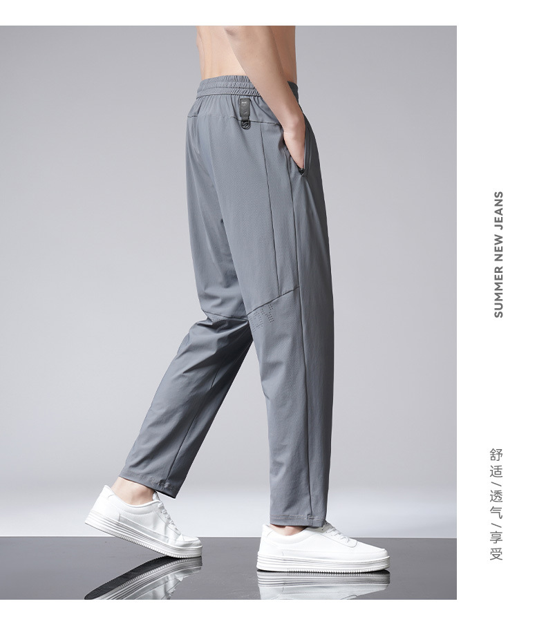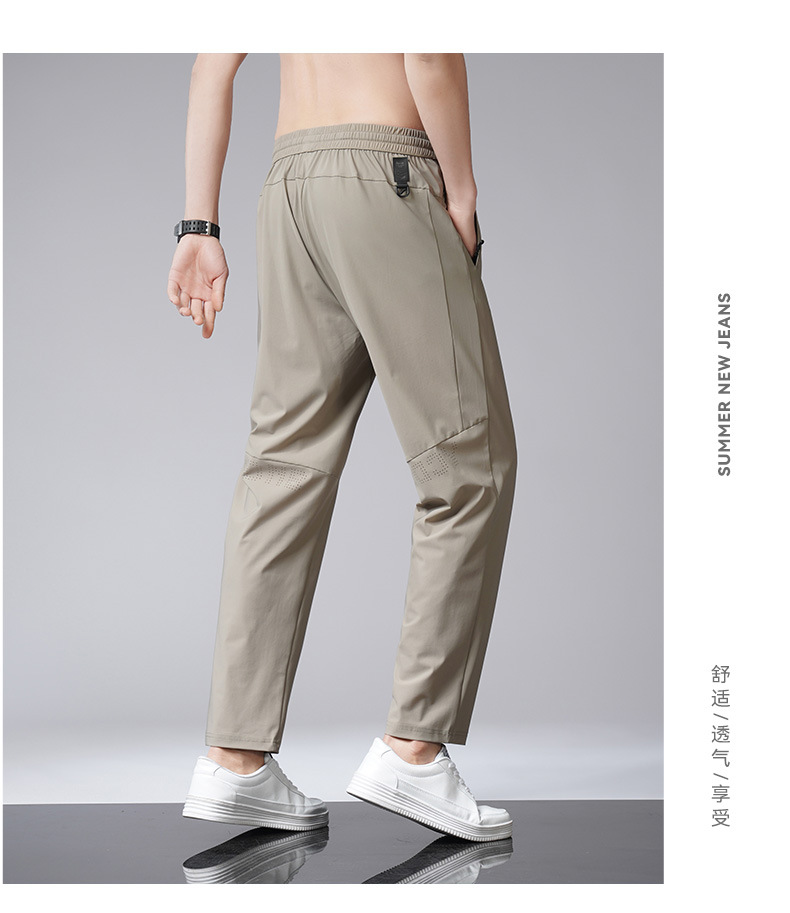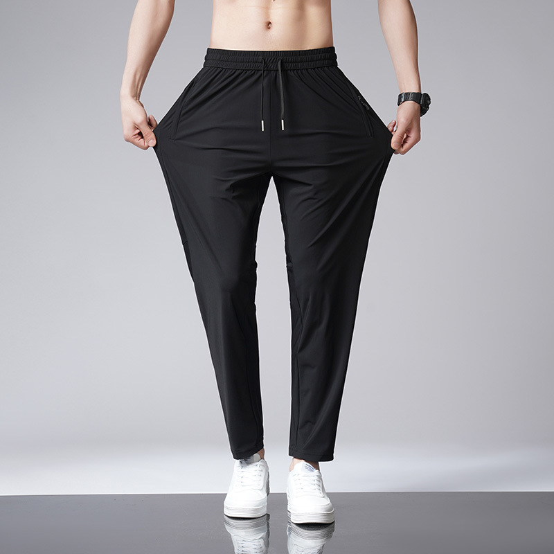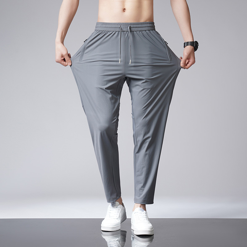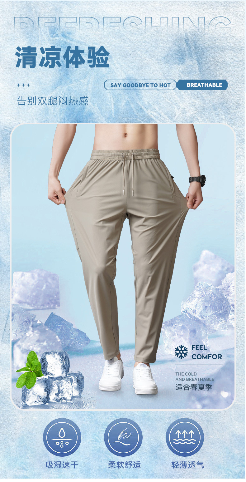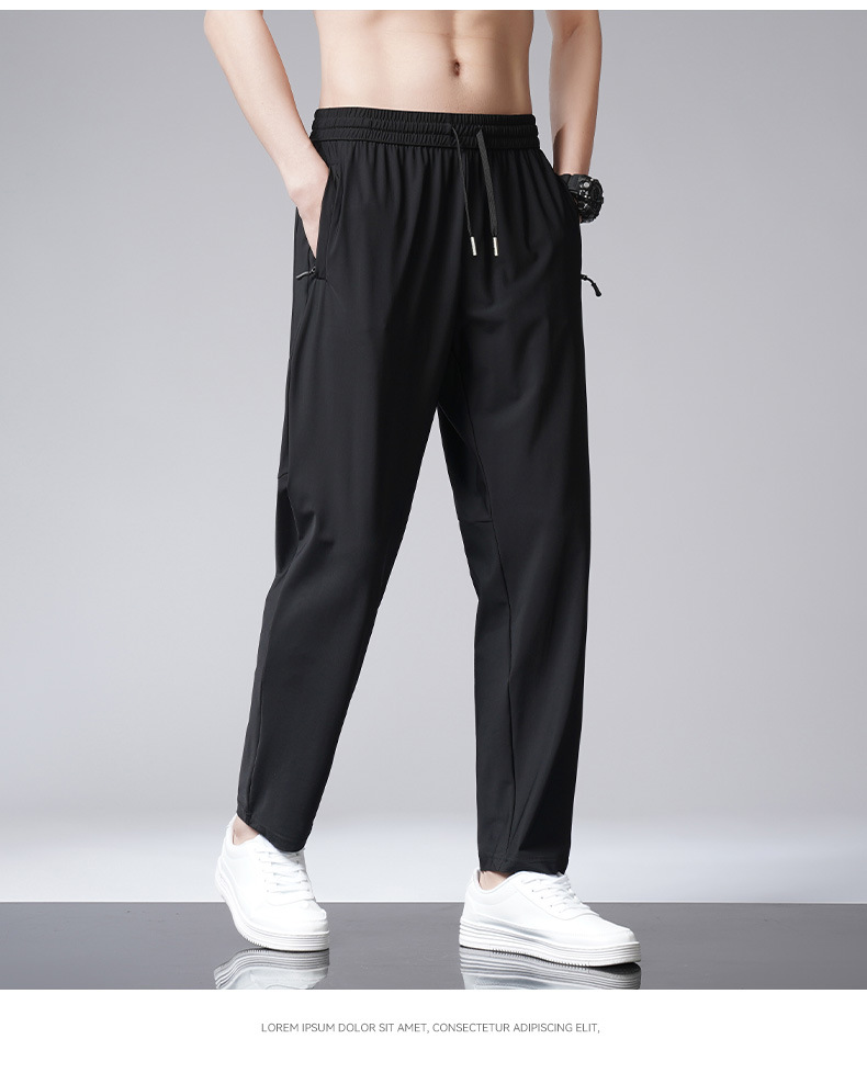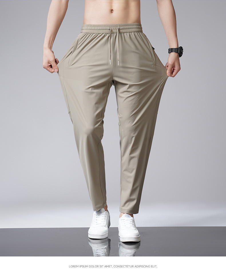 아이스 실크 바지 남자 여름 새로운 차가운 통기성 유두 스트레이트 캐주얼 바지 스트레치 탄성 허리 레이스 업 간단한 바지스토어 가기